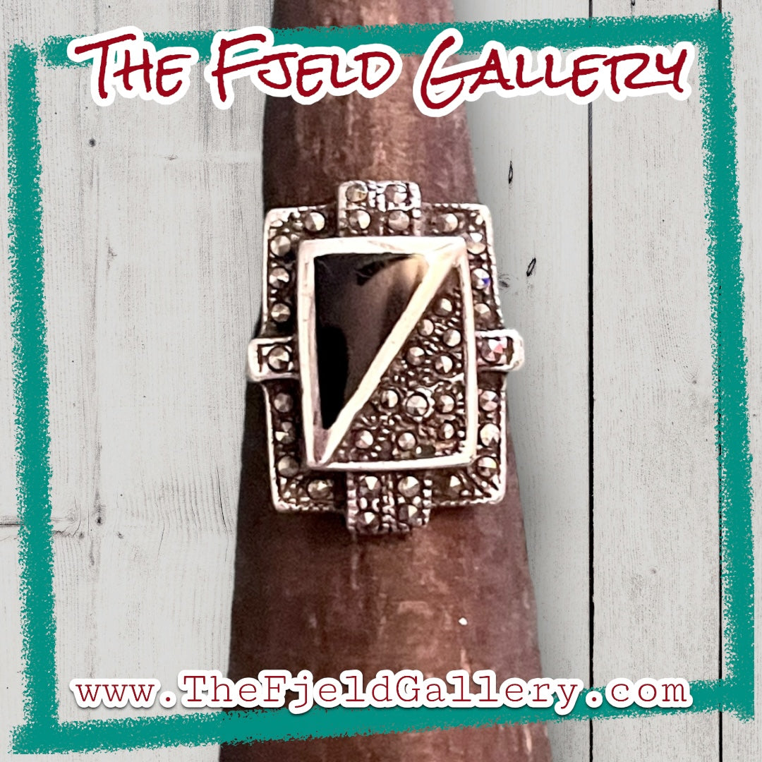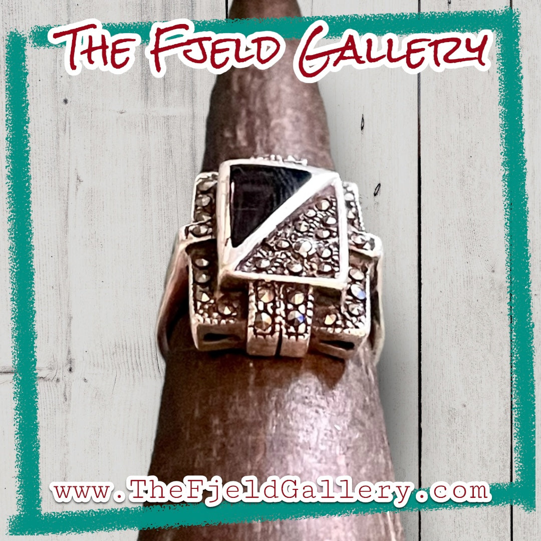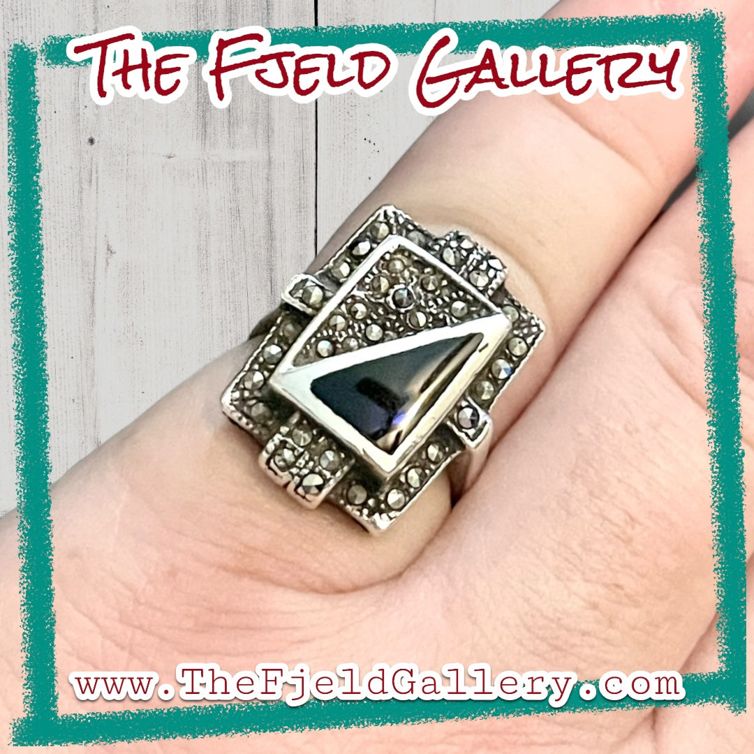 Art Deco Onyx & Marcasite Square Sterling Silver Geometric Ring