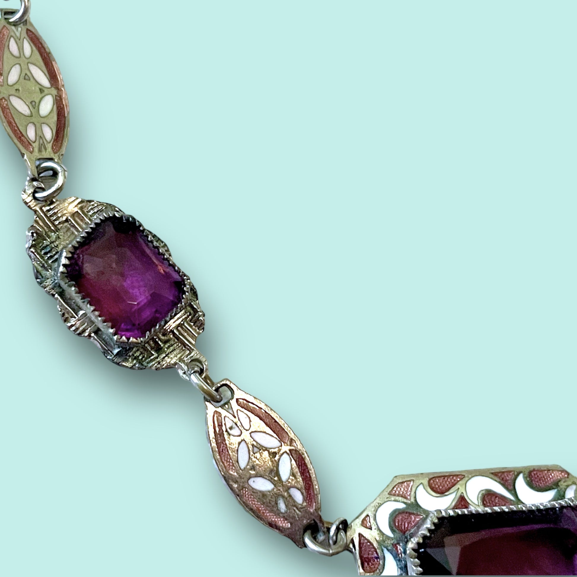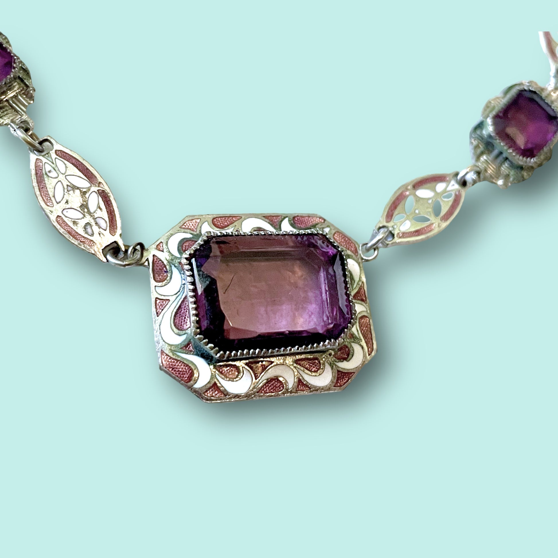 Gorgeous faceted amethyst purple Czech art glass open back and bezel set with a serrated bezel in a Rhodium plated silver. Has an Art Deco swirl wave design in a copper - pinkish & white cloisonné enamel. Additional links have an enamel floral design. Unique style silver chain with a secure spring ring closure. No hallmarks or stamps found. No damage or condition issues to note.