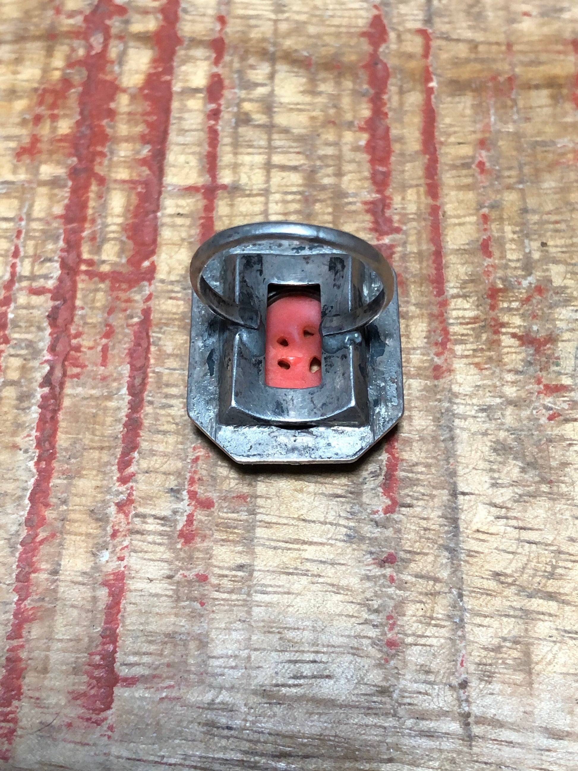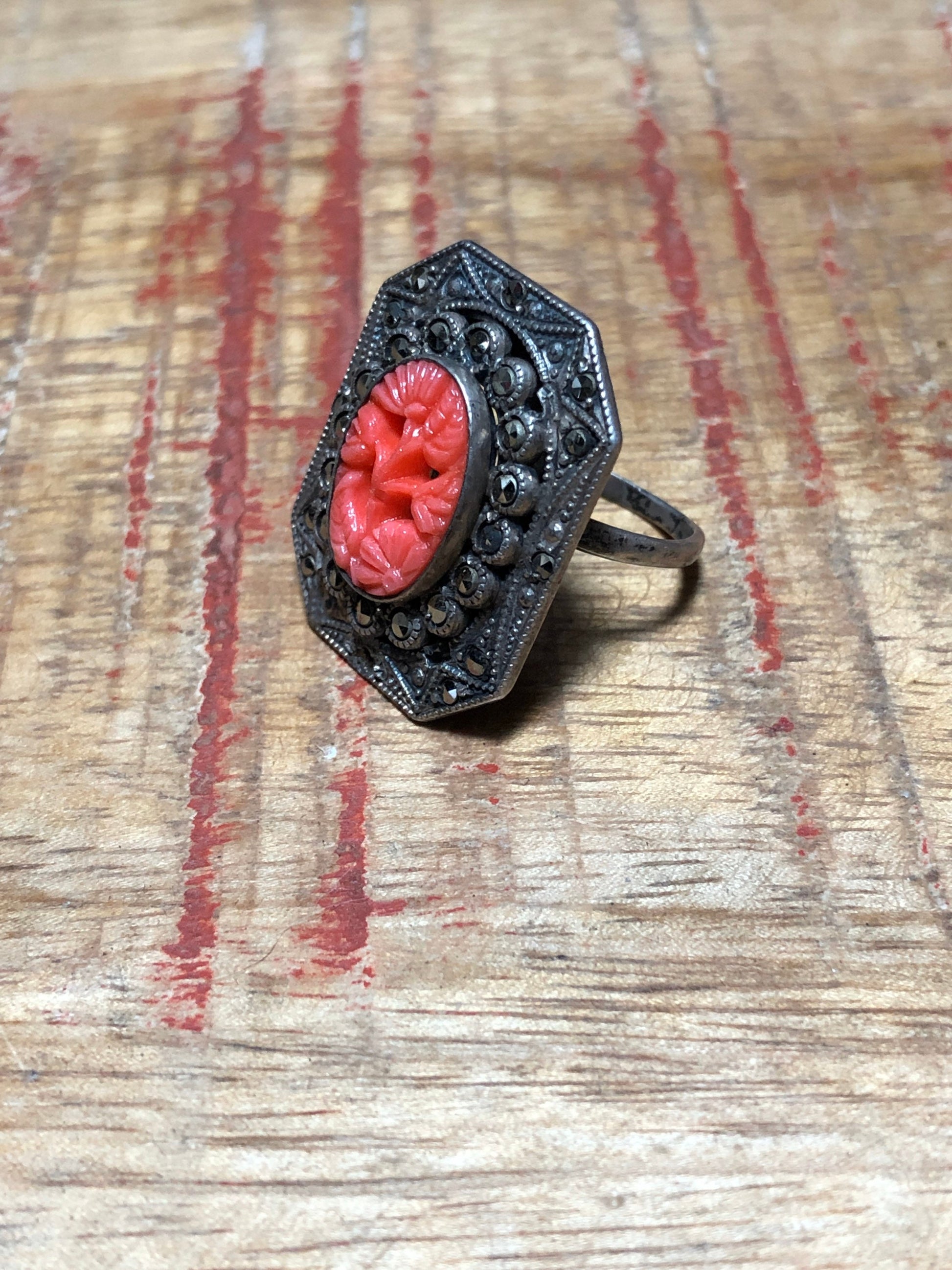 Art Deco Sterling & Marcasite Red Coral Art Glass Ring