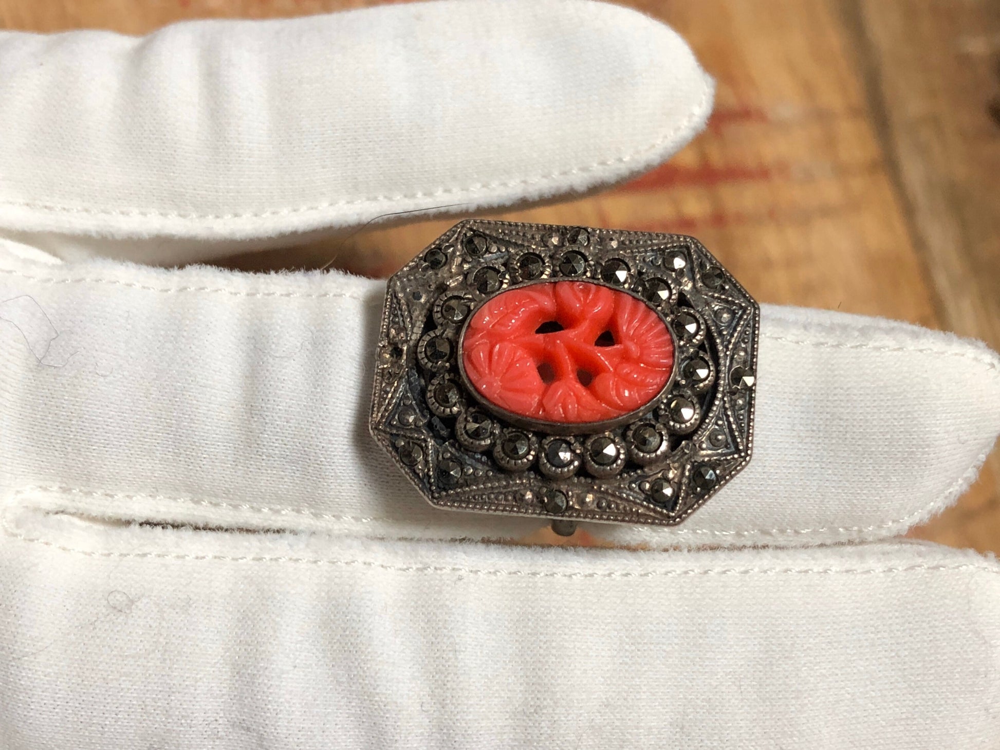 Art Deco sterling silver and marcasite setting with bezel set art glass faux carved coral. Pink orange coral is molded with openings and quite beautiful and delicate.
