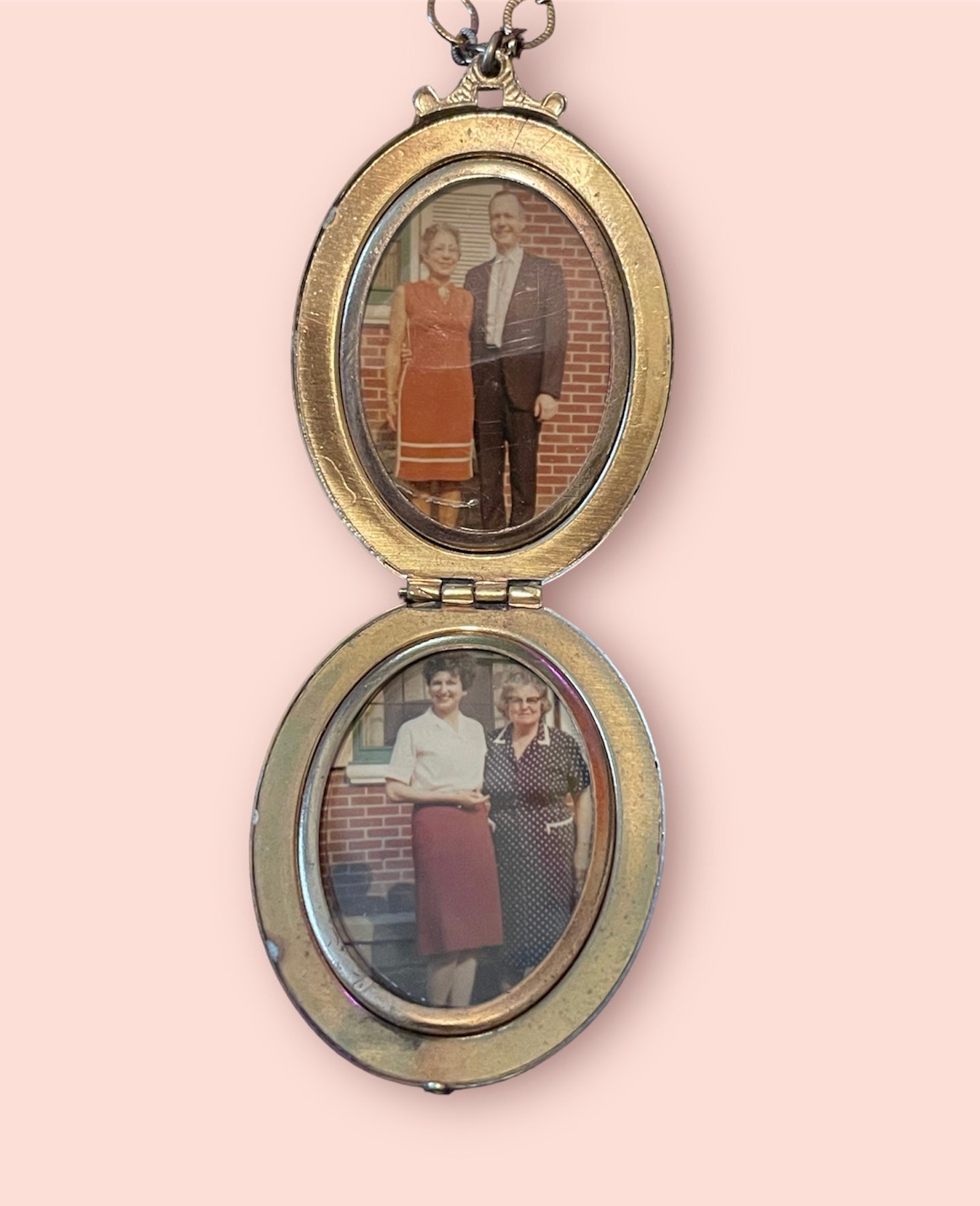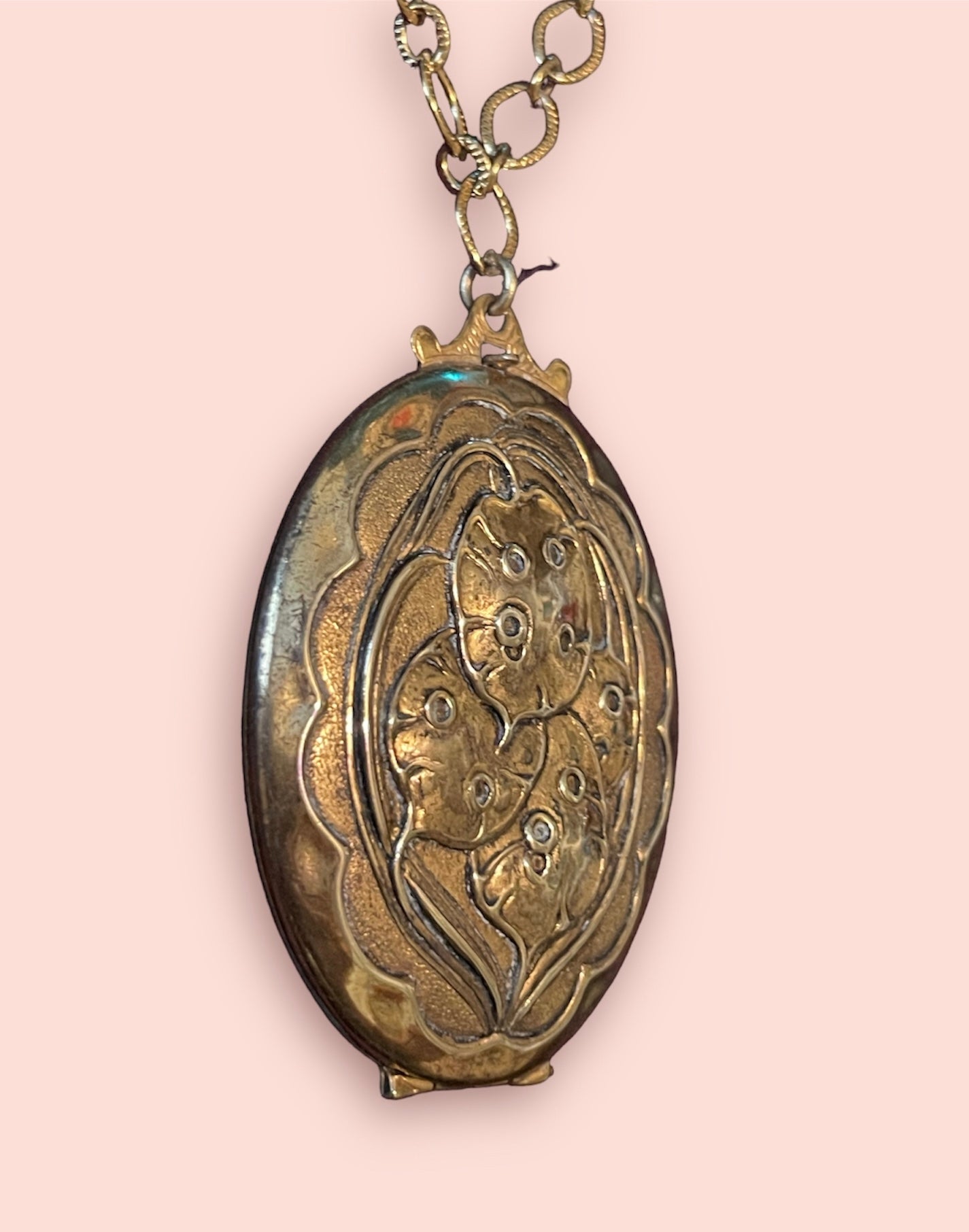 Beautiful large brass Art Nouveau picture locket. Floral leaves design opens from top.