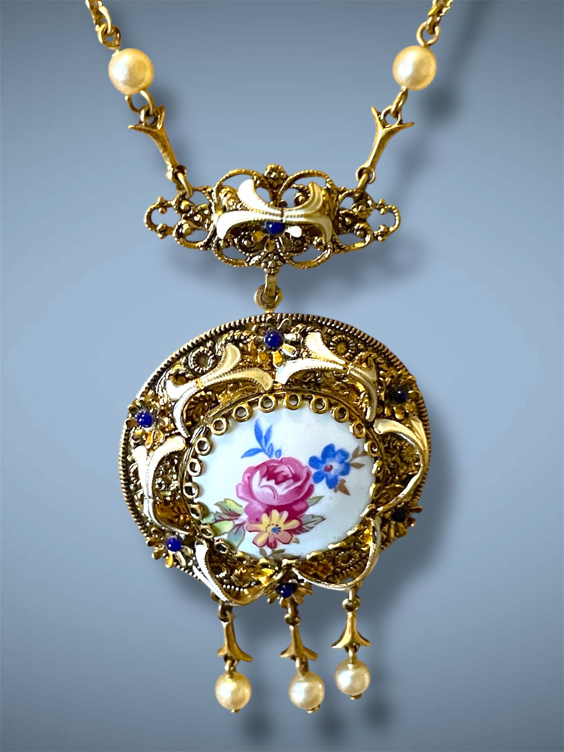 Art Nouveau Gilded Brass Filigree Porcelain Rose Floral Bouquet Limoge, Cloisonné Enamel & Blue Art Glass Necklace