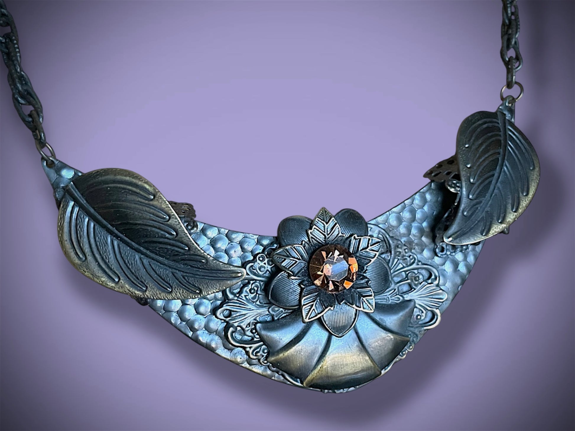 Eye-catching and gorgeous hand hammered brass chevron choker style necklace with Art Nouveau brass stamping flourish and flower design set with a large round faceted citrine yellow crystal.