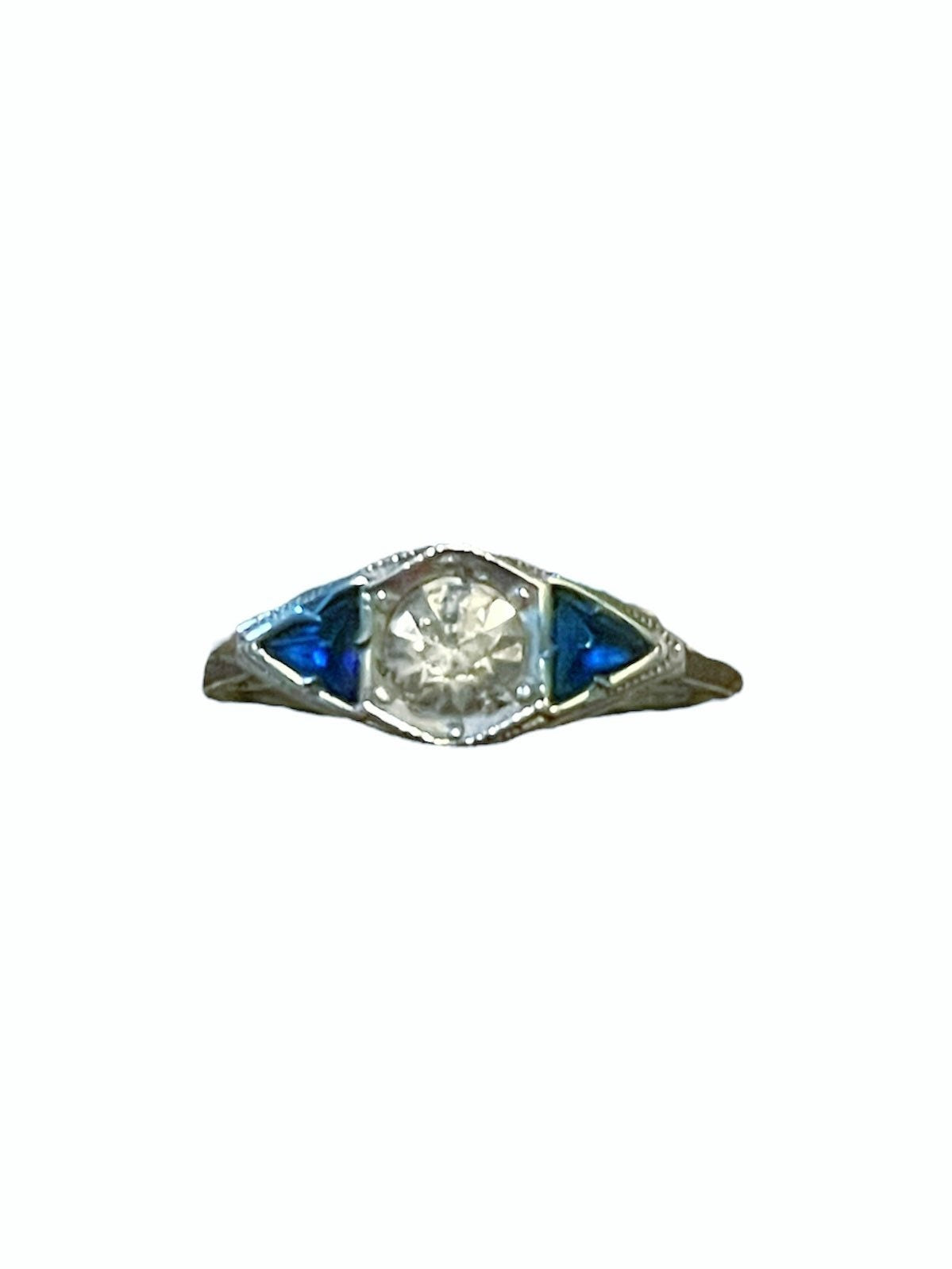 Gorgeous Art Deco channel set round faceted topaz with two trillion triangle faceted sapphires on either side.