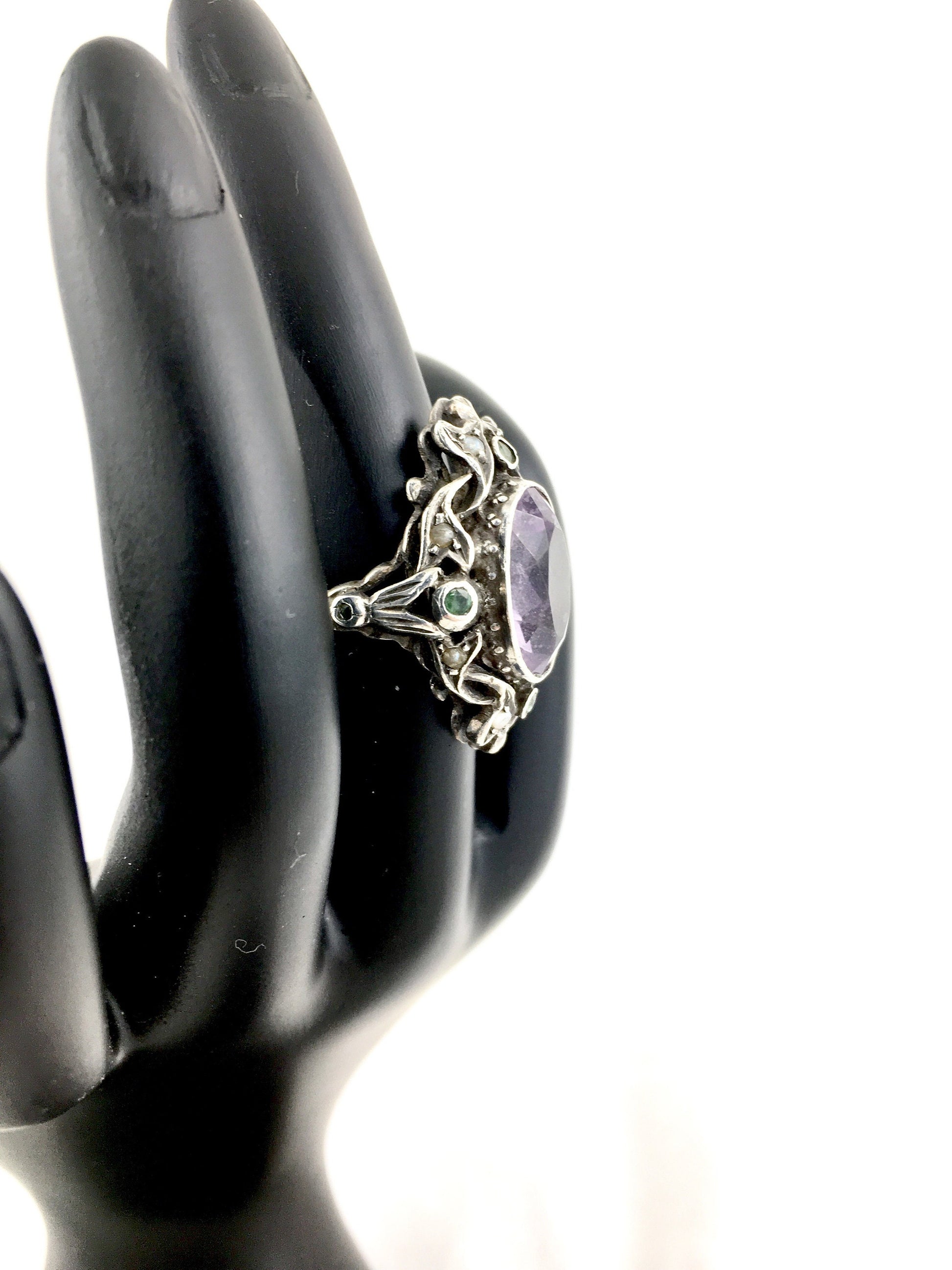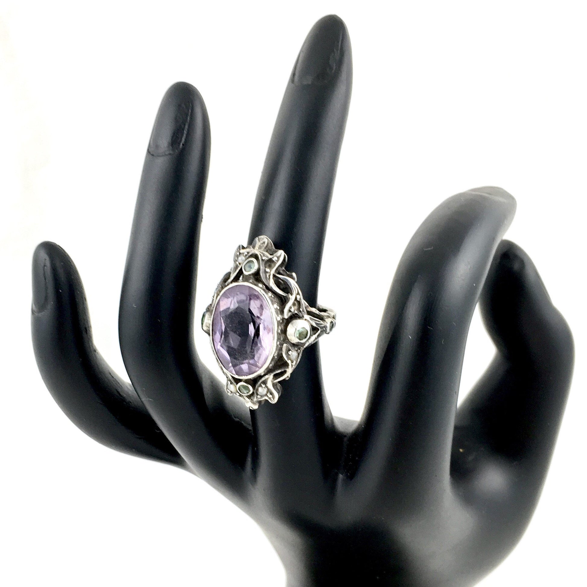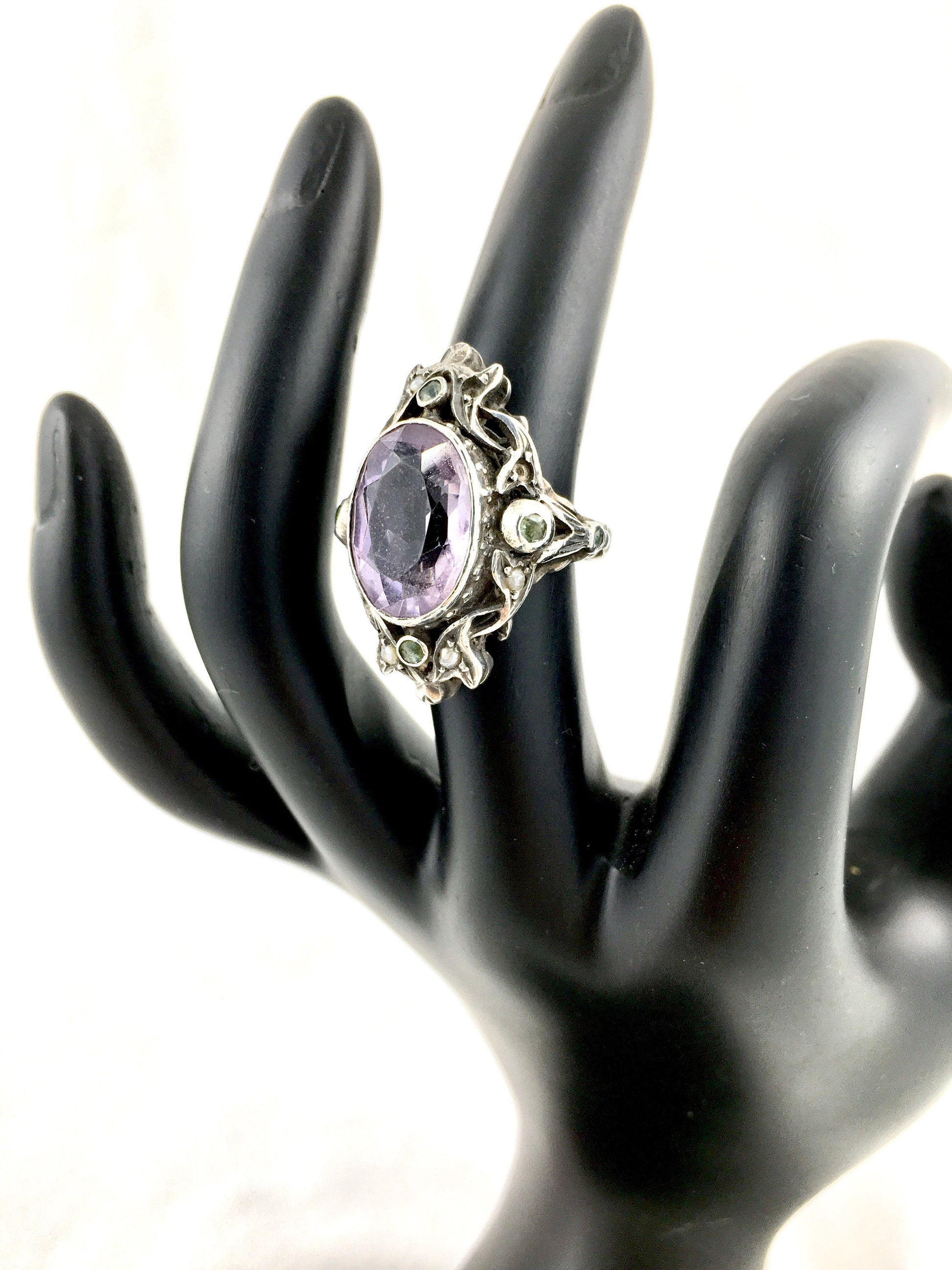 Art Nouveau Sterling Silver with Amethyst, Peridot & Seed Pearl Statement Ring c.1915