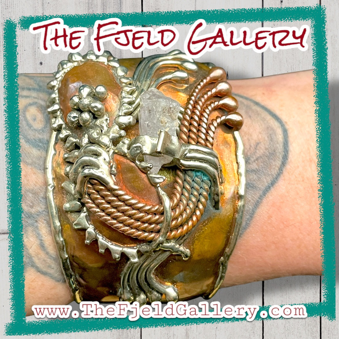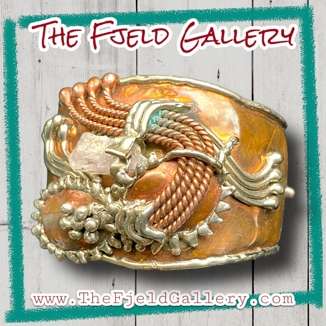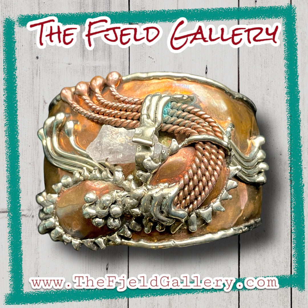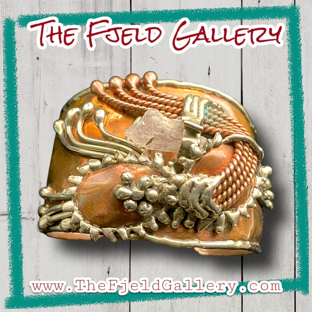 Arts & Crafts Brutalist Mixed Metal Copper & Brass Cuff w/ Quartz Crystal