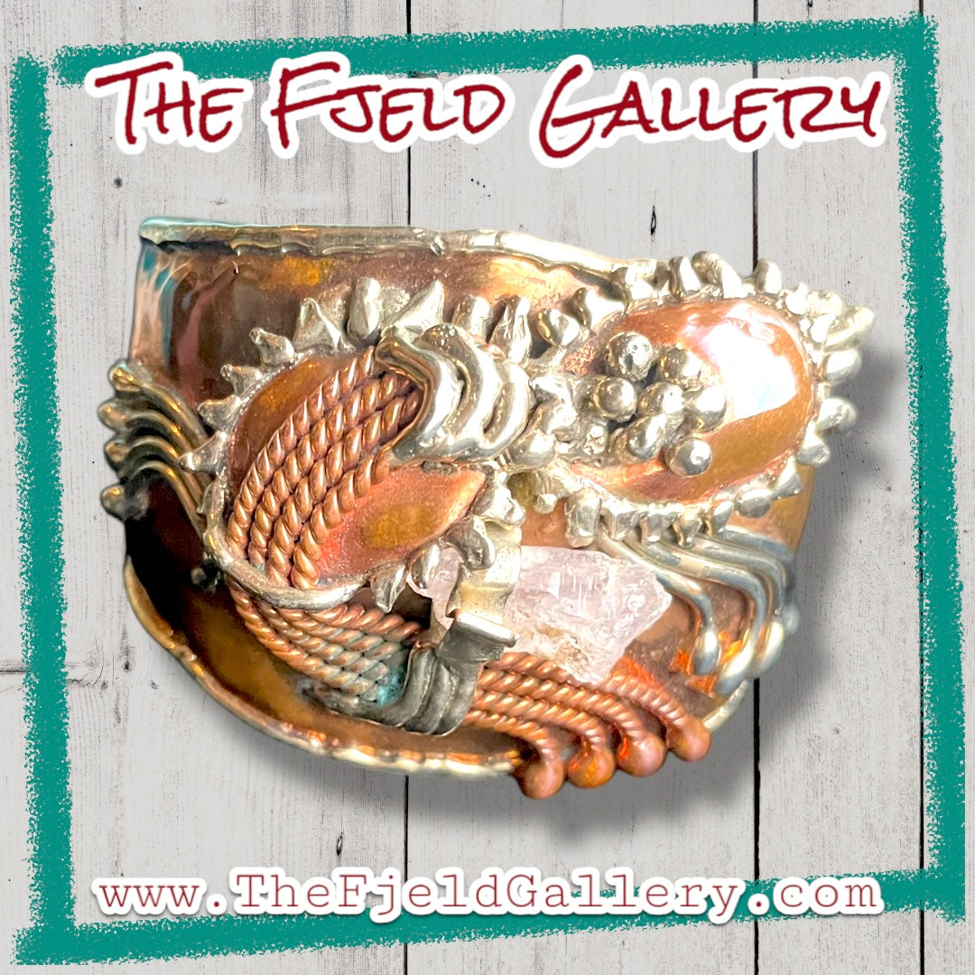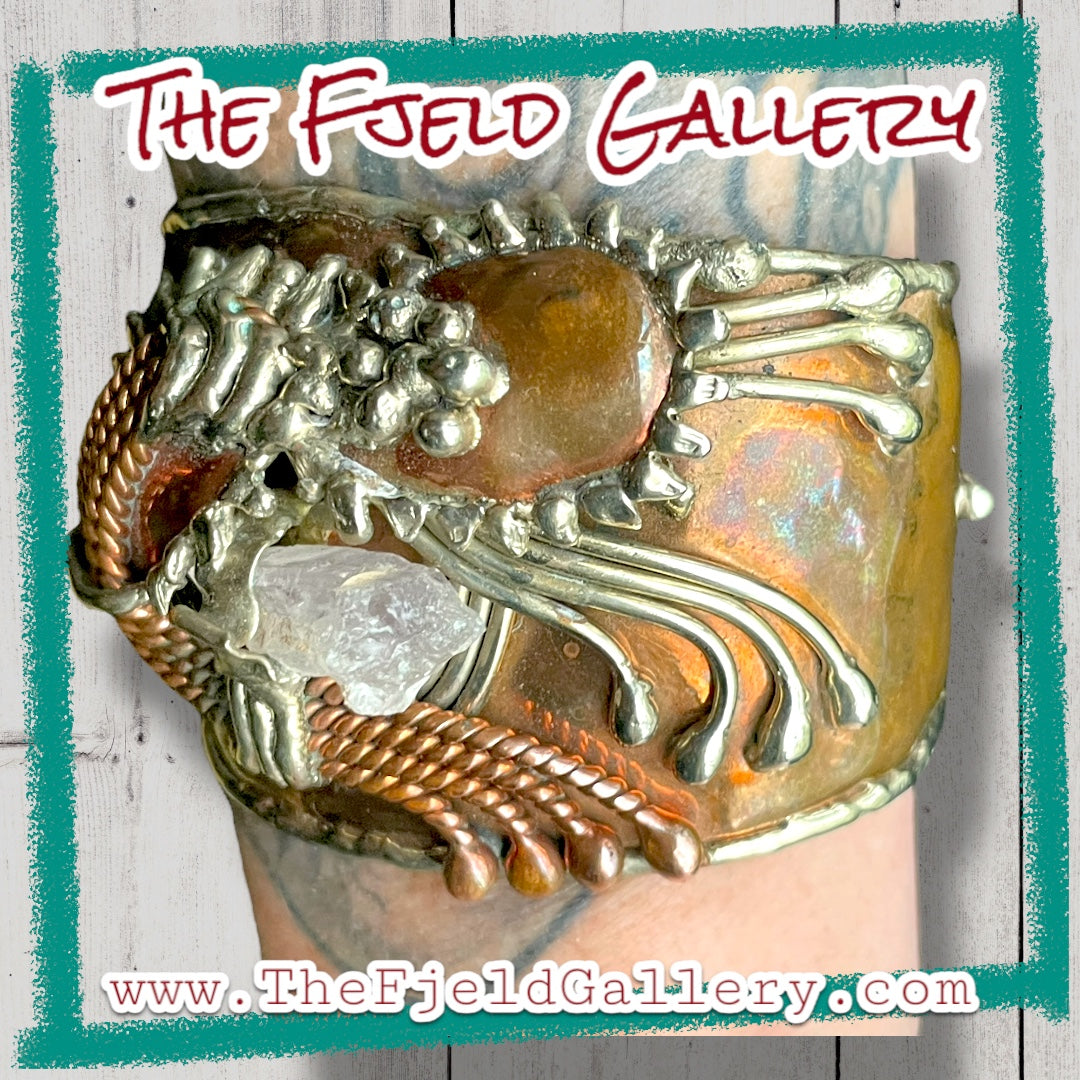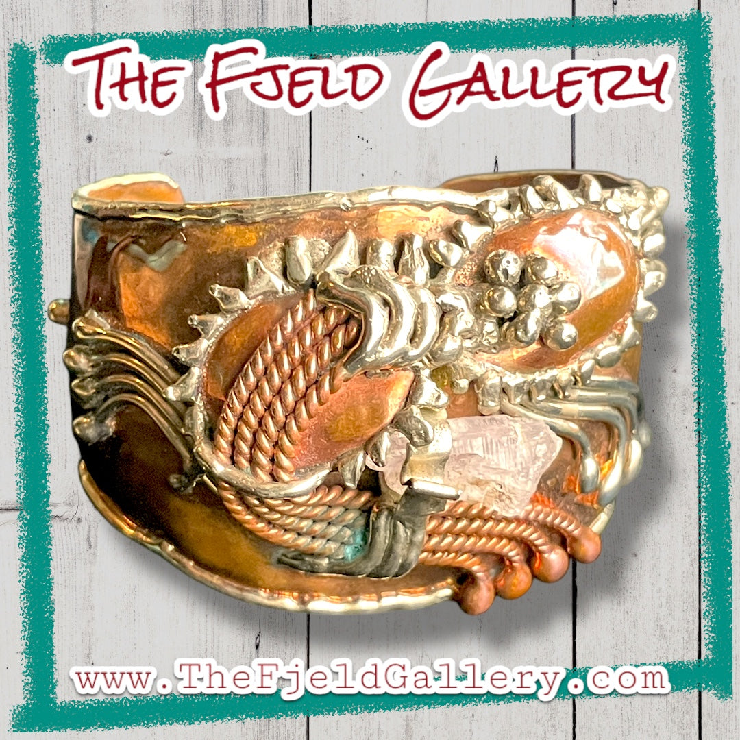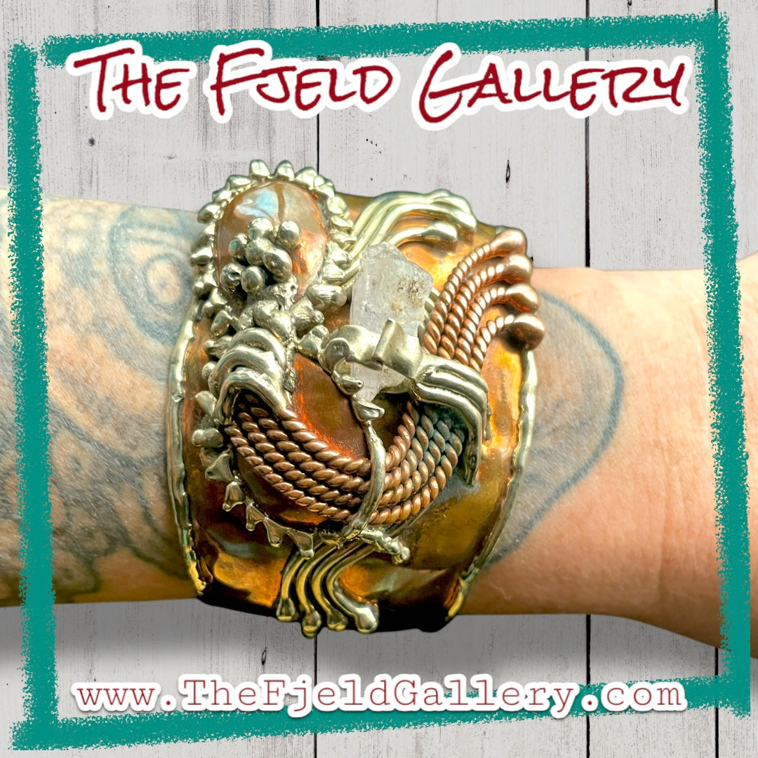 Arts & Crafts Brutalist Mixed Metal Copper & Brass Cuff w/ Quartz Crystal