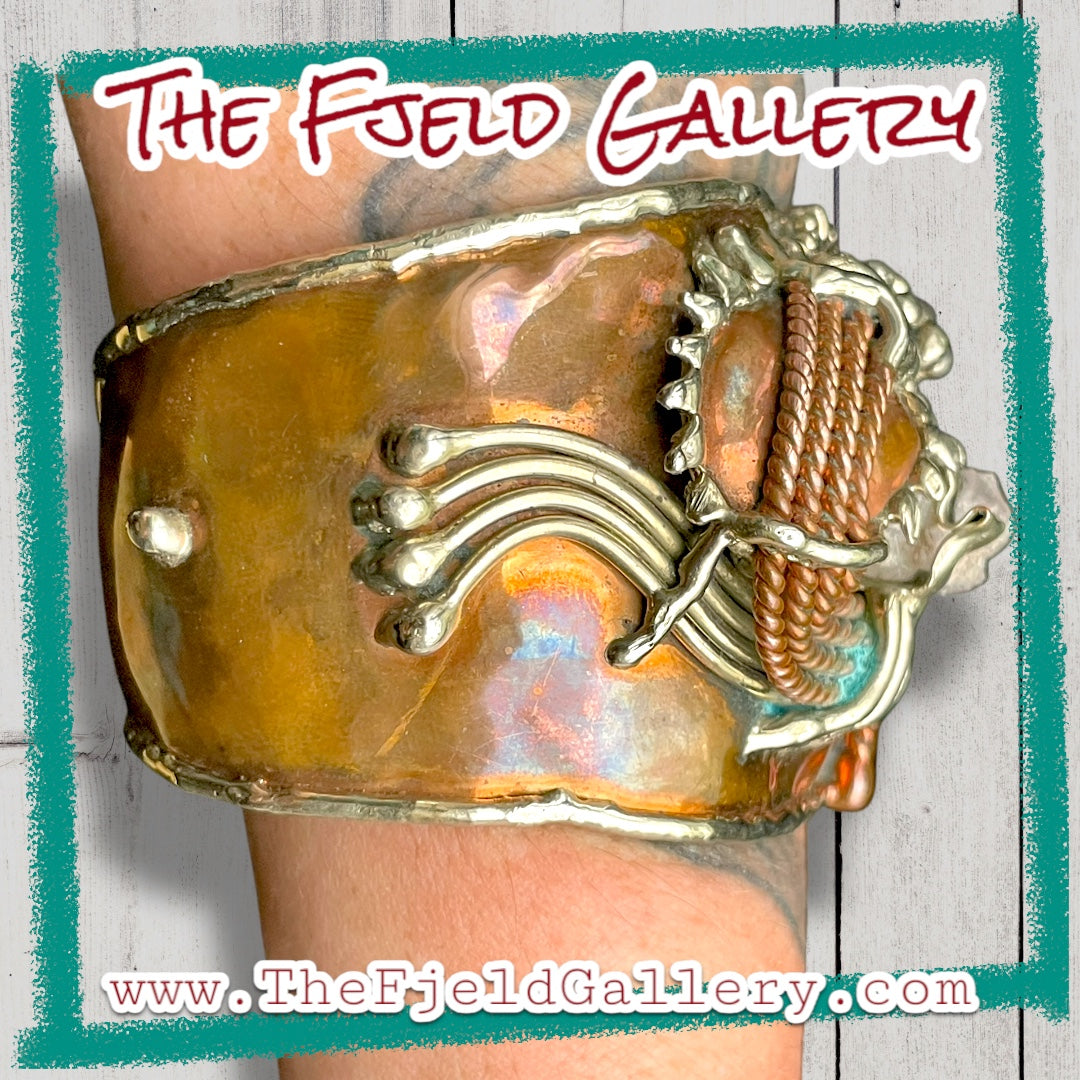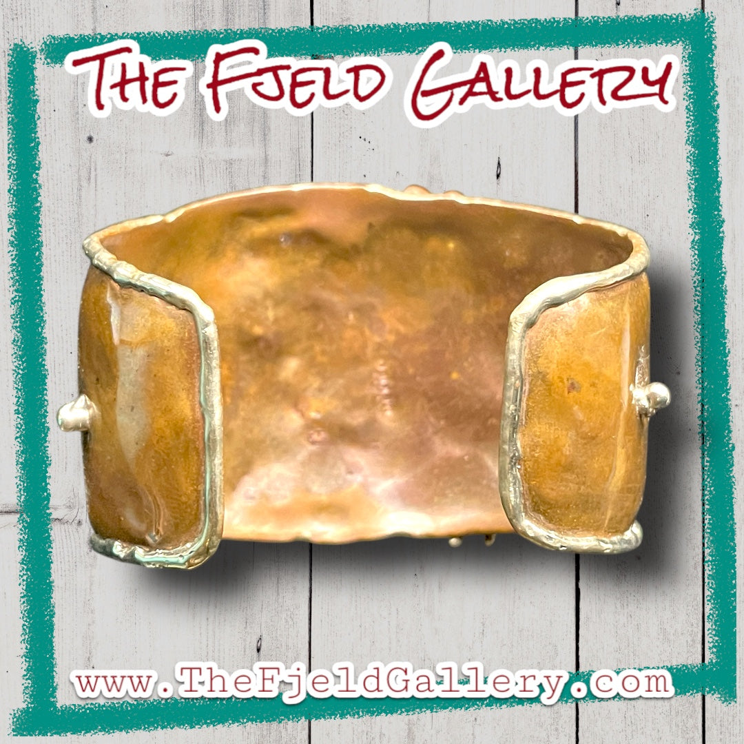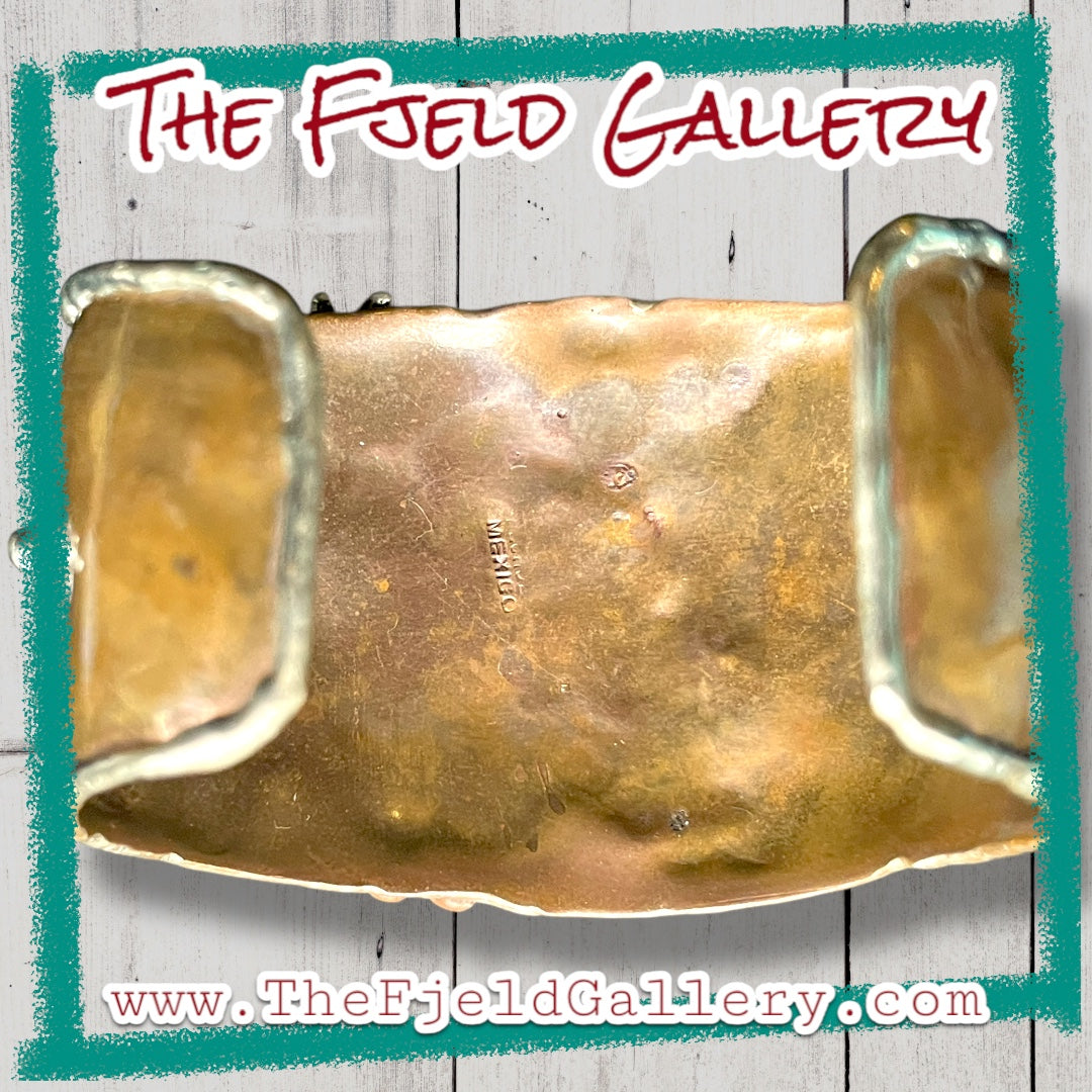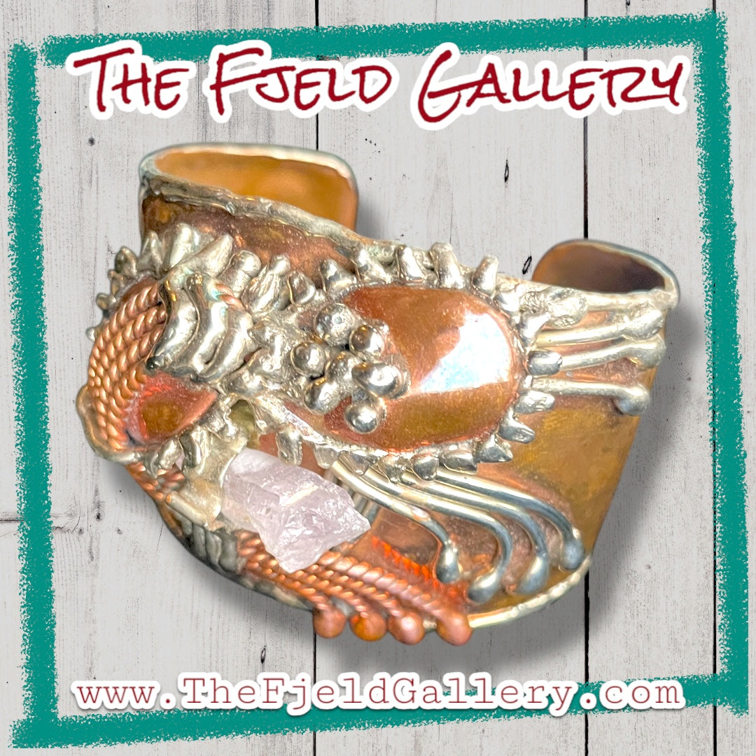 Arts & Crafts Brutalist Mixed Metal Copper & Brass Cuff w/ Quartz Crystal