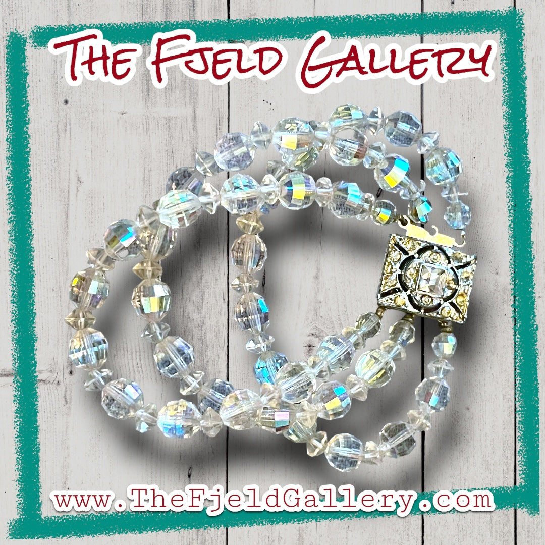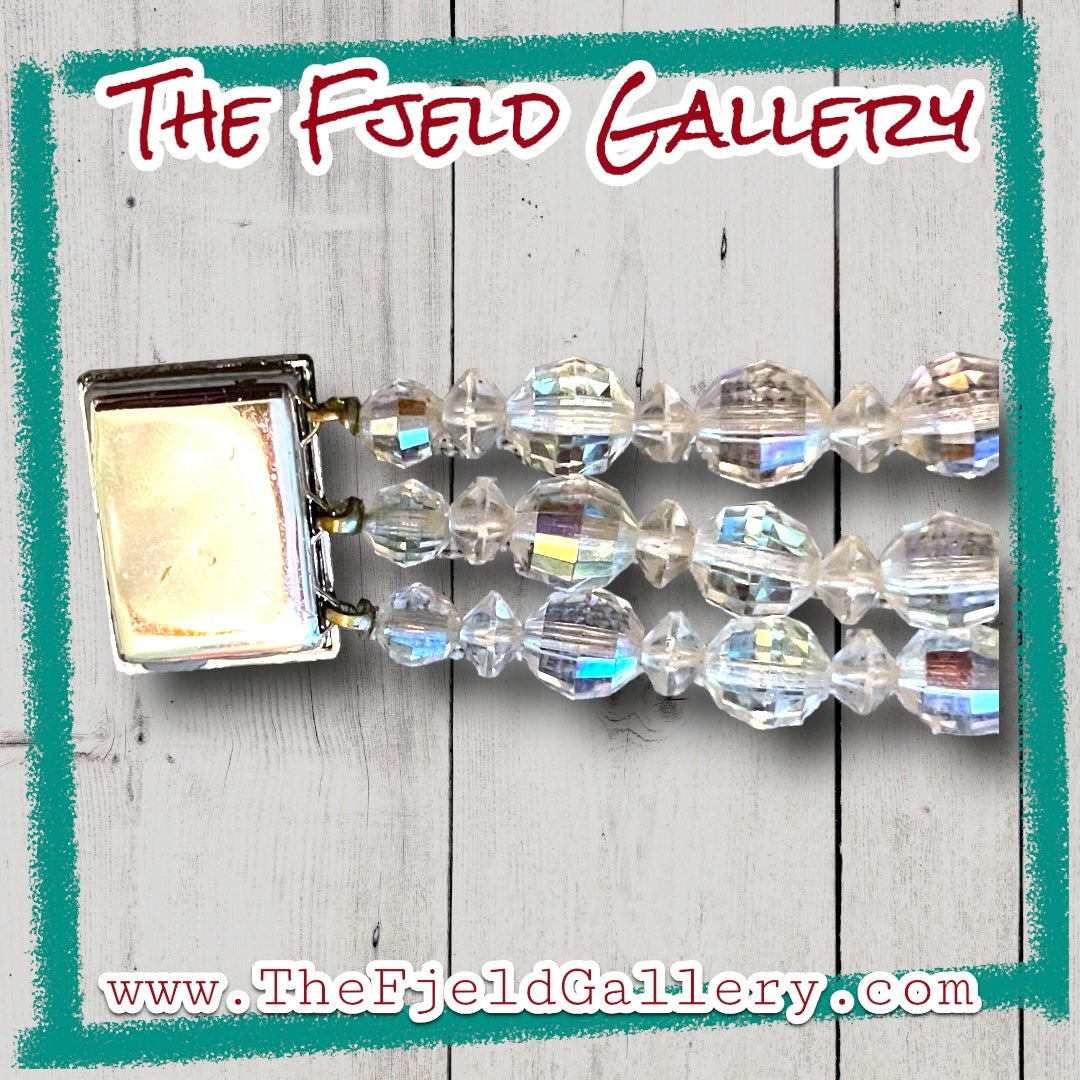1950’s Hollywood Regency 3-strand faceted aurora borealis crystal bead bracelet with a crystal rhinestone 3 strand connecting box clasp.