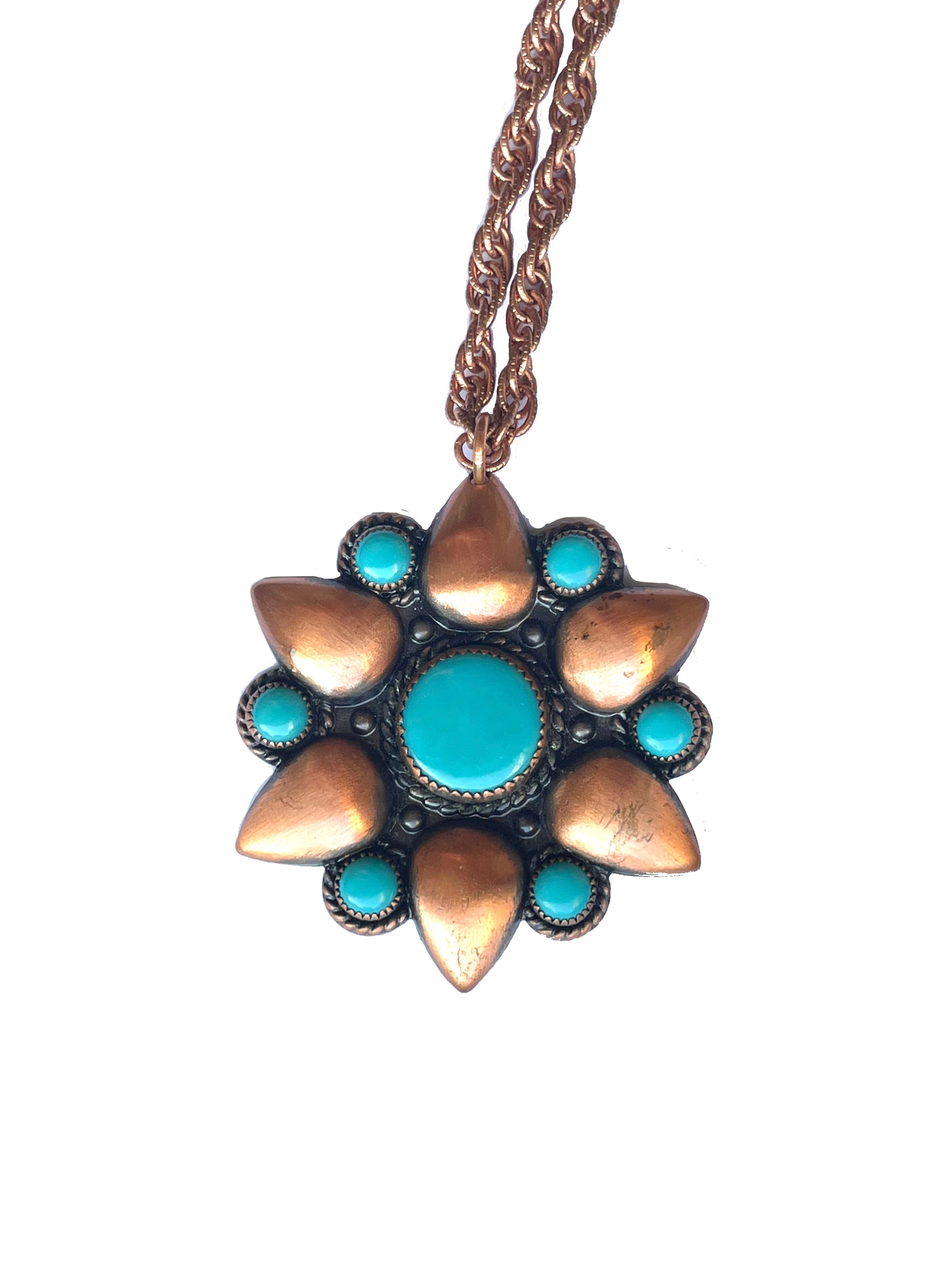 Bell Copper Sunburst Necklace with Faux Turquoise Cabochons c.1940