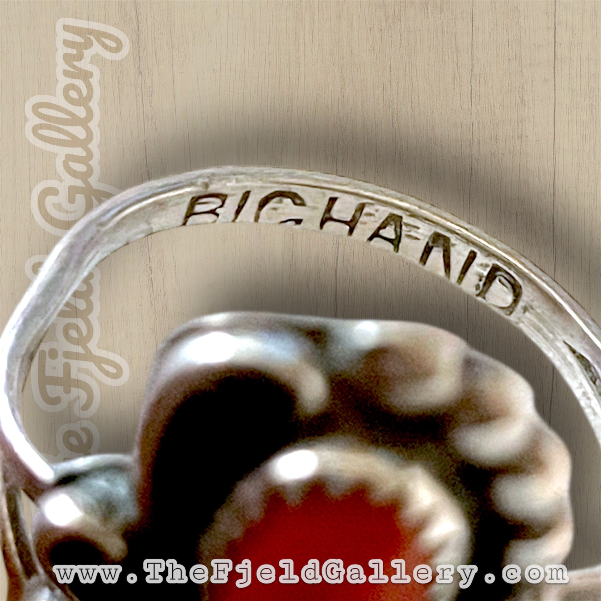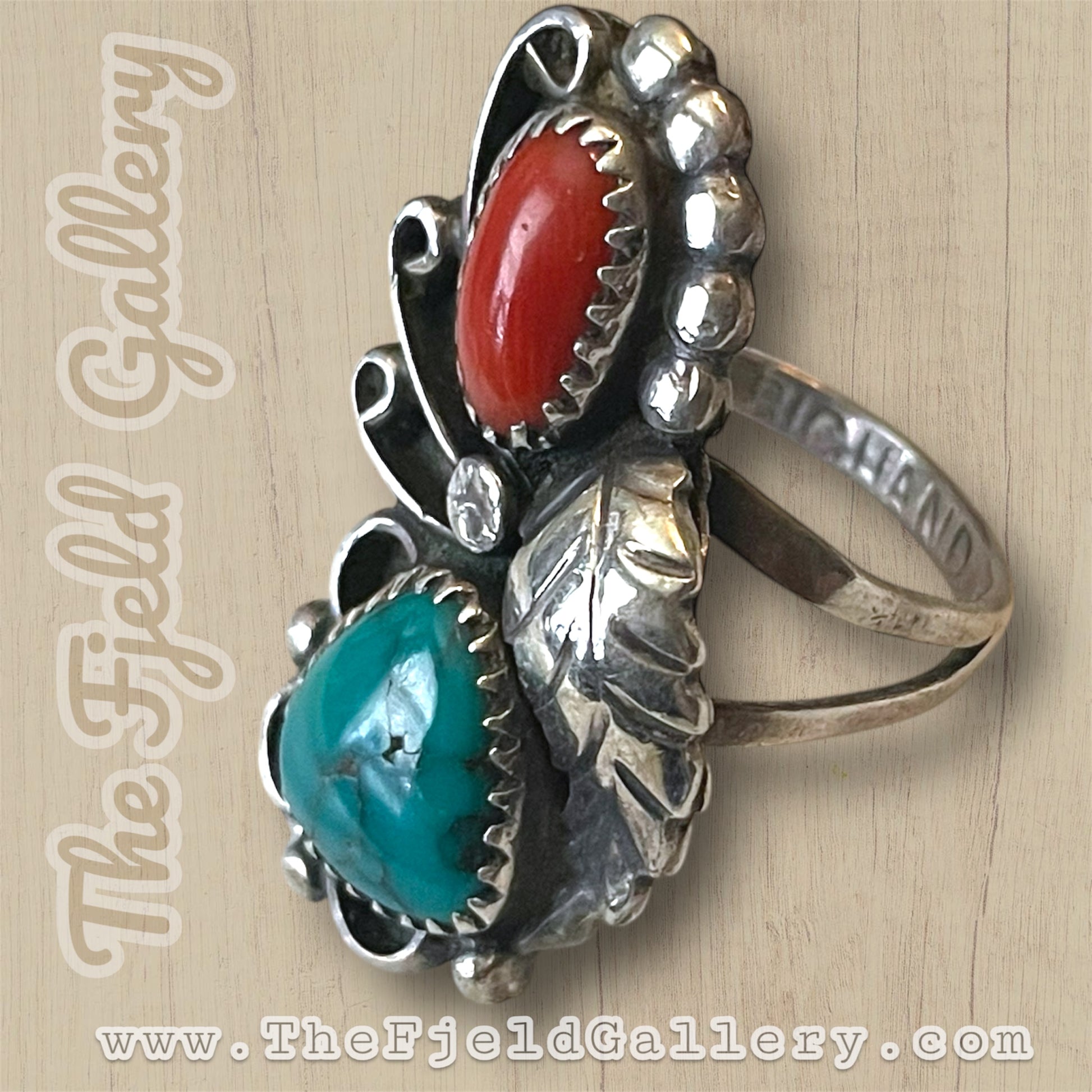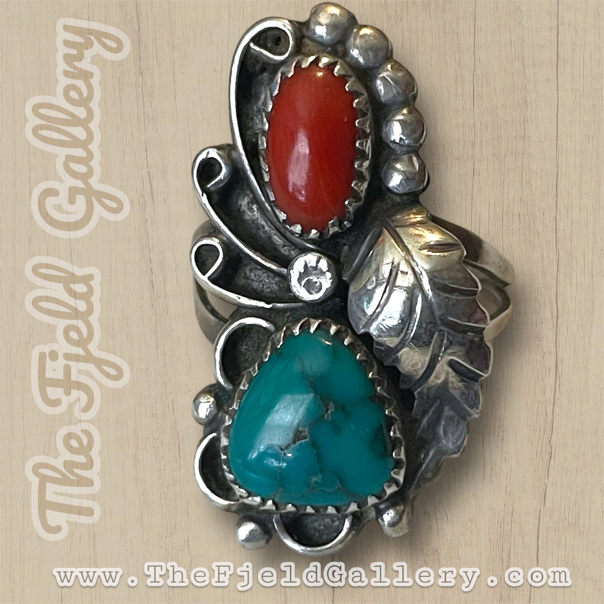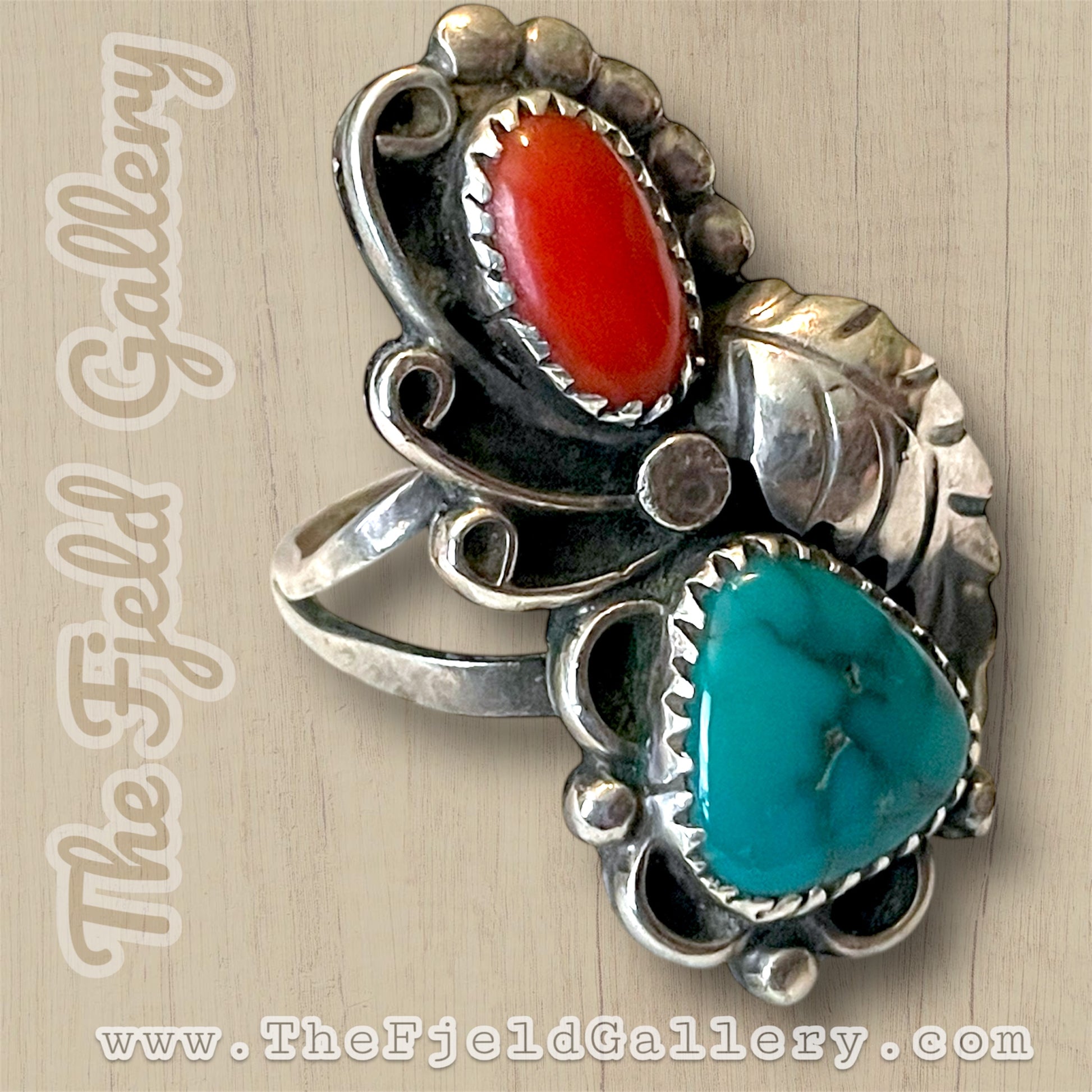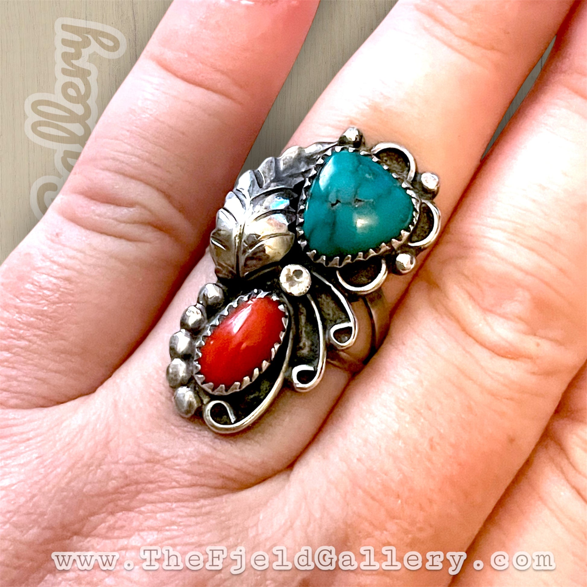 Beautiful large double stone ring. Native American hallmarked “Big Hand” on the sterling silver band. Bezel set large turquoise and red coral gemstones. Surrounded by leaf, raindrop and swirling detail.