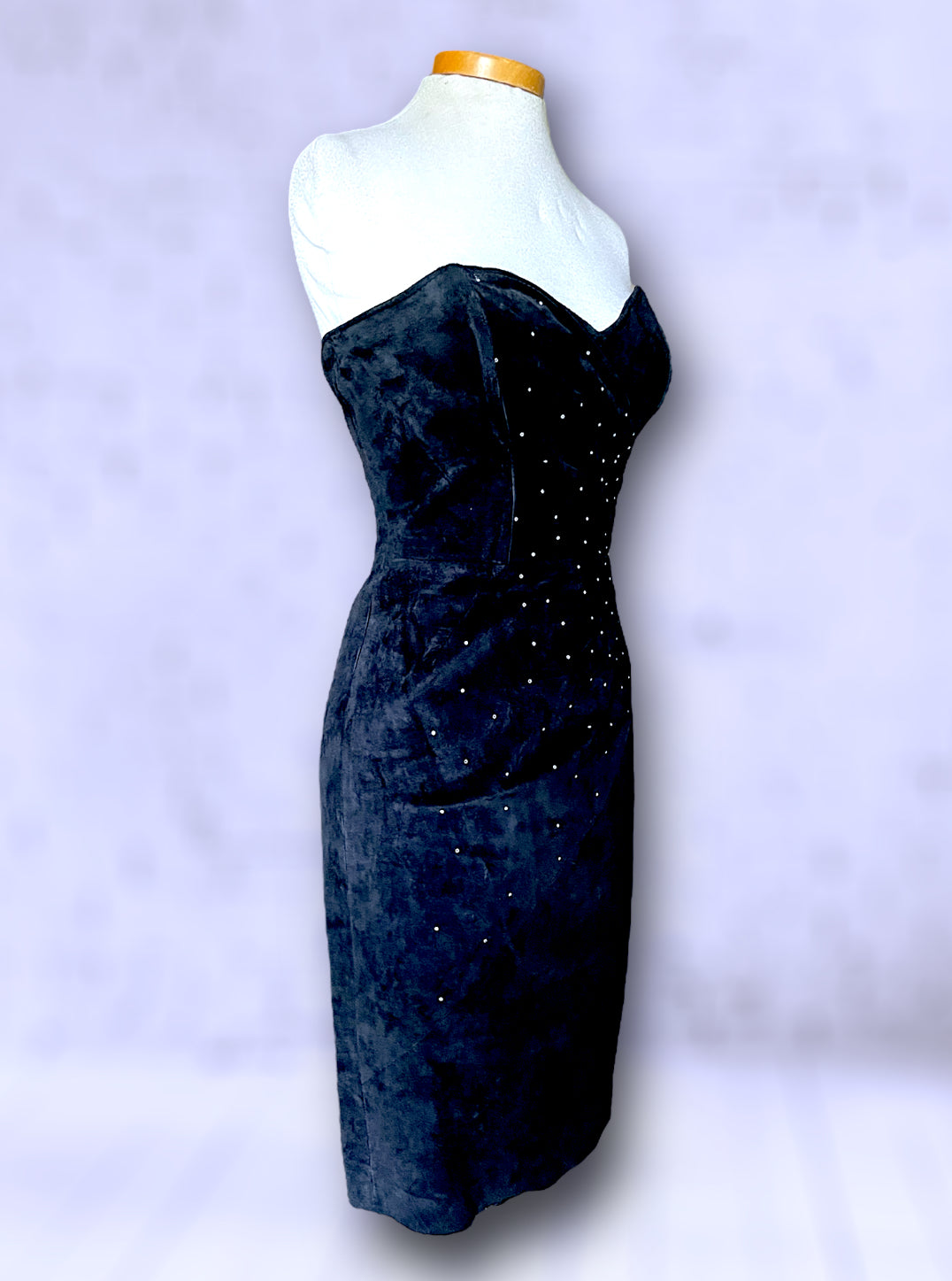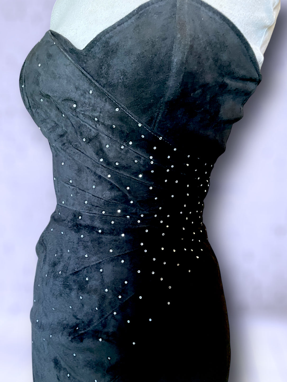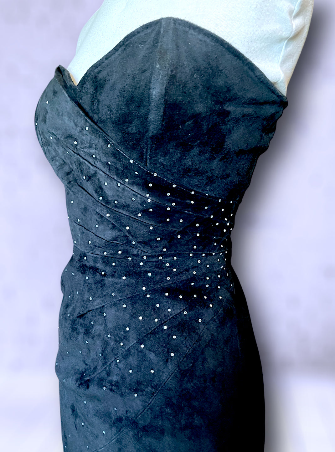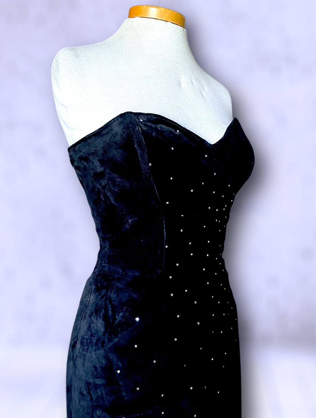 Vintage 1980’s Black Suede Leather Strapless Mini Dress with Crystal Detail