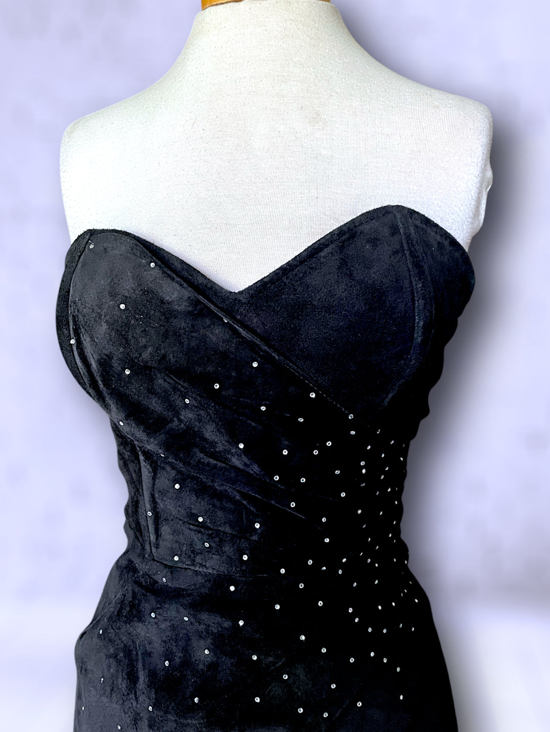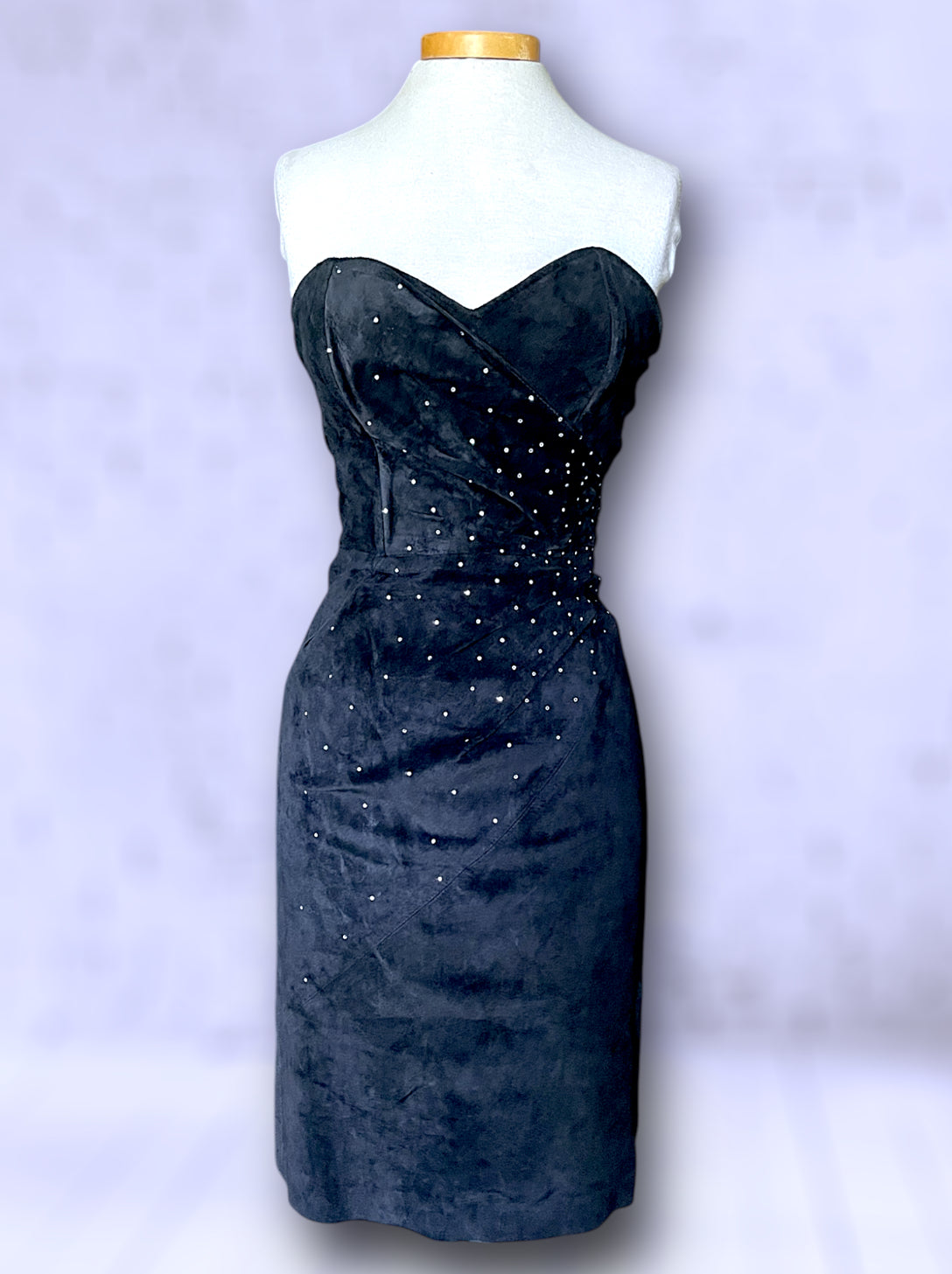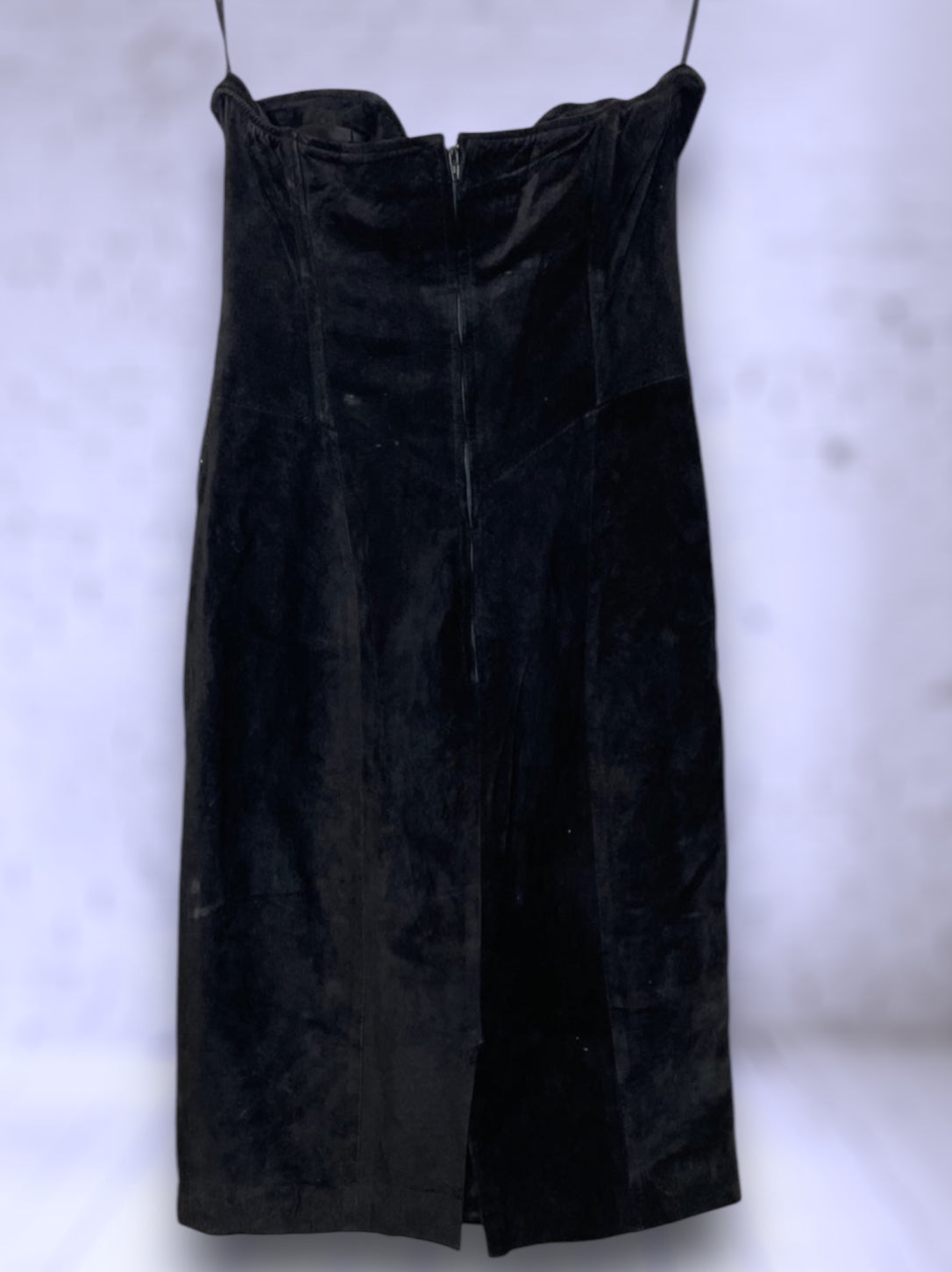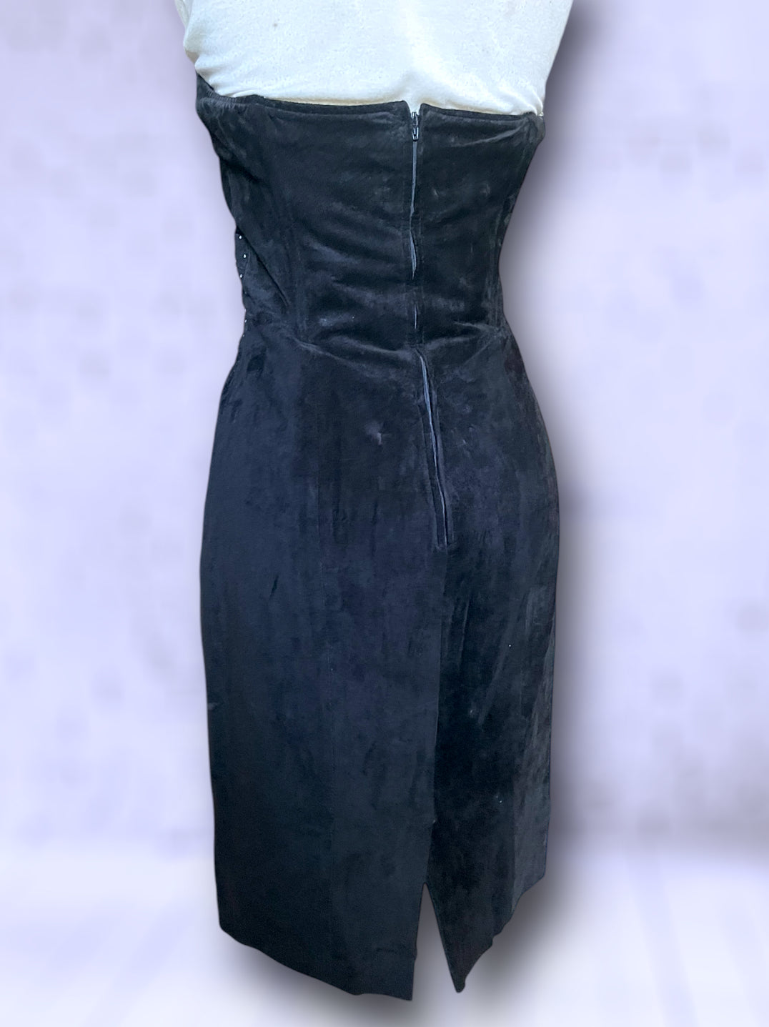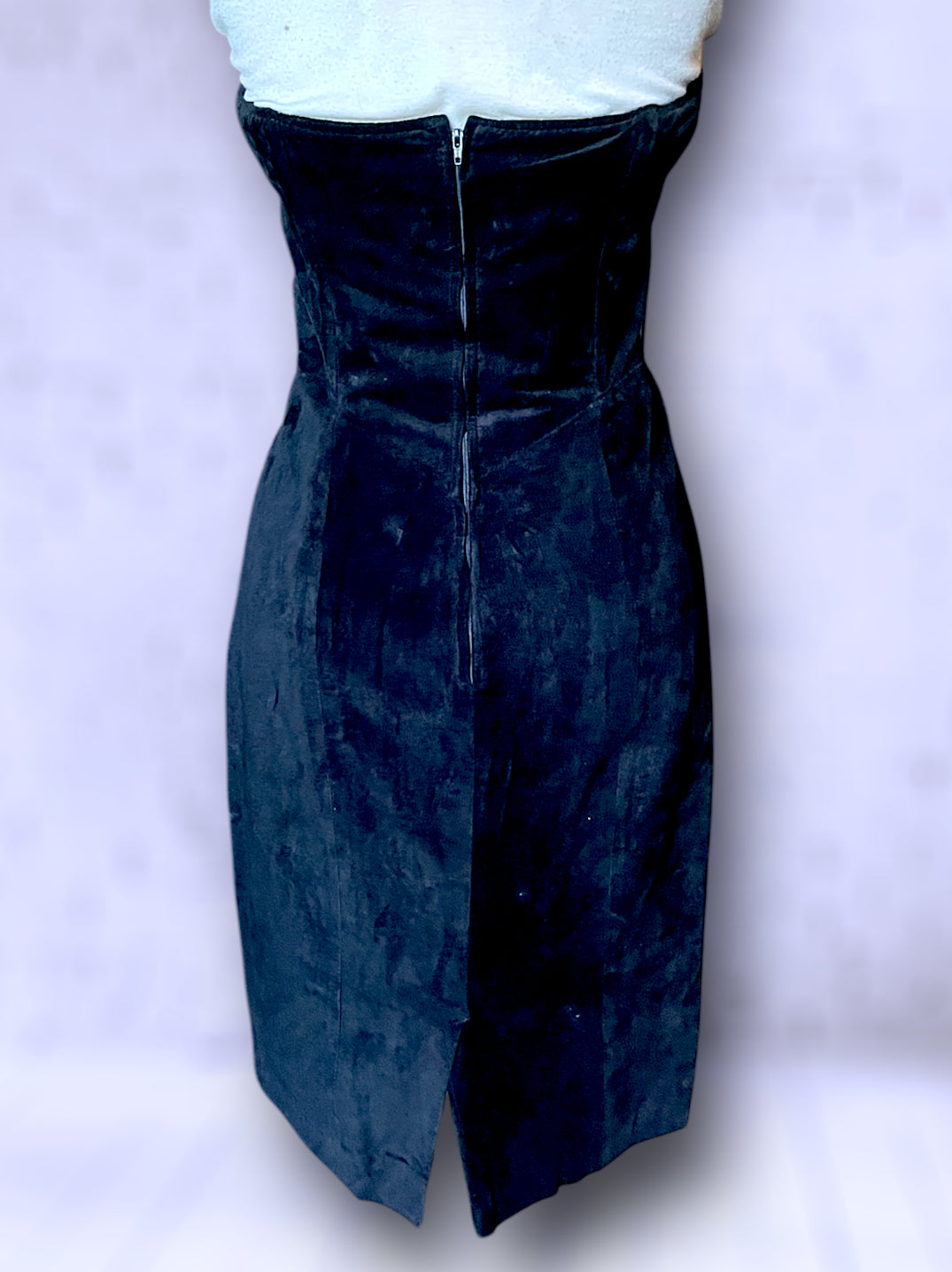 Vintage 1980’s Black Suede Leather Strapless Mini Dress with Crystal Detail