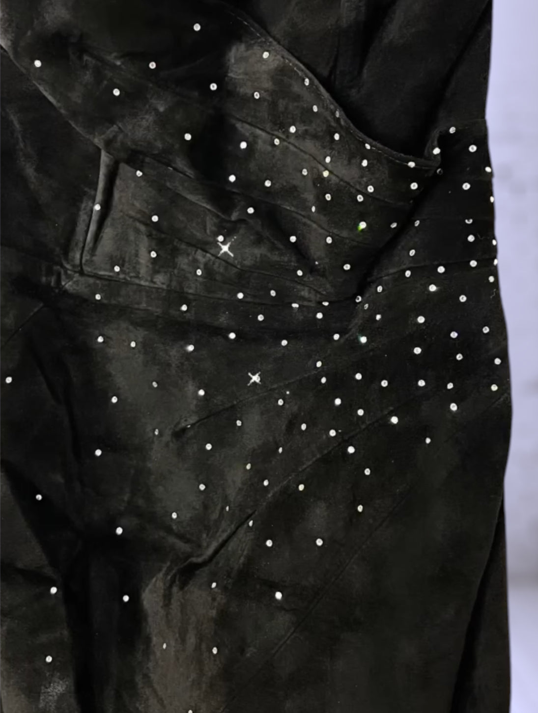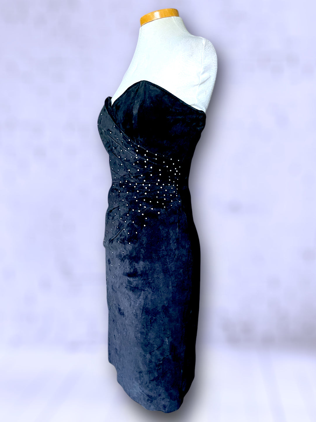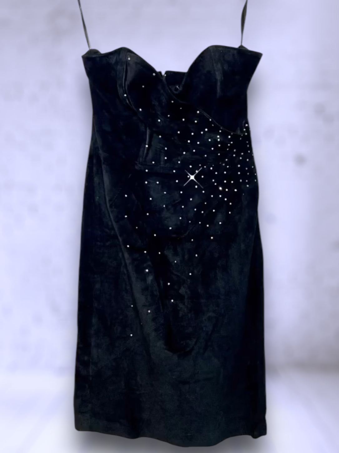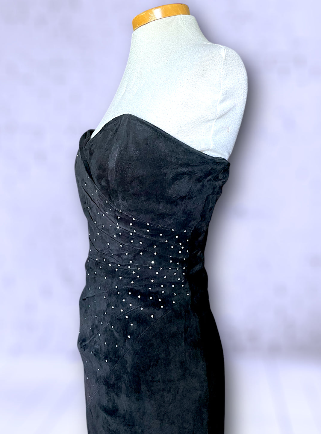 Vintage 1980’s Black Suede Leather Strapless Mini Dress with Crystal Detail
