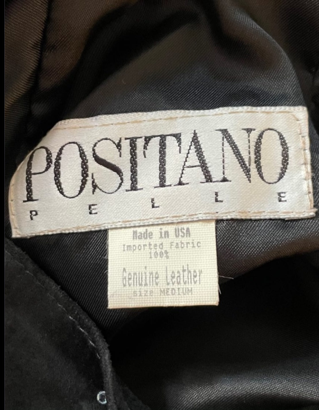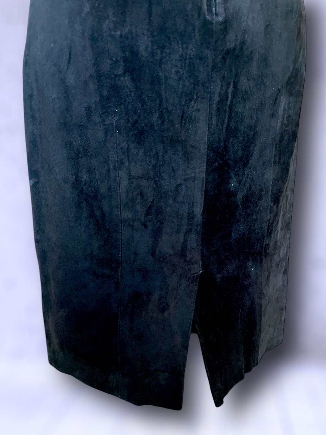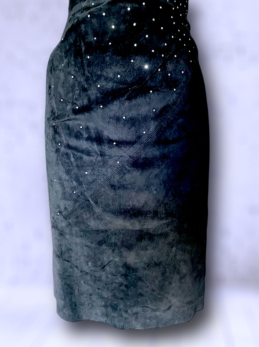 Gorgeous vintage 1980’s black suede leather strapless body con mini dress.  Had a cross over boned bust with a detailed seaming that gathers to the left side.  Covered all over with small crystals that highlight the seaming.  Has a zipper closure in the center of the back and a natural waist seam.  Center back bottom has a small slit.  Dress is fully lined. Label is Positano Pelle / Made in USA imported fabric 100% Genuine Leather / Size Medium.  No damage or condition issues, in like new condition.