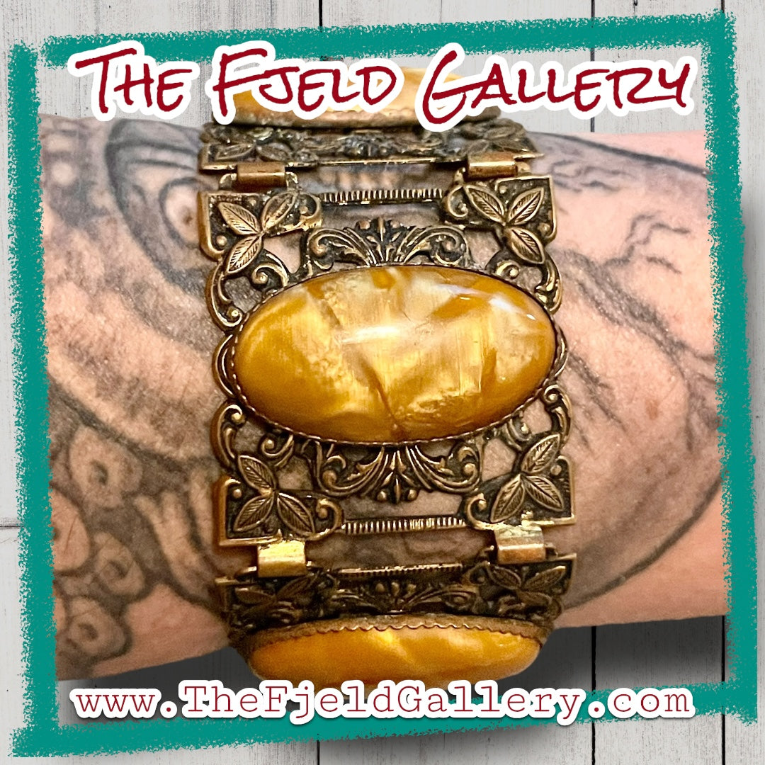 Brass Flower Stamped Czech Marbled Yellow Lucite Panel Bracelet