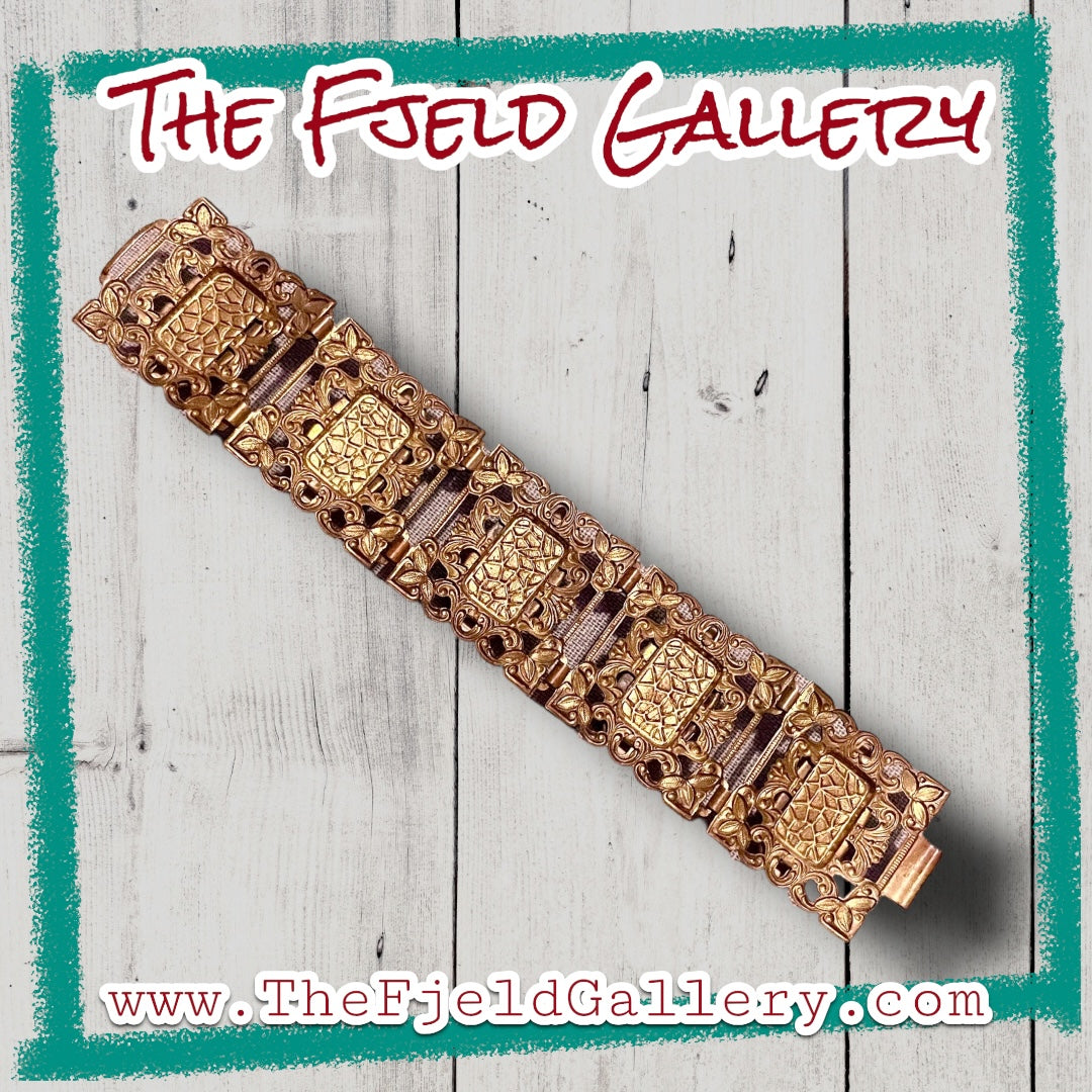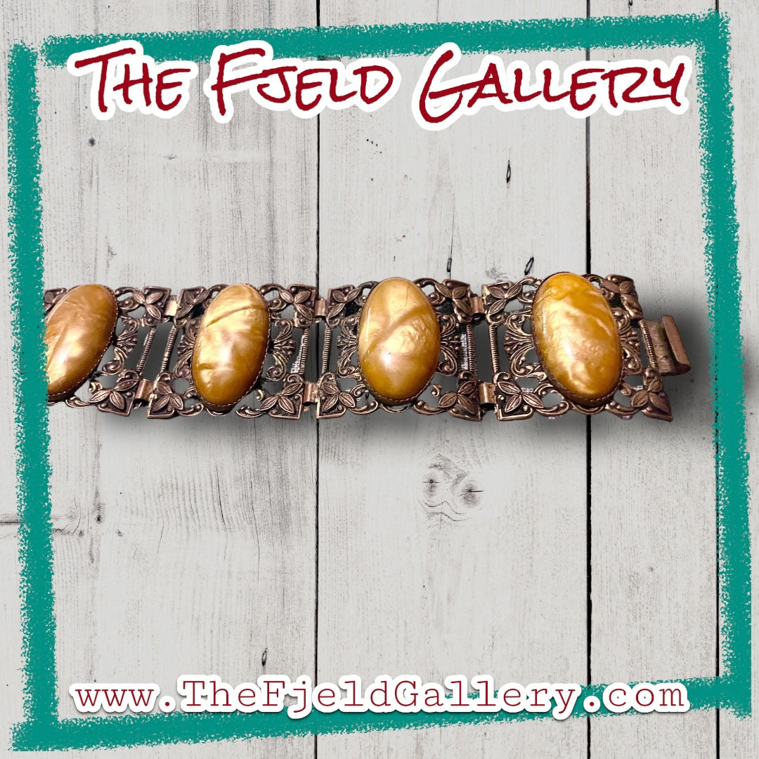 Beautiful marbled opalescent lucite plastic cabochon set in floral flourish stamped design panel bracelet with hook and eye closure.