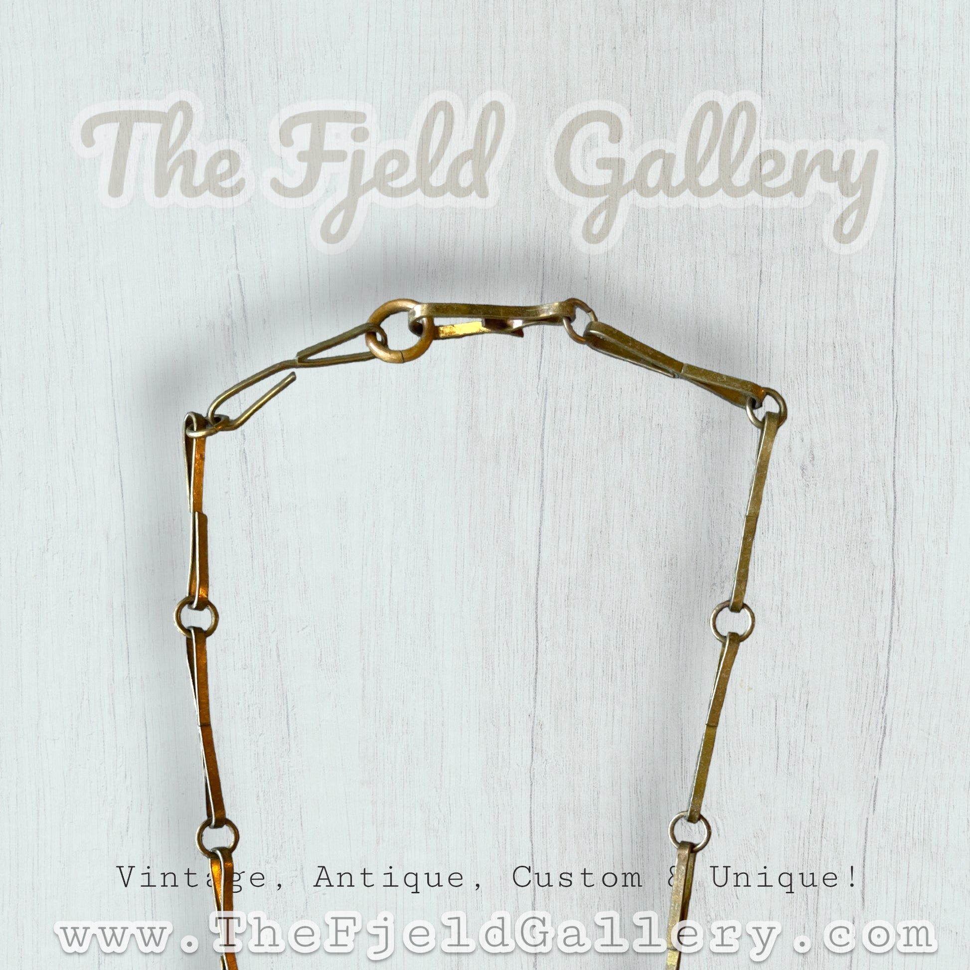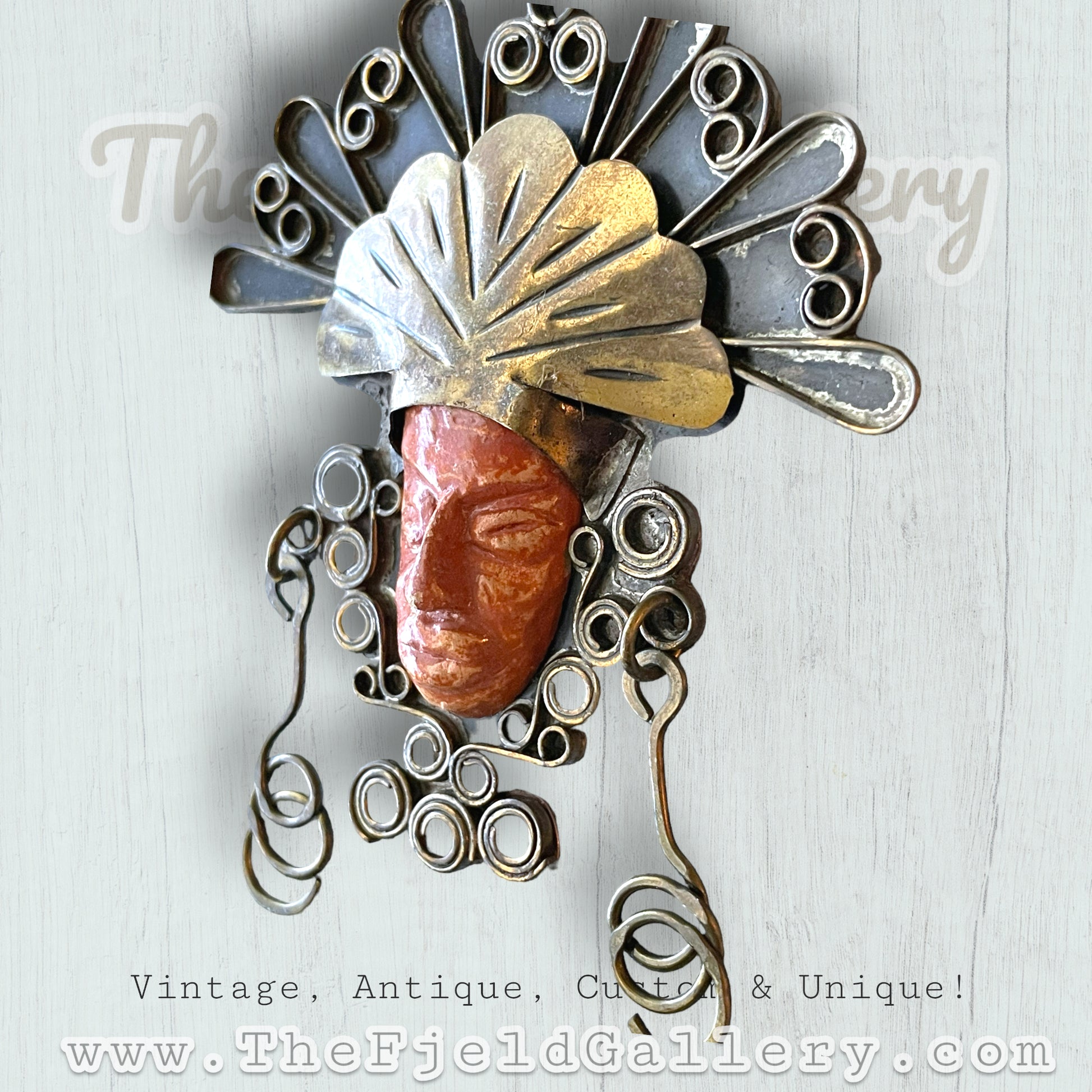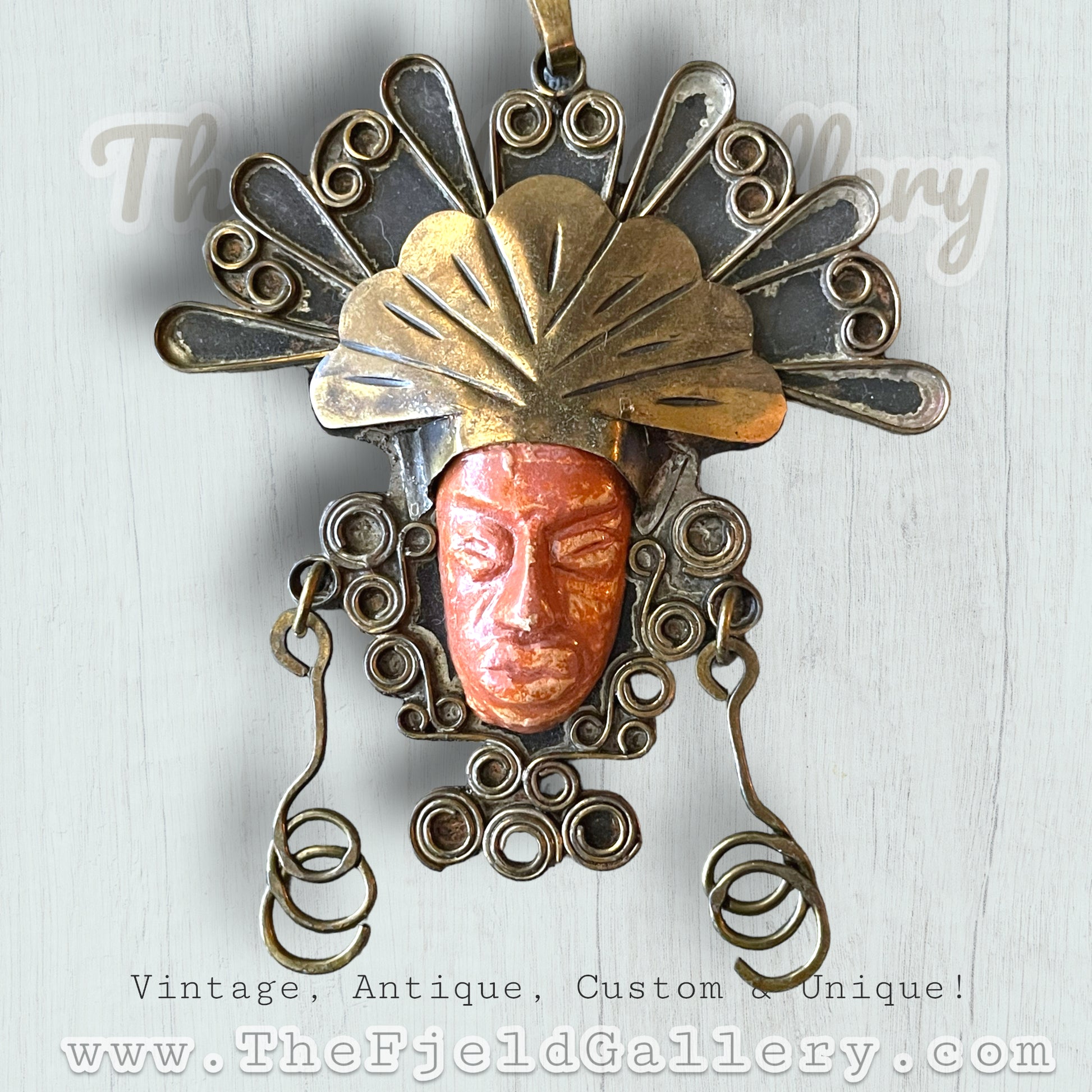 Vintage copper and brass necklace with orange gemstone carved face mask. Made in Mexico c.1940