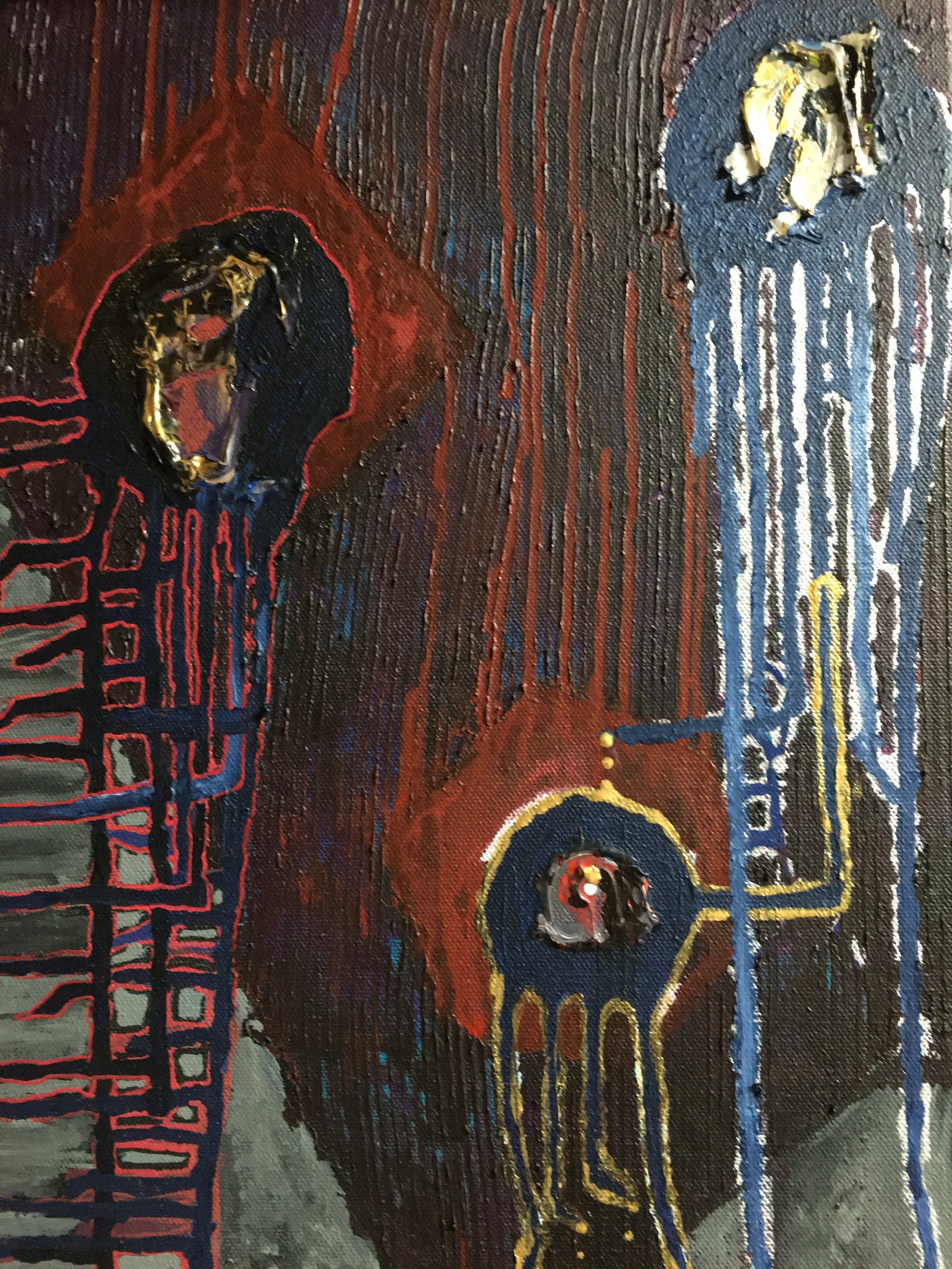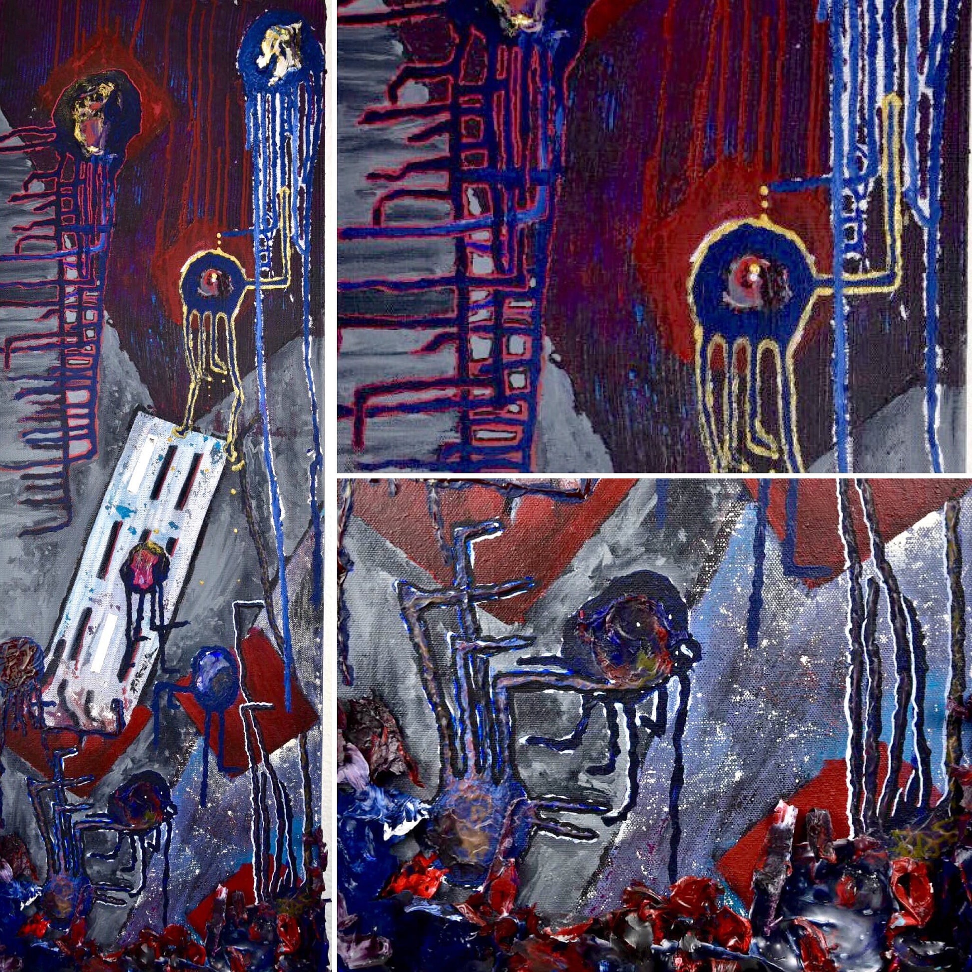 Mixed media painting on canvas; acrylic, spray paint, marker, gold foil, paper & oil pastel on canvas.