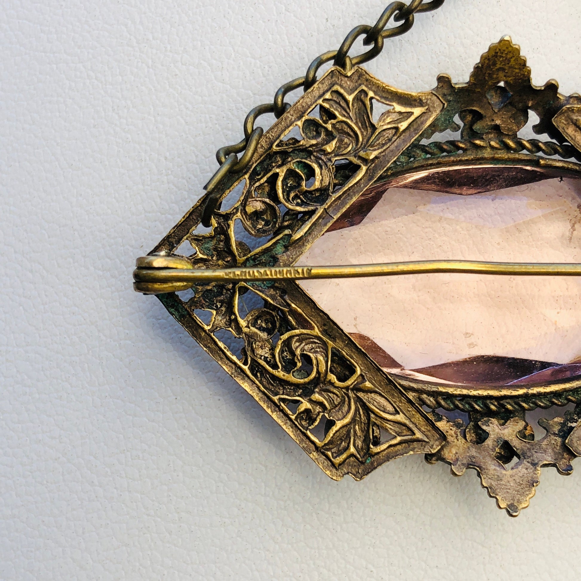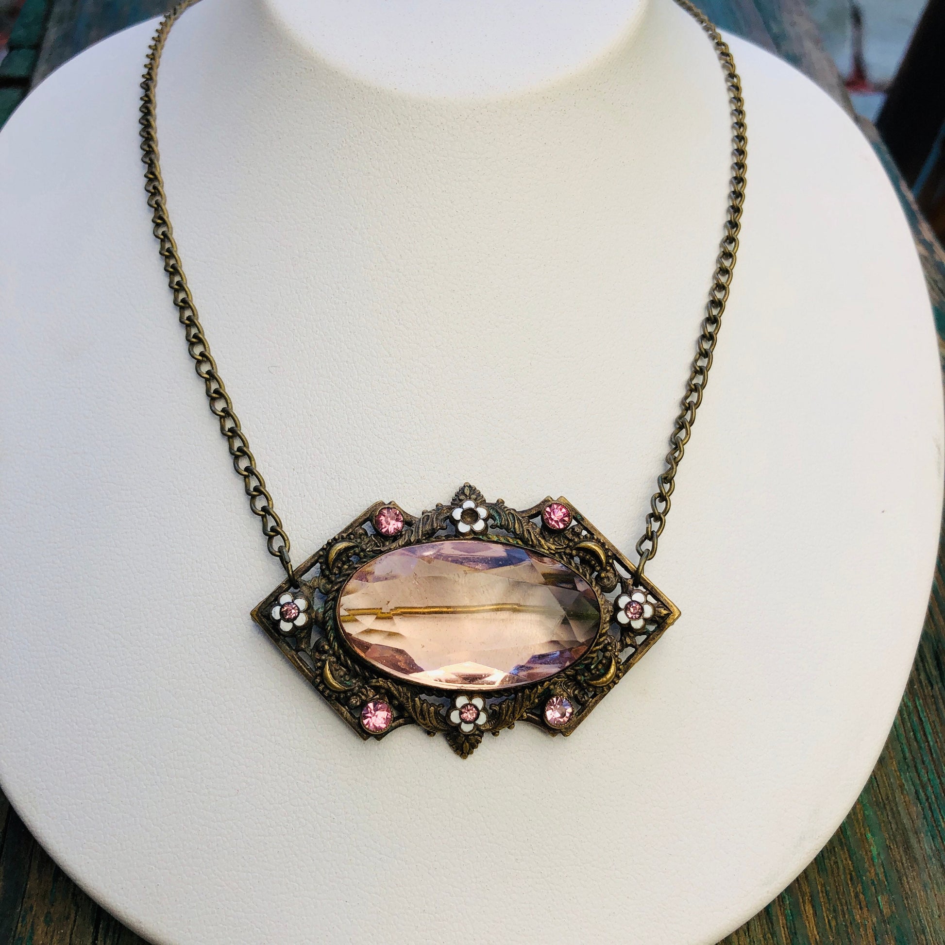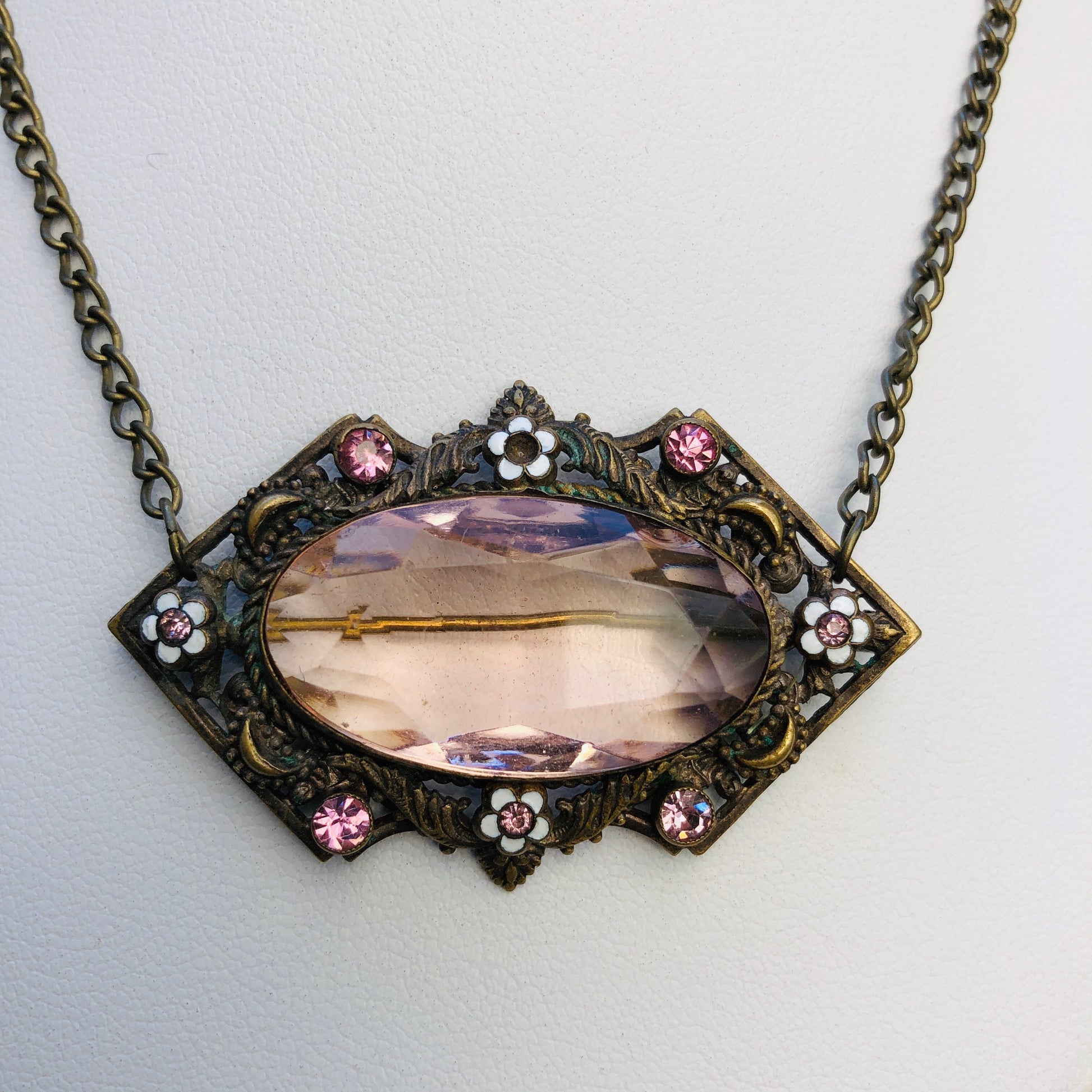 Czechoslovakian Brass Enamel & Pink Faceted Art Glass Brooch / Necklace Pendant