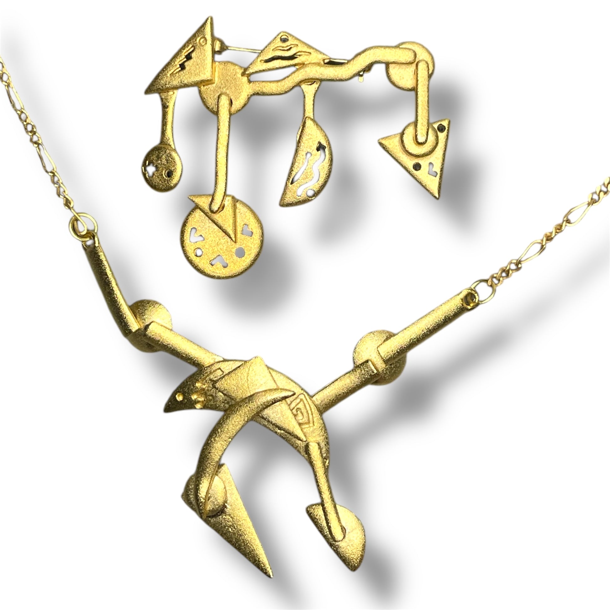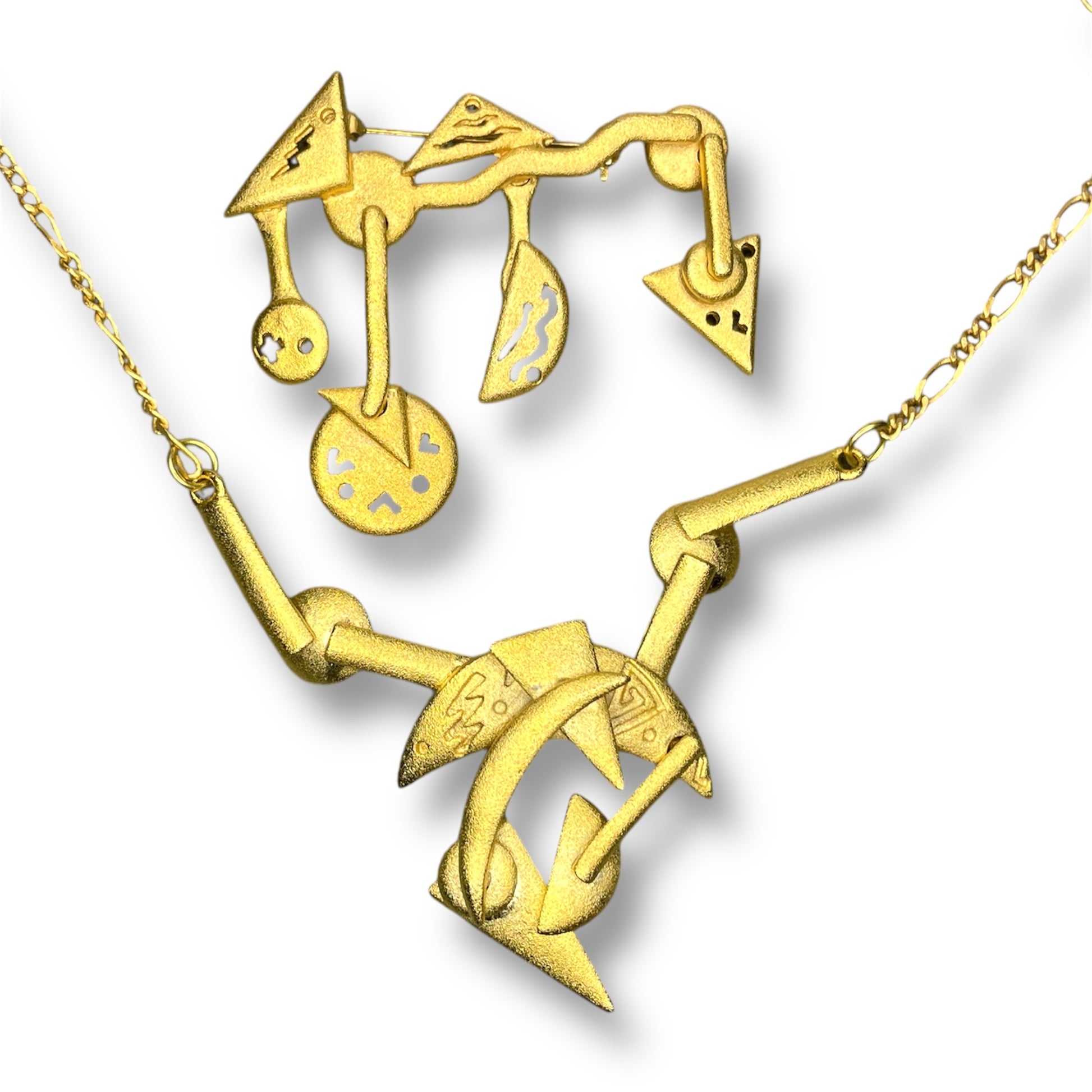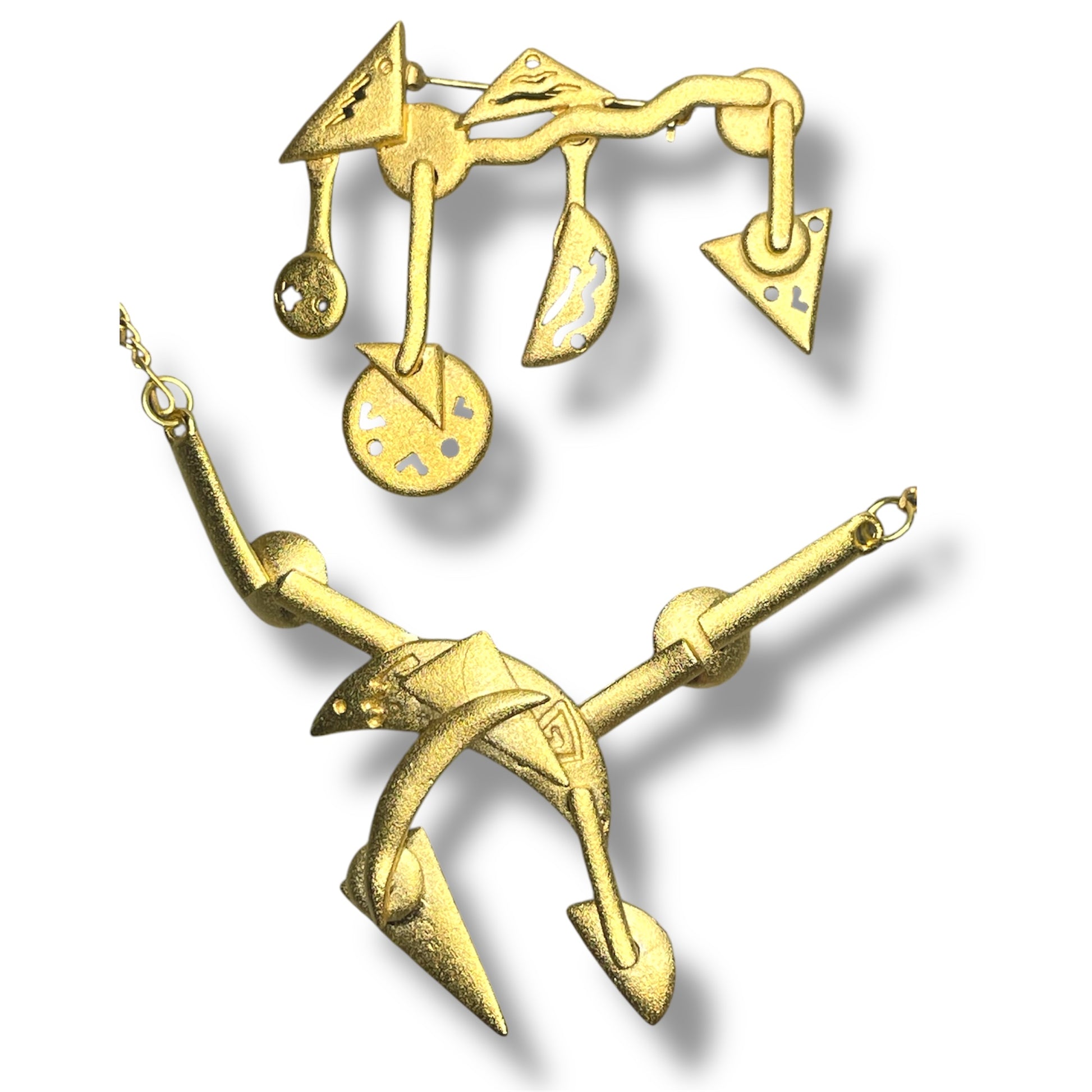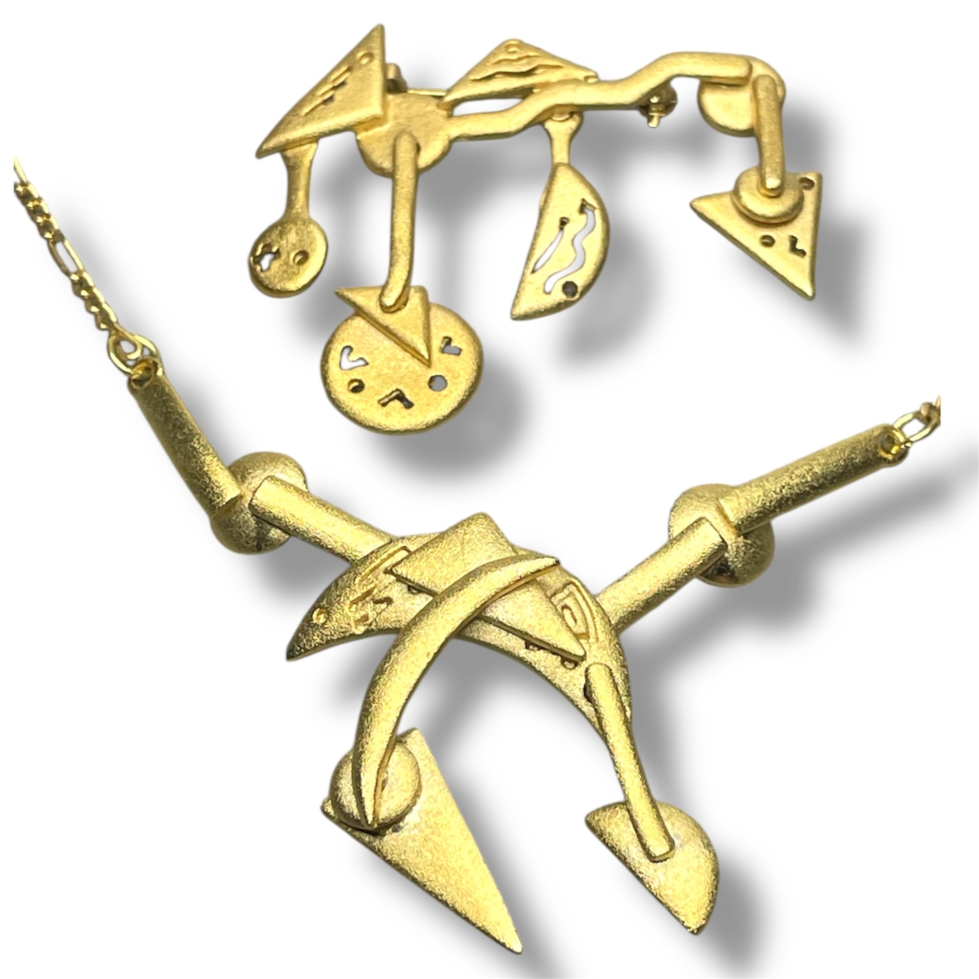 Duri Art Deco Abstract Gold Tone Geometric Articulating Necklace & Brooch Set
