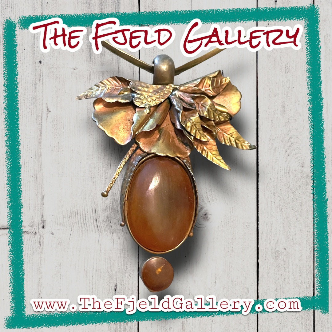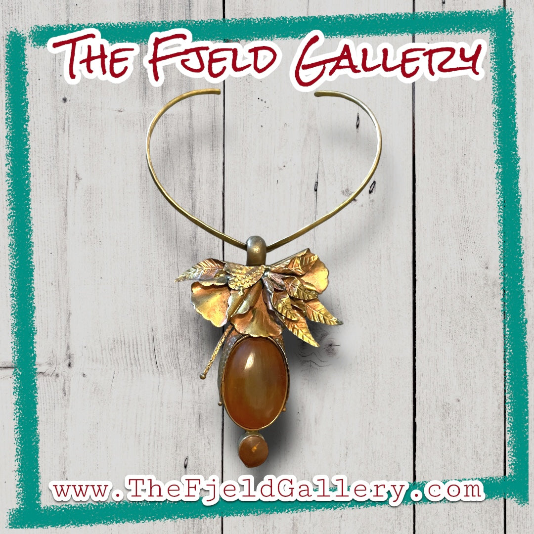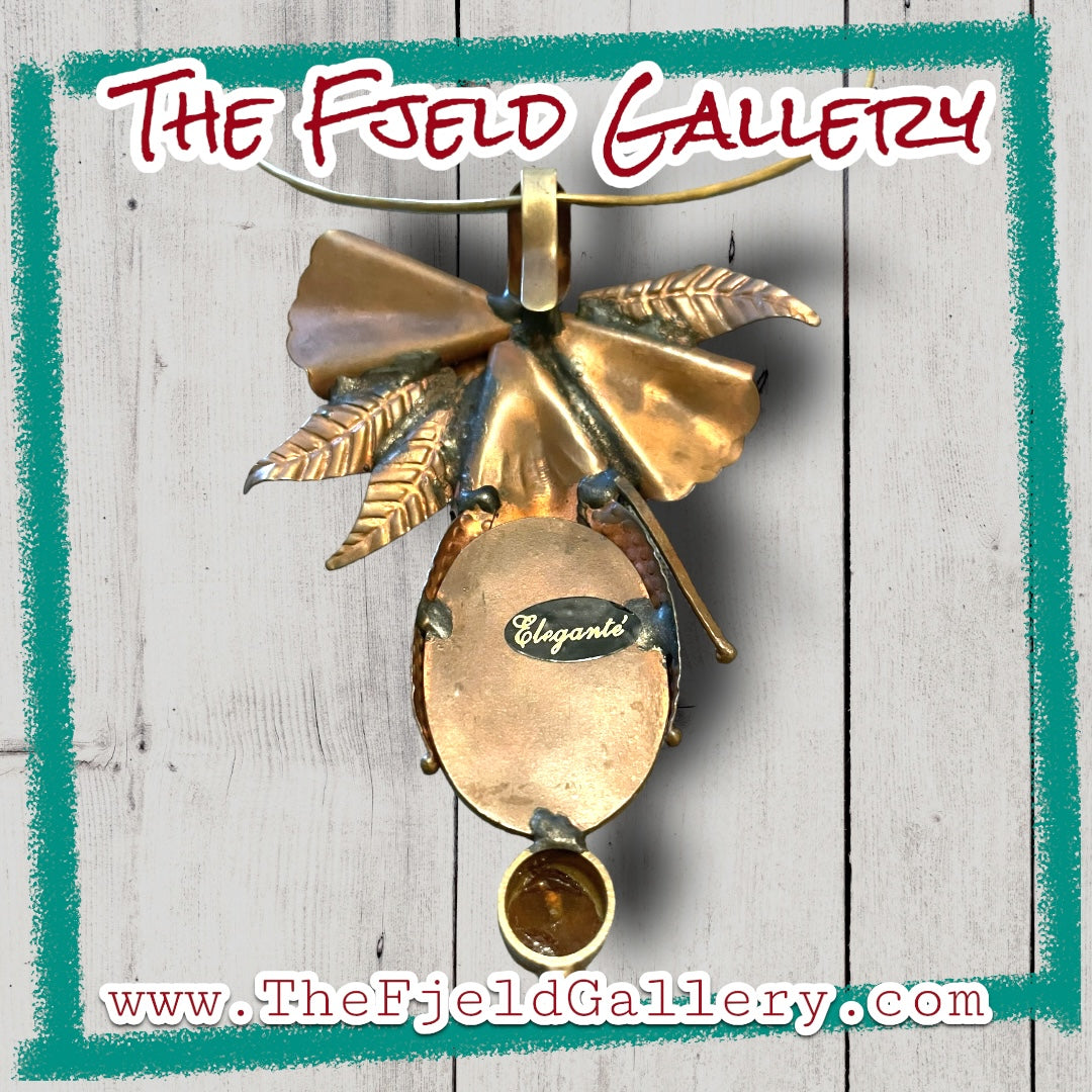 Vintage unique 1960’s designer barbaric style brass chevron choker style necklace with designer signed Eleganté brass floral embossed hook pendant with apple juice amber bezel set gemstone.