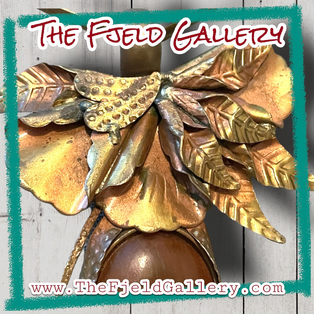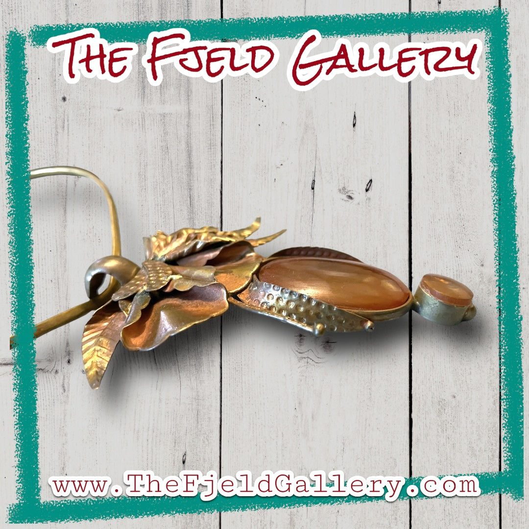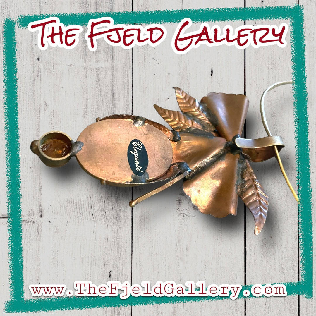 Vintage unique 1960’s designer barbaric style brass chevron choker style necklace with designer signed Eleganté brass floral embossed hook pendant with apple juice amber bezel set gemstone.