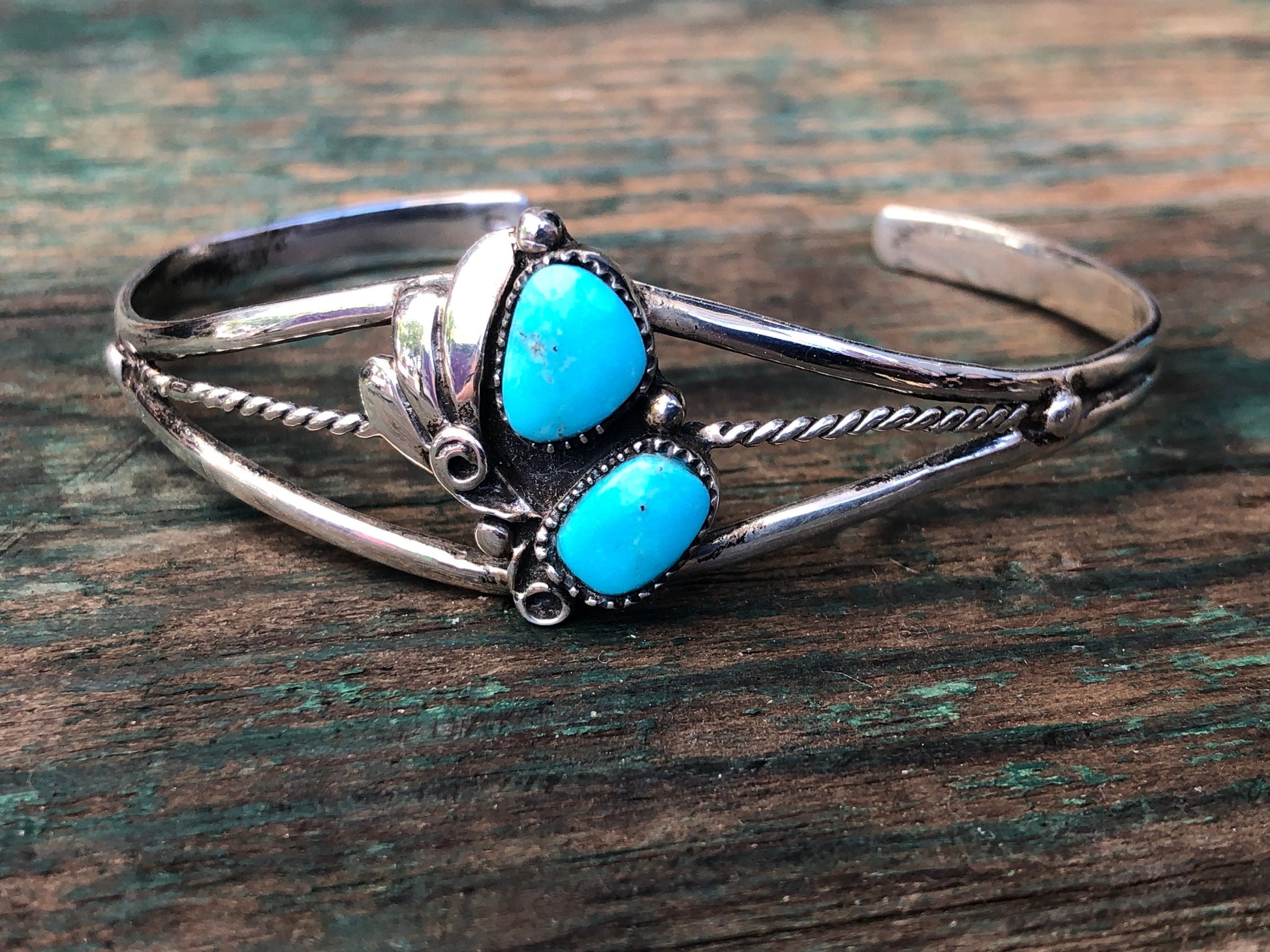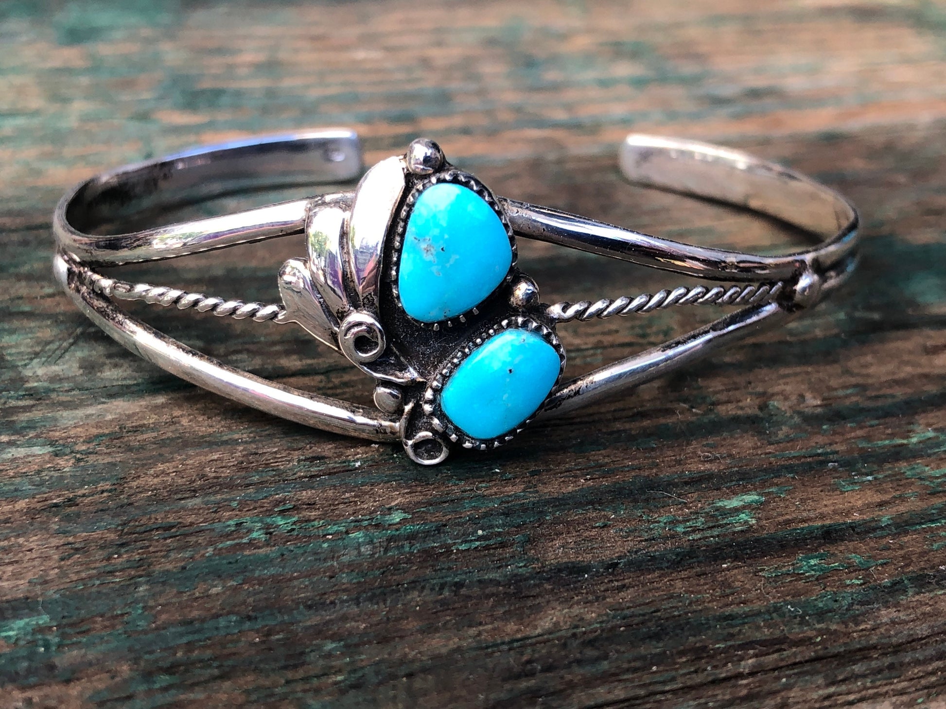 Gorgeous 2 stone Turquoise Gemstone Native American Vintage Sterling Silver Cuff Bracelet