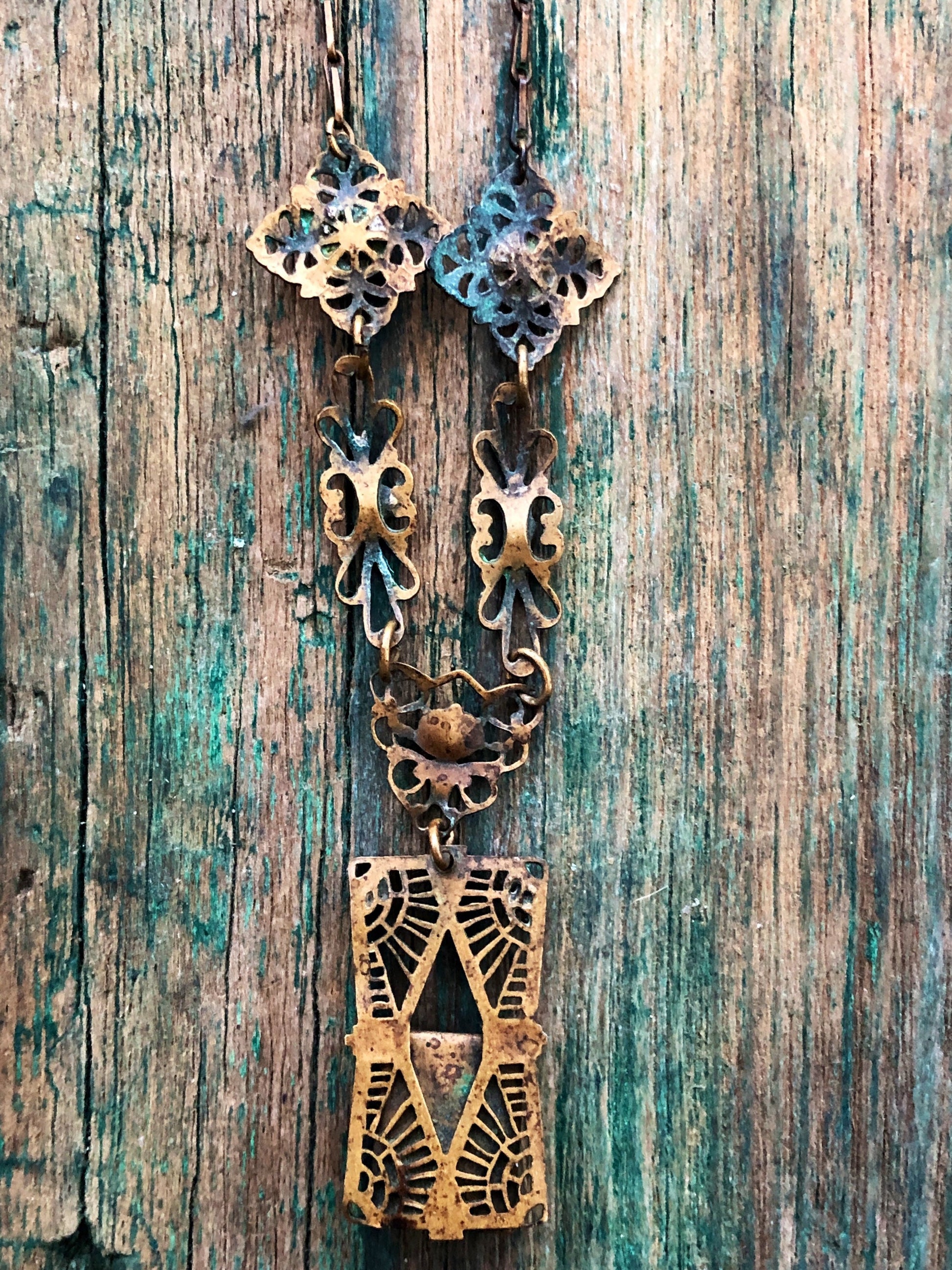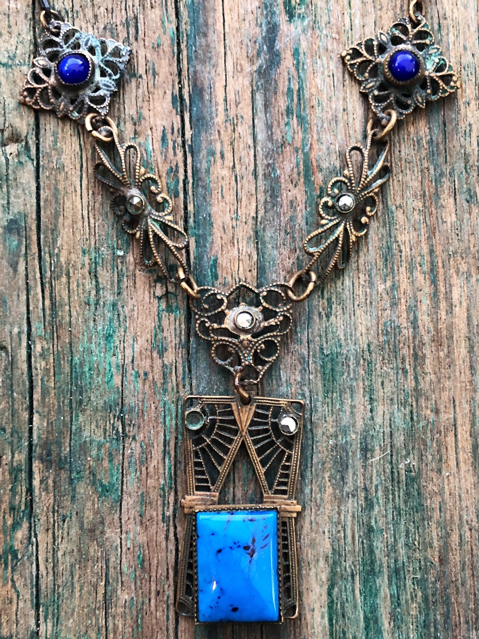 This necklace is incredible! A real gorgeous example of antique art. Czech Art Nouveau turquoise, lapis Art Glass bezel set in an intricate brass filigree design with Marcasite. Old style spring ring clasp is secure and condition is very good. does have some patina and tarnish, but it only adds to the beauty!