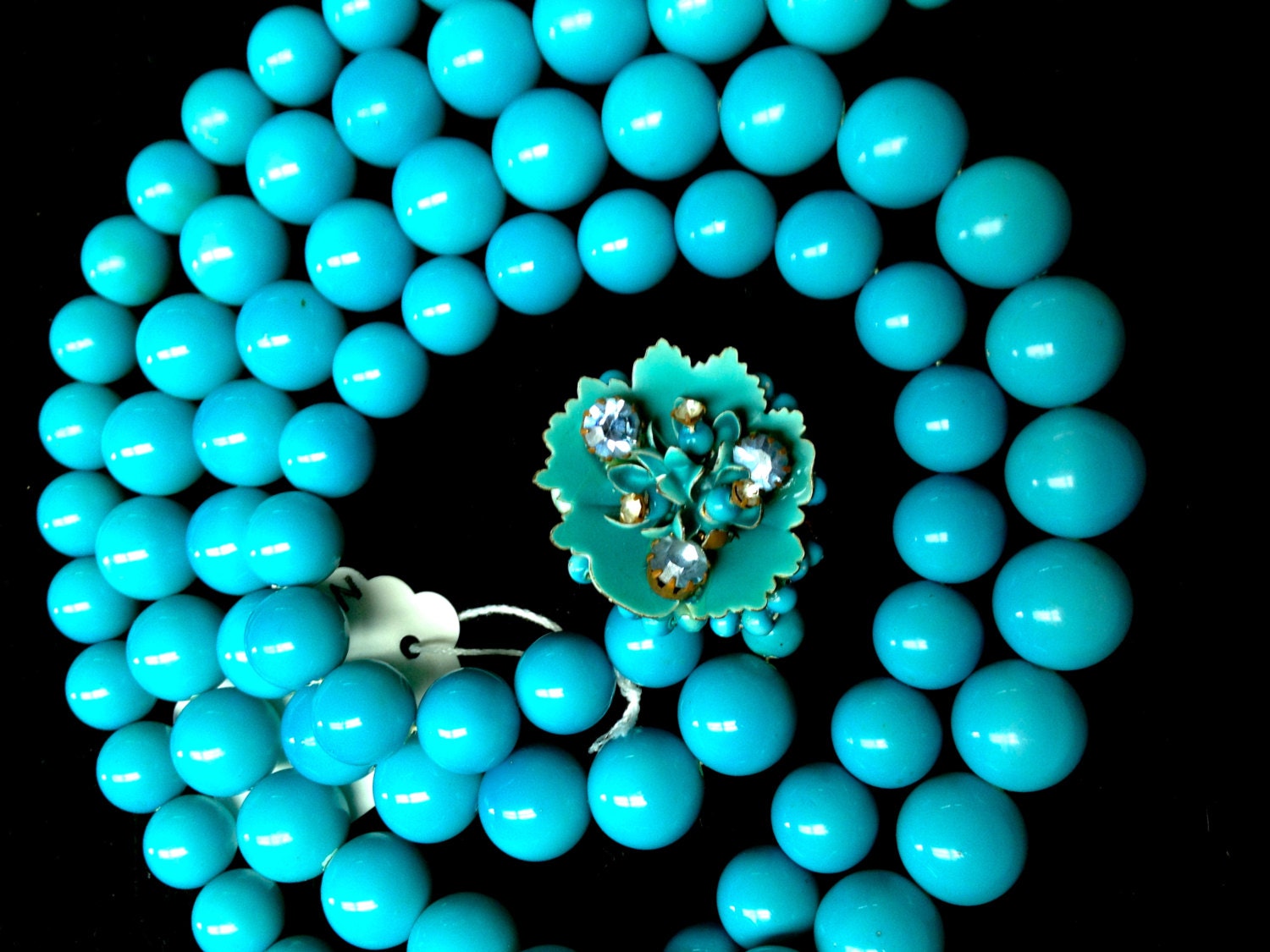 Gorgeous mid century modern sky blue multi strand chunky beaded necklace with an amazingly awesome brass enameled clasp made to look like a flower and prong set with crystal rhinestones. Such a glorious piece, I love love love it! Hidden box clasp is secure and in good condition. No damage or condition issues. c. 1950’s No hallmarks or signatures.