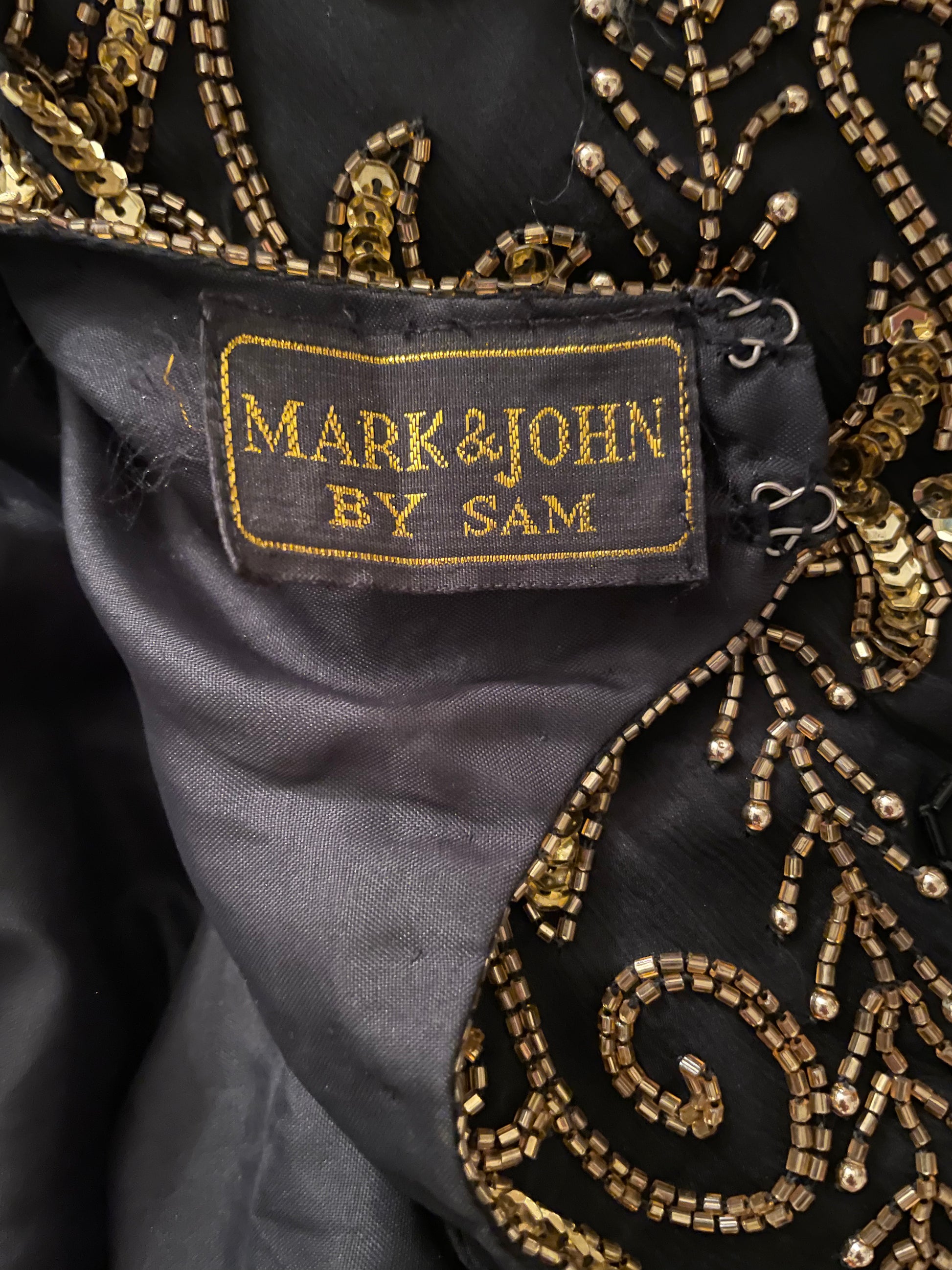 This is a gorgeous vintage 1980’s black and gold fully beaded & sequined party dress with star, flower, leaf & swirl design. Short sleeved with scallop detail with shoulder pads and short hemline, featuring a keyhole back detail. Small slit in back. Double hook and eye neck closure and hanging assistance still attached. Fully lined. Tag brand says “Mark John by Sam”. No damage, no missing beads or loose/broken threads with beads falling. Perfect condition!