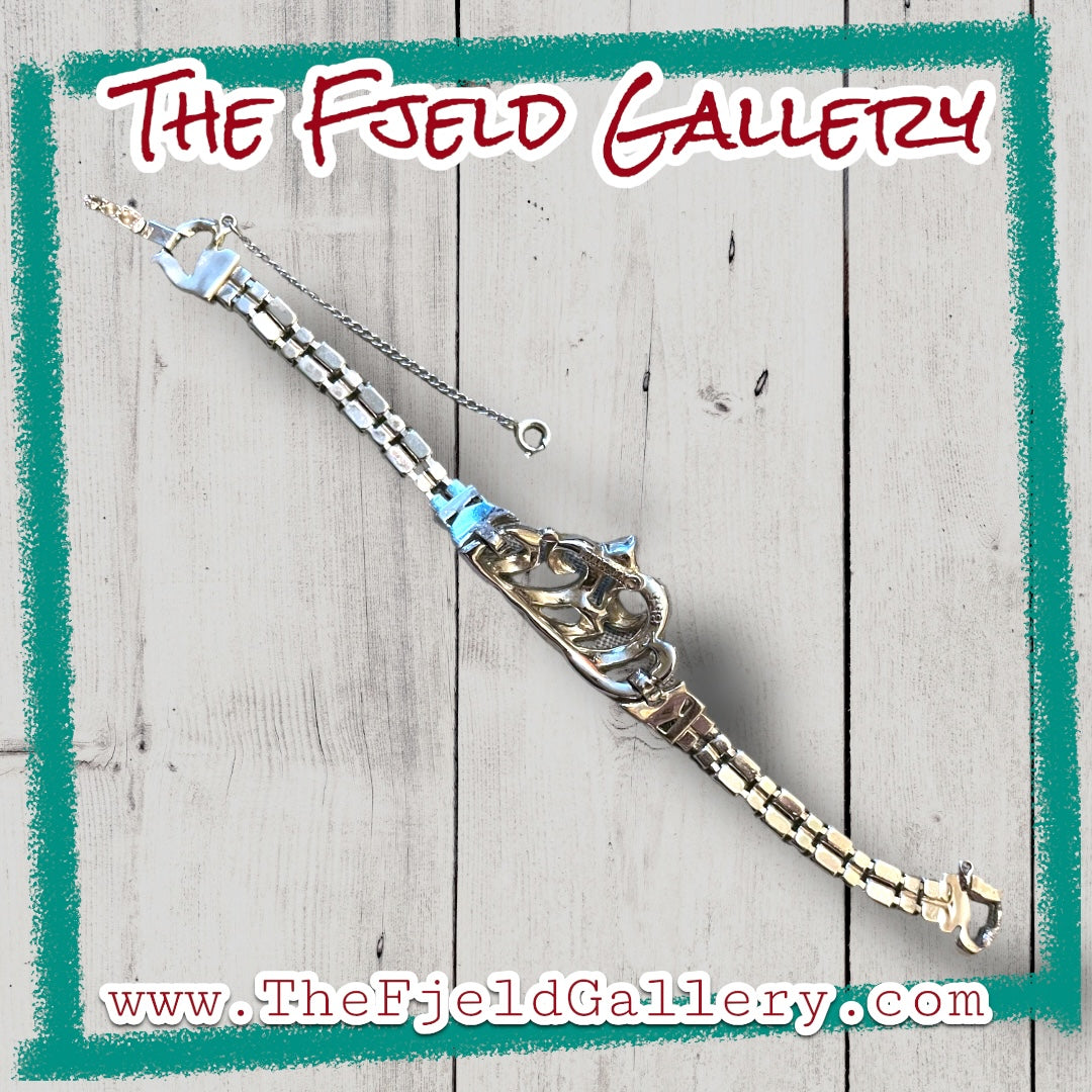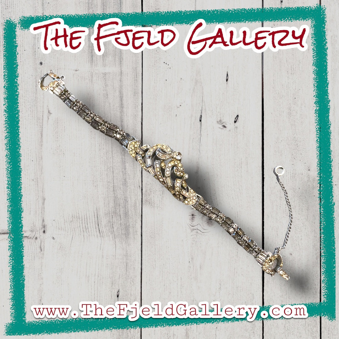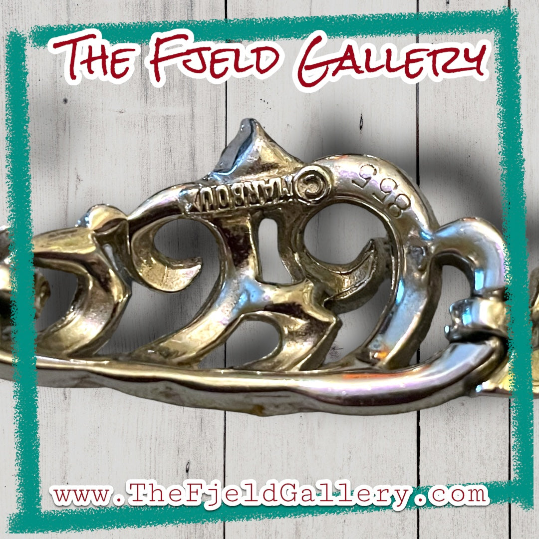Gorgeous designer signed and numbered Marboux silver bracelet. Central cast crown design face set with clear crystal rhinestones and a prong smokey quartz rhinestone expansion style bracelet “chain”. Fold over style clasp also encrusted with rhinestones. Numbered 855 on the back. Also has a security chain with spring ring clasp. 7.25” long.