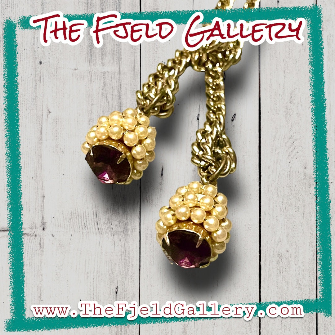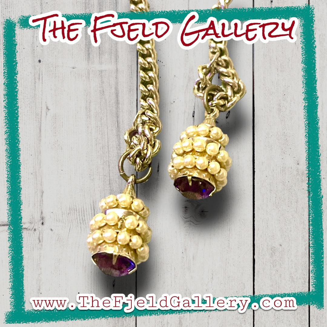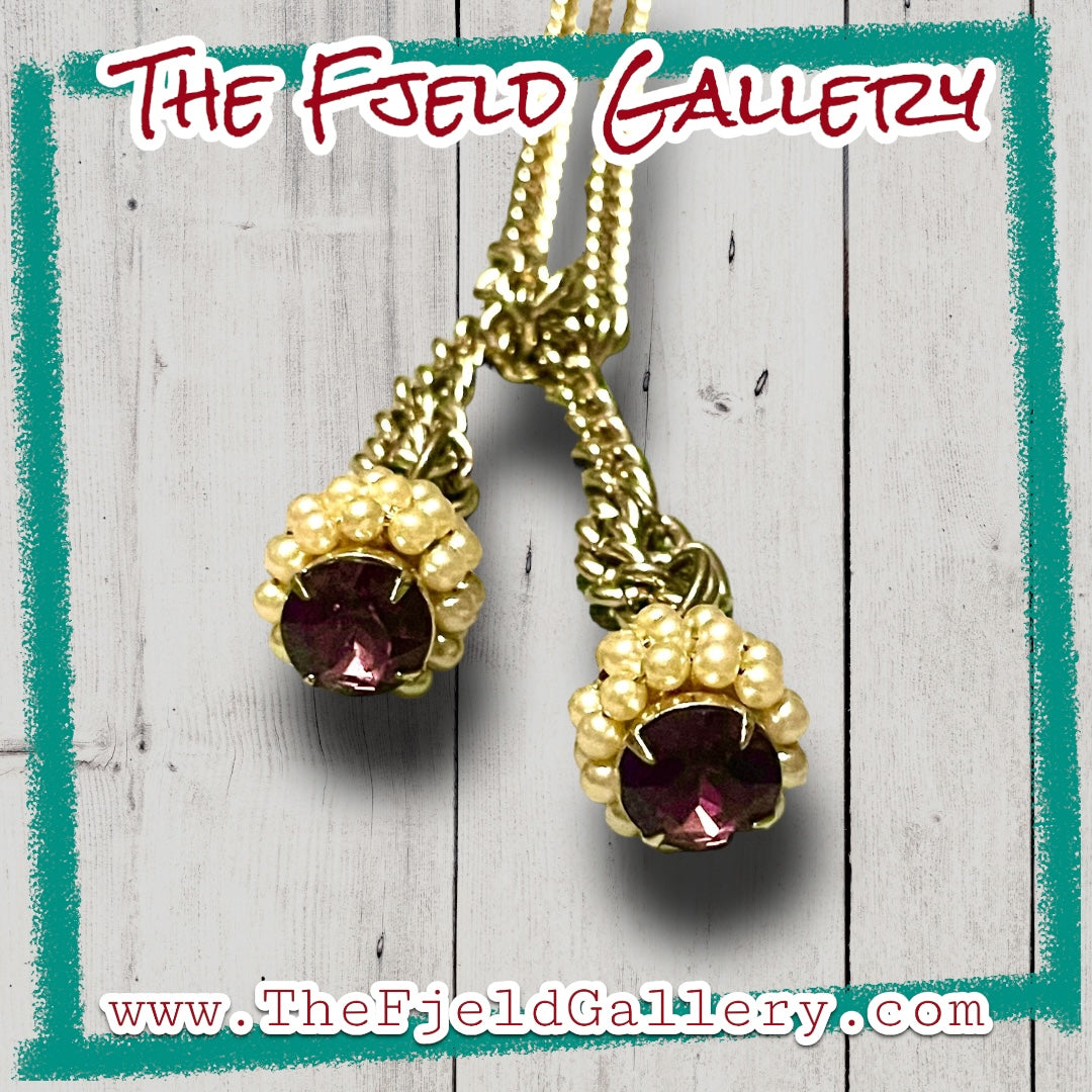 Beautiful 1950’s Hollywood regency pearl and prong set purple art glass gold chain lariat style necklace.