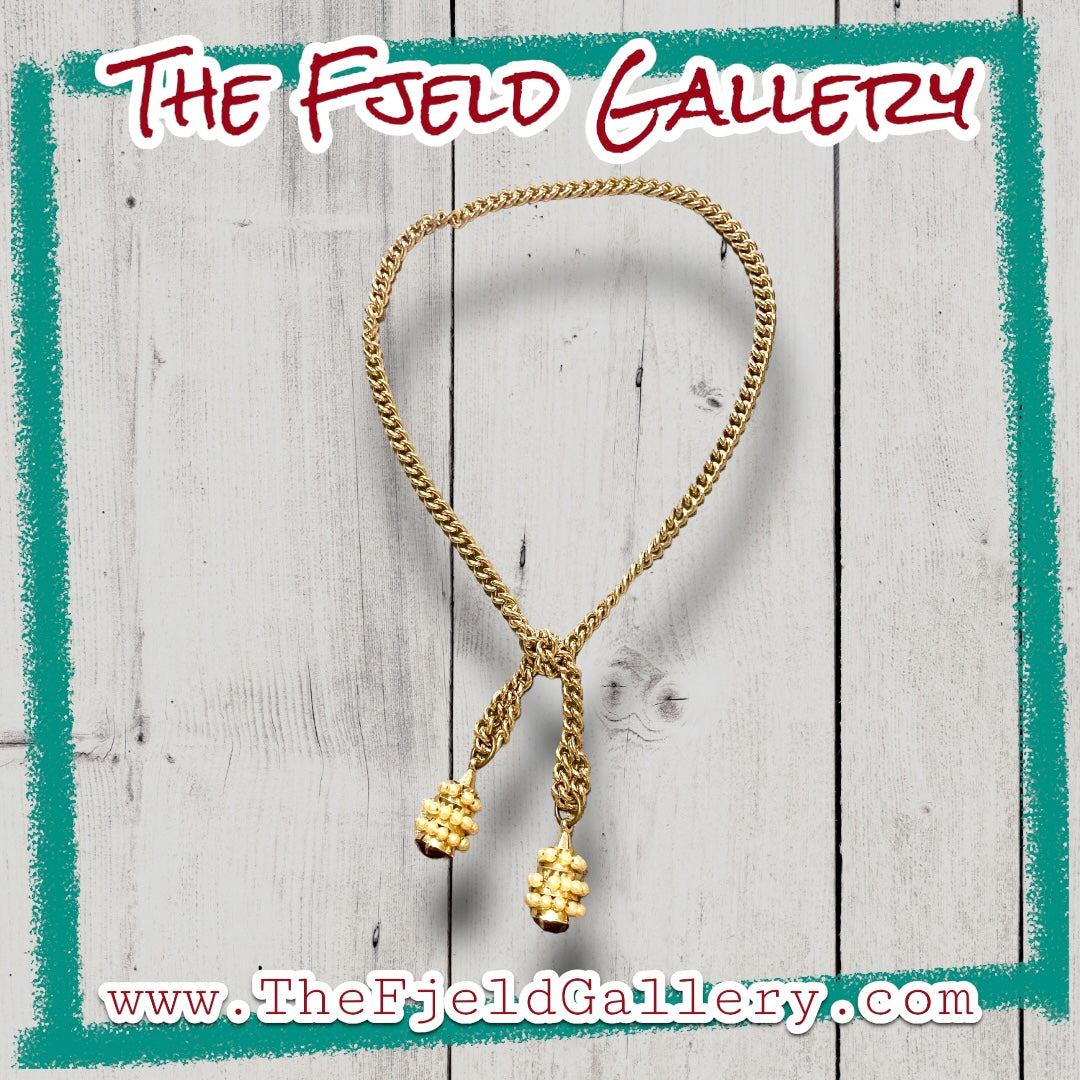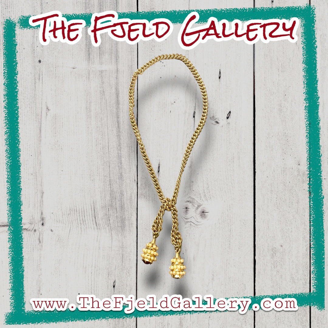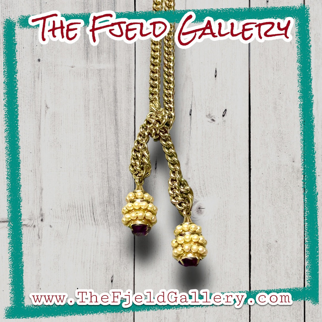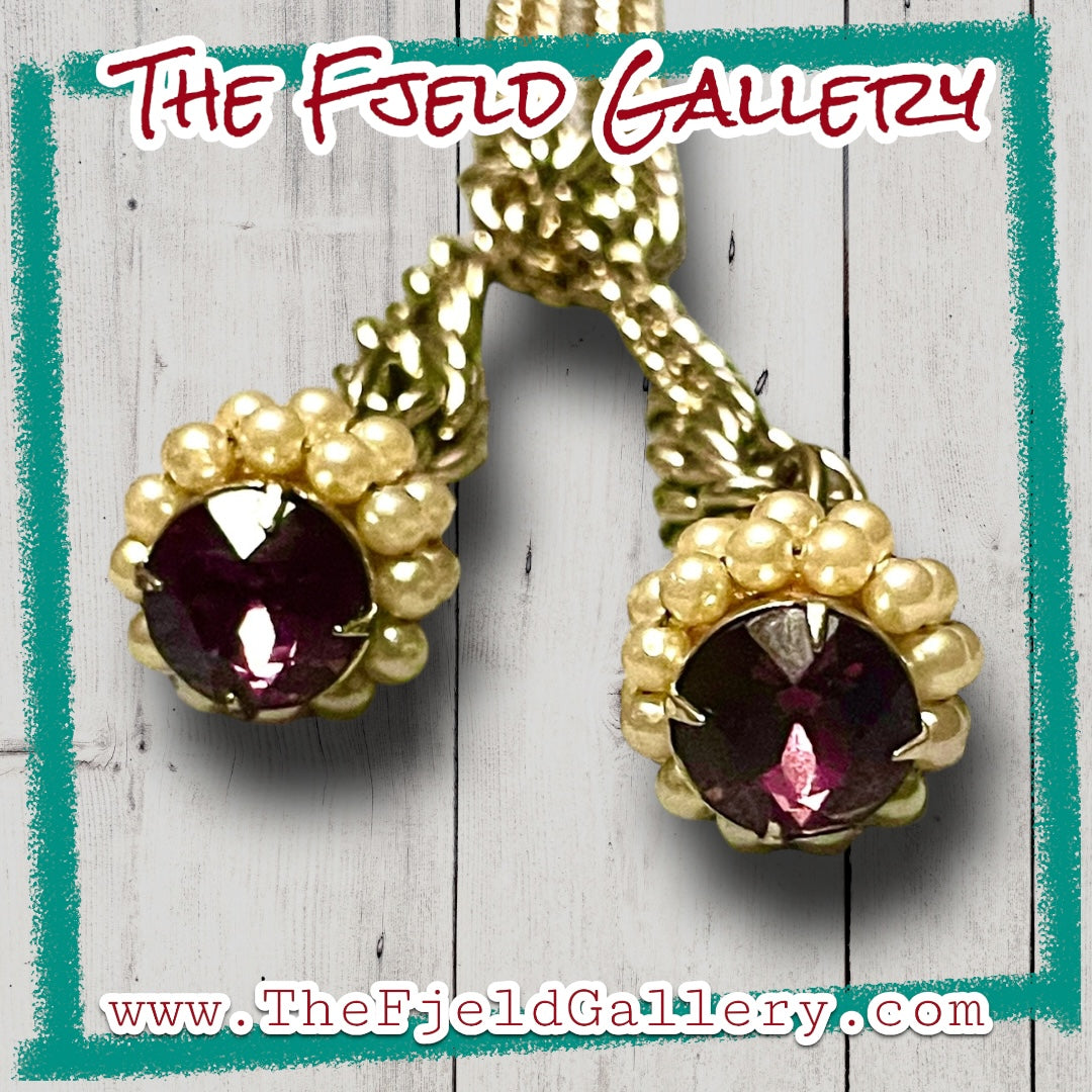 Beautiful 1950’s Hollywood regency pearl and prong set purple art glass gold chain lariat style necklace.
