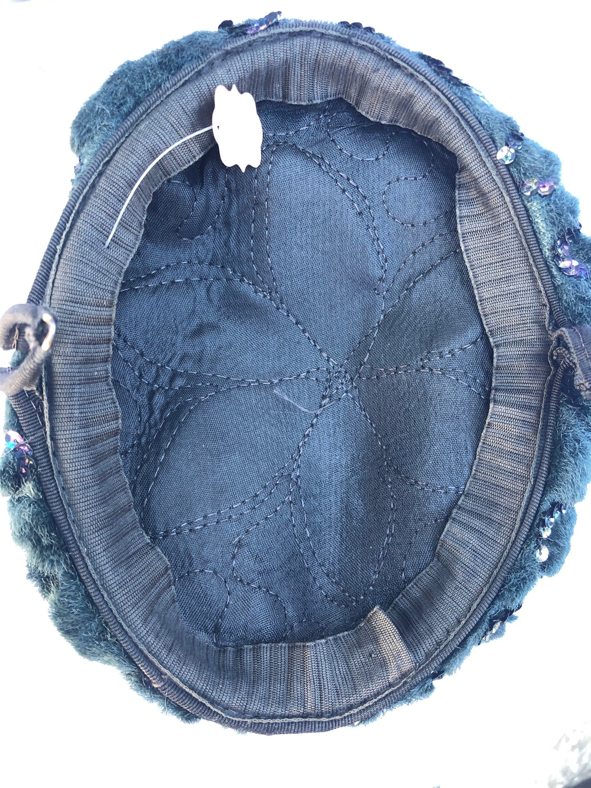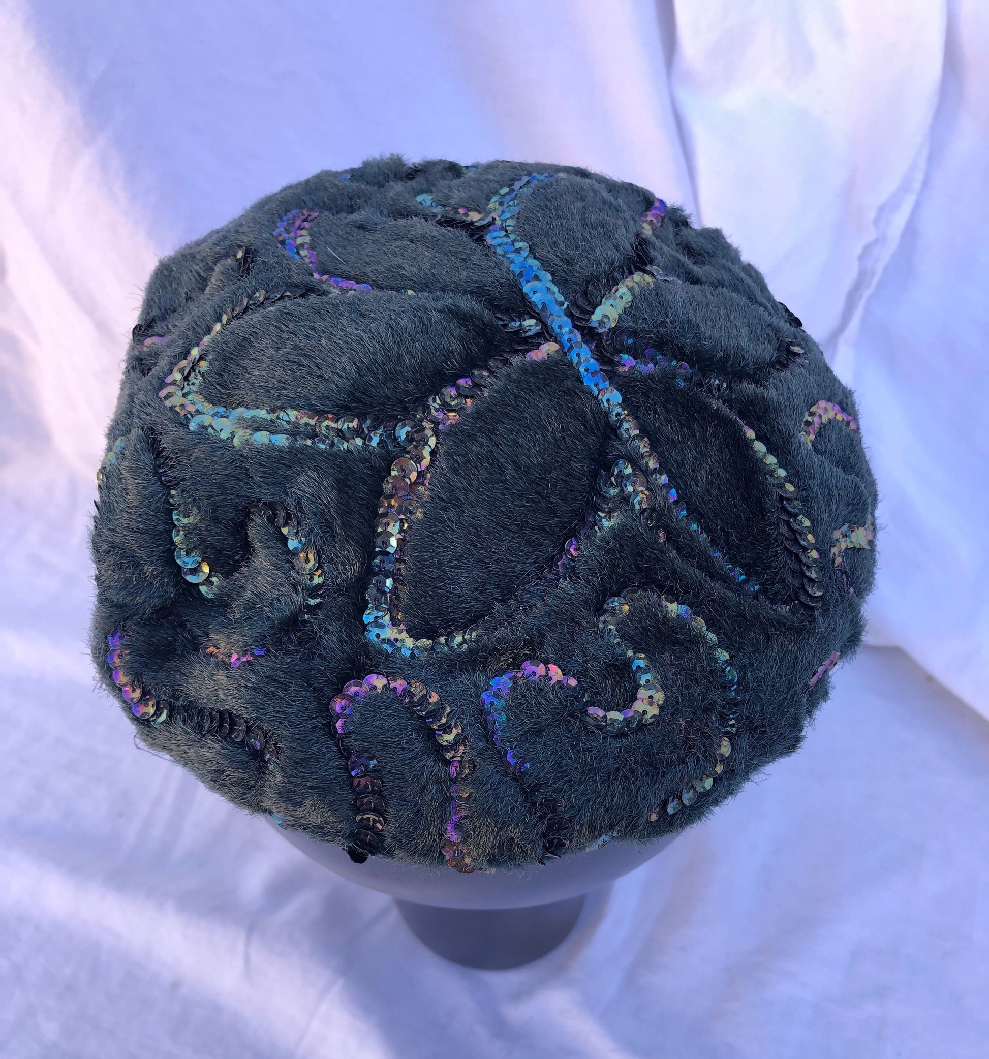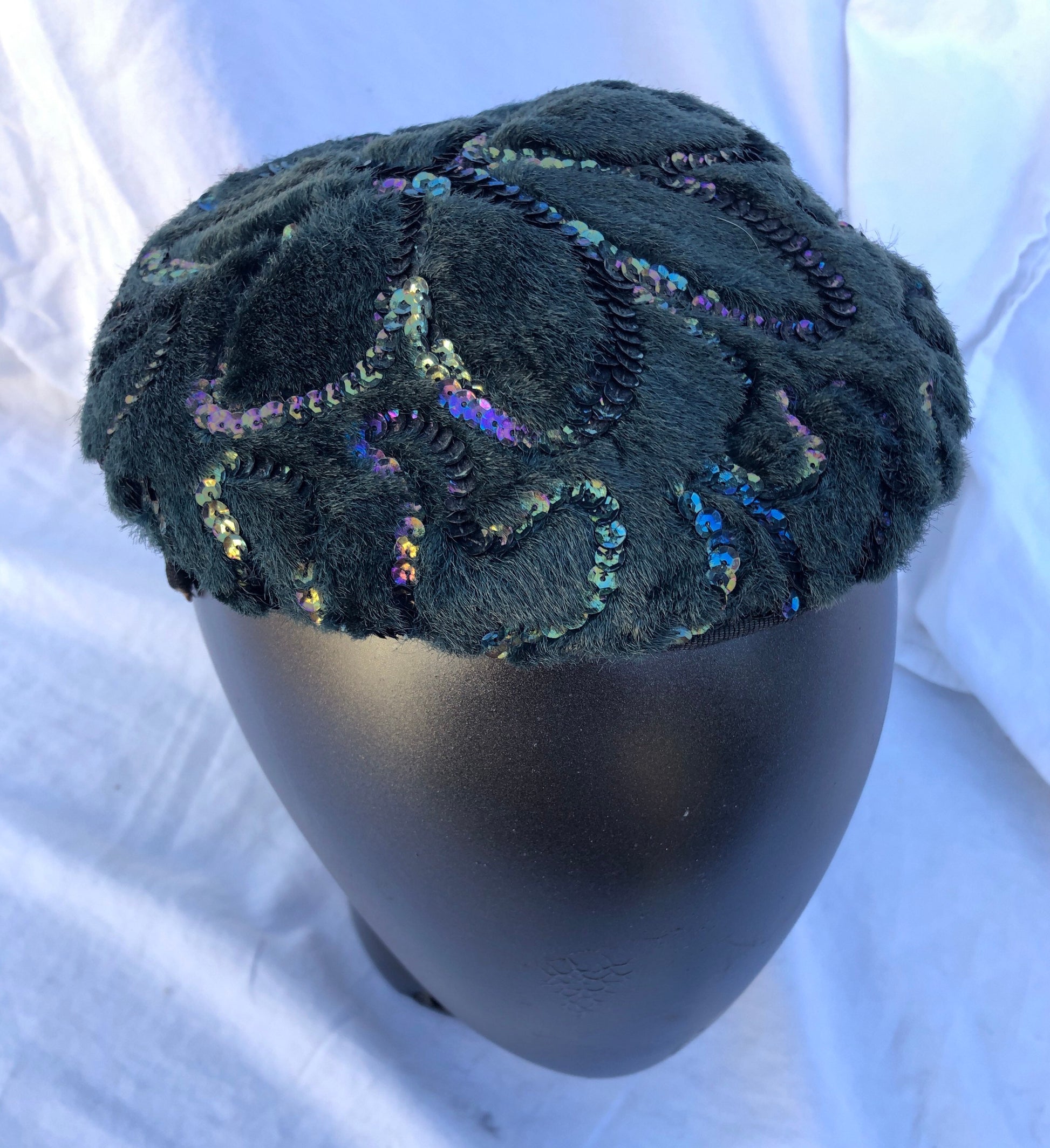 Hunter Green Fuzzy Fascinator Mini Hat with Aurora Borealis Rainbow Sequin Pattern