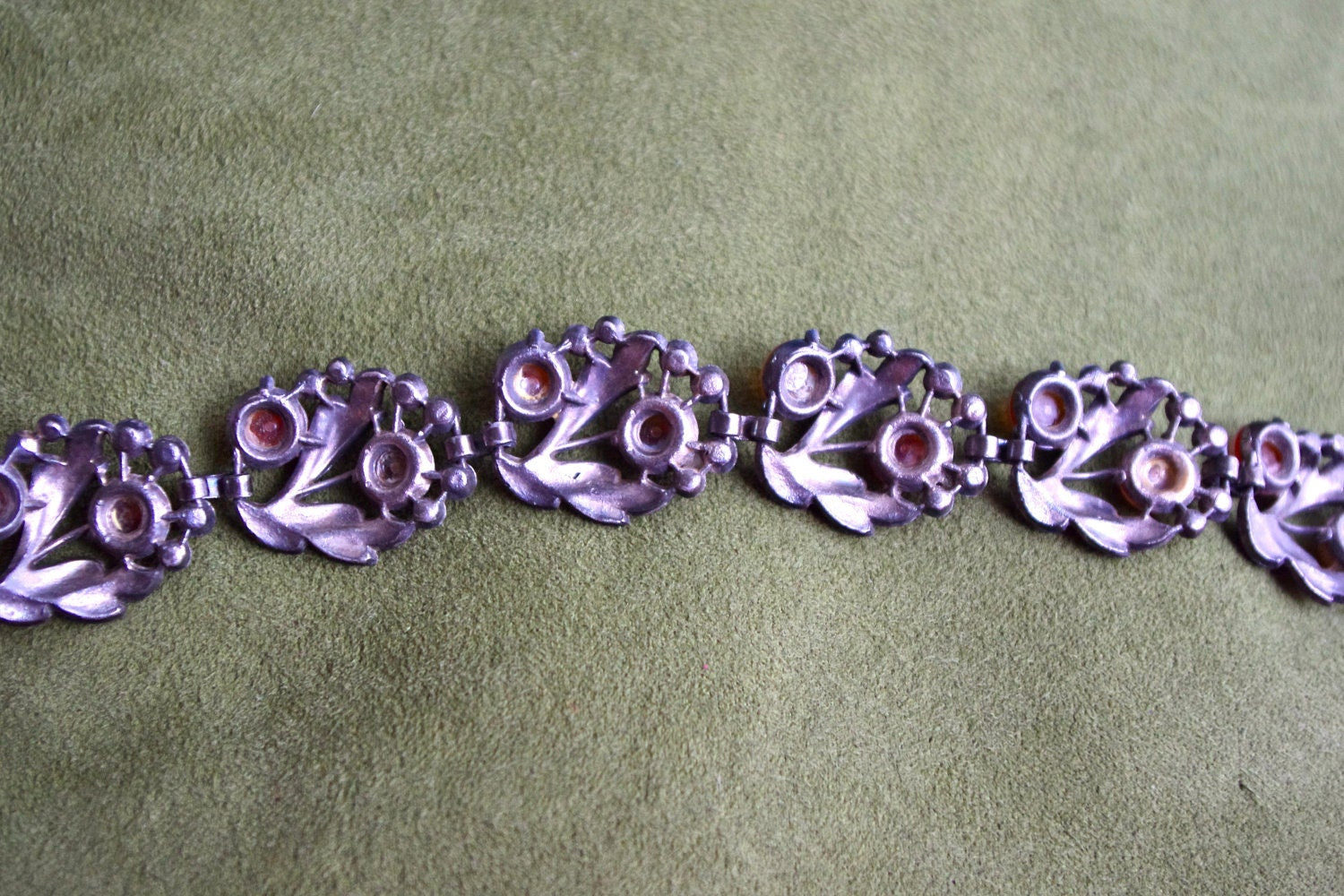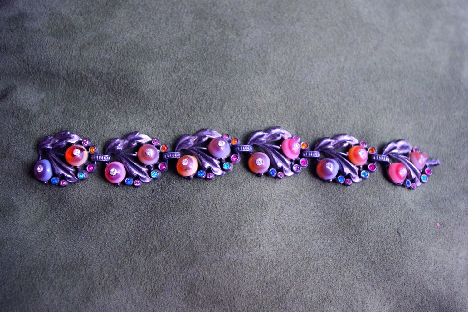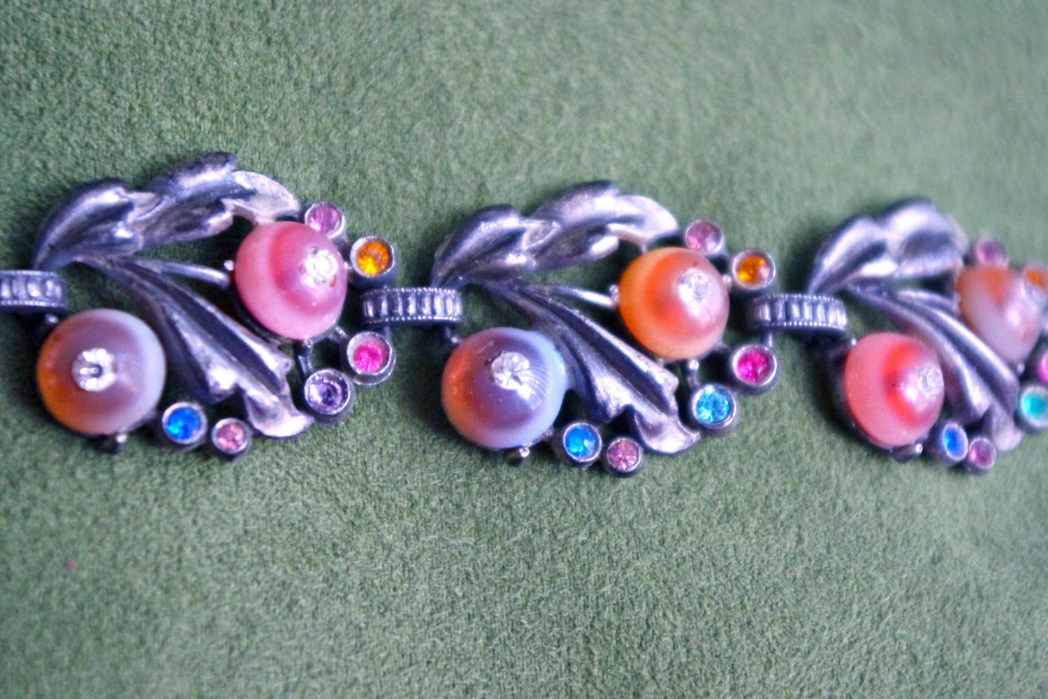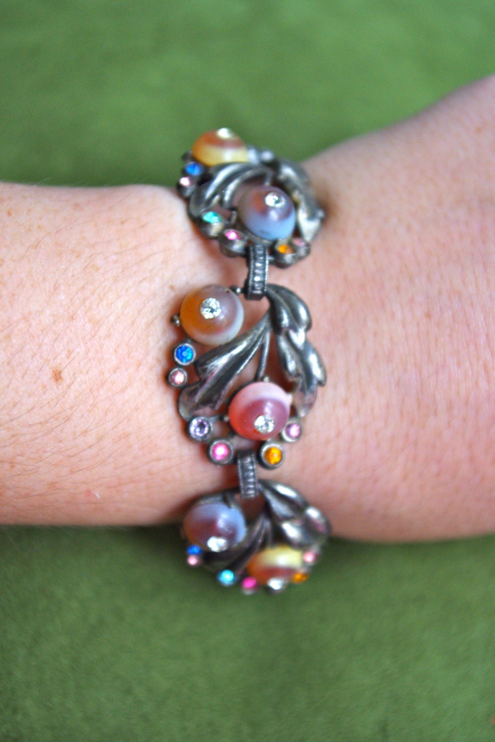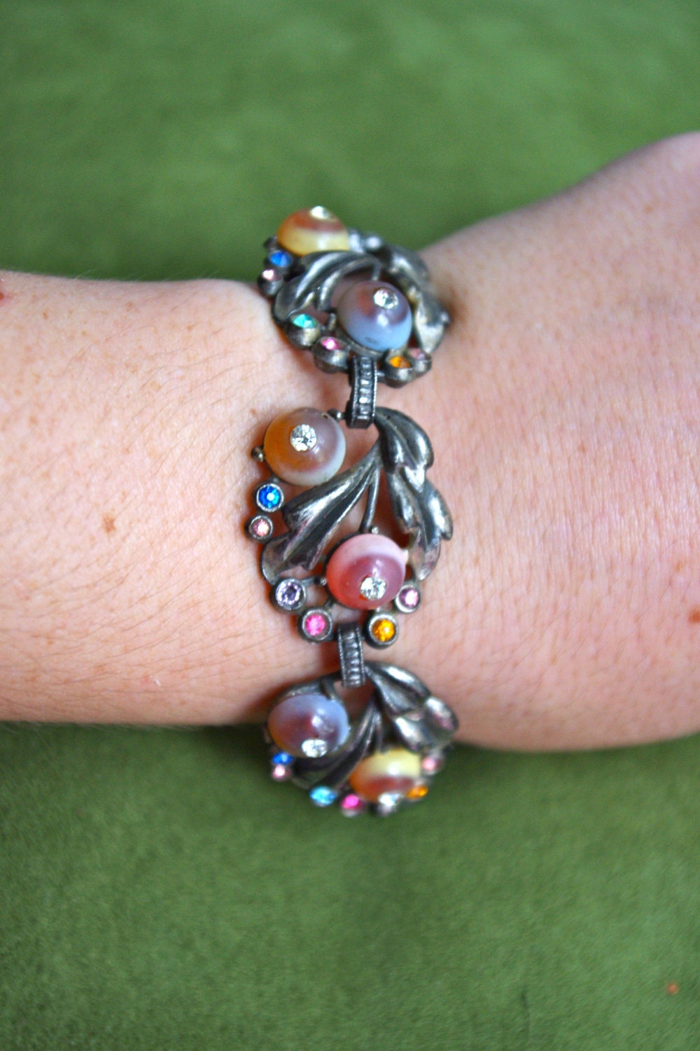This is a beautiful antique art nouveau frosted art glass with crystal's set inside the fruit salad art glass cabochons. Set in a cast silver pot metal and inlaid with multi colored crystals surrounding the frosted fruit. This is a very unique and collectible piece of art! Don't miss this bracelet that measures aprox. 7 inches by 1 1/4. one replaced cabochon.