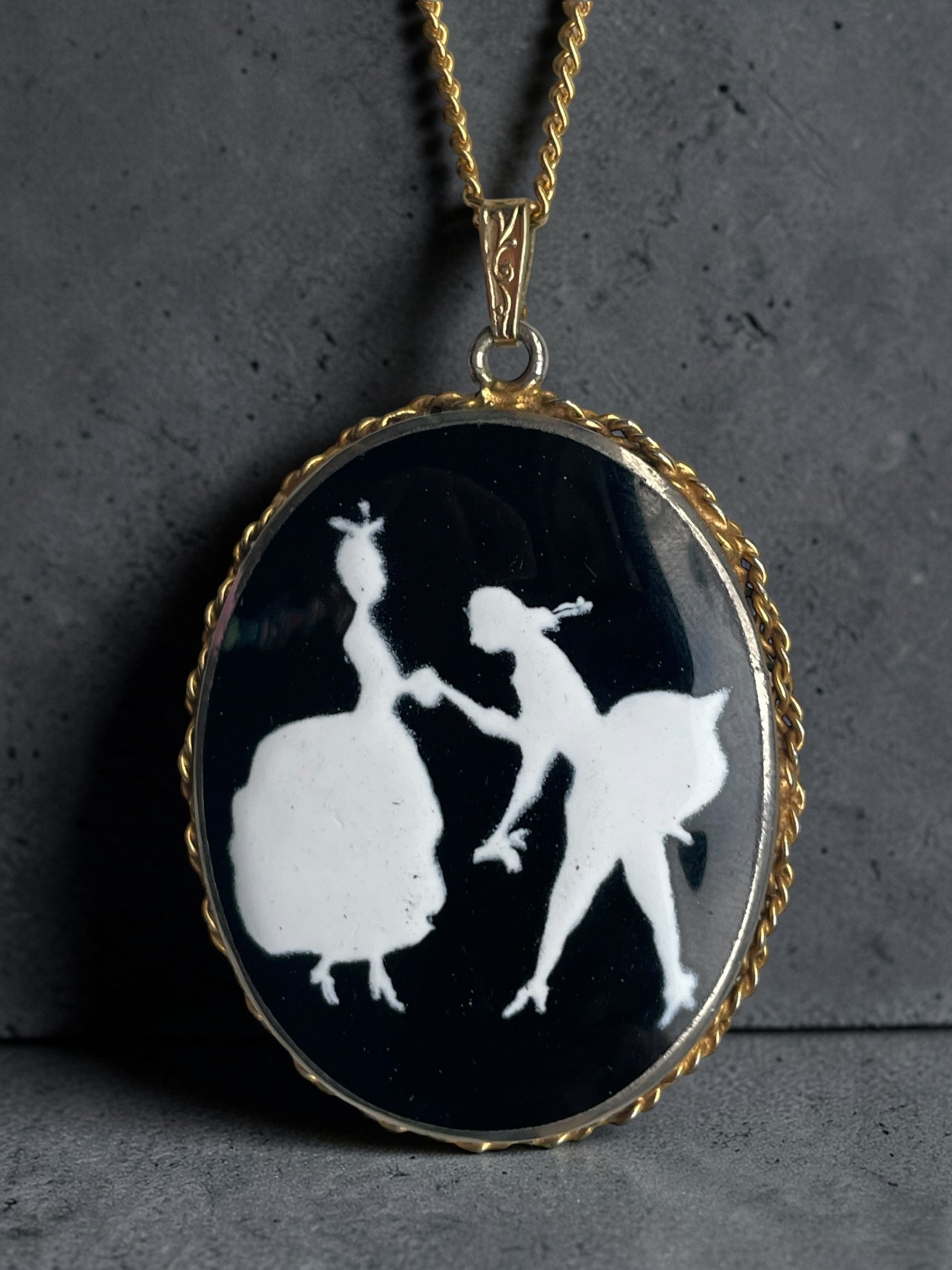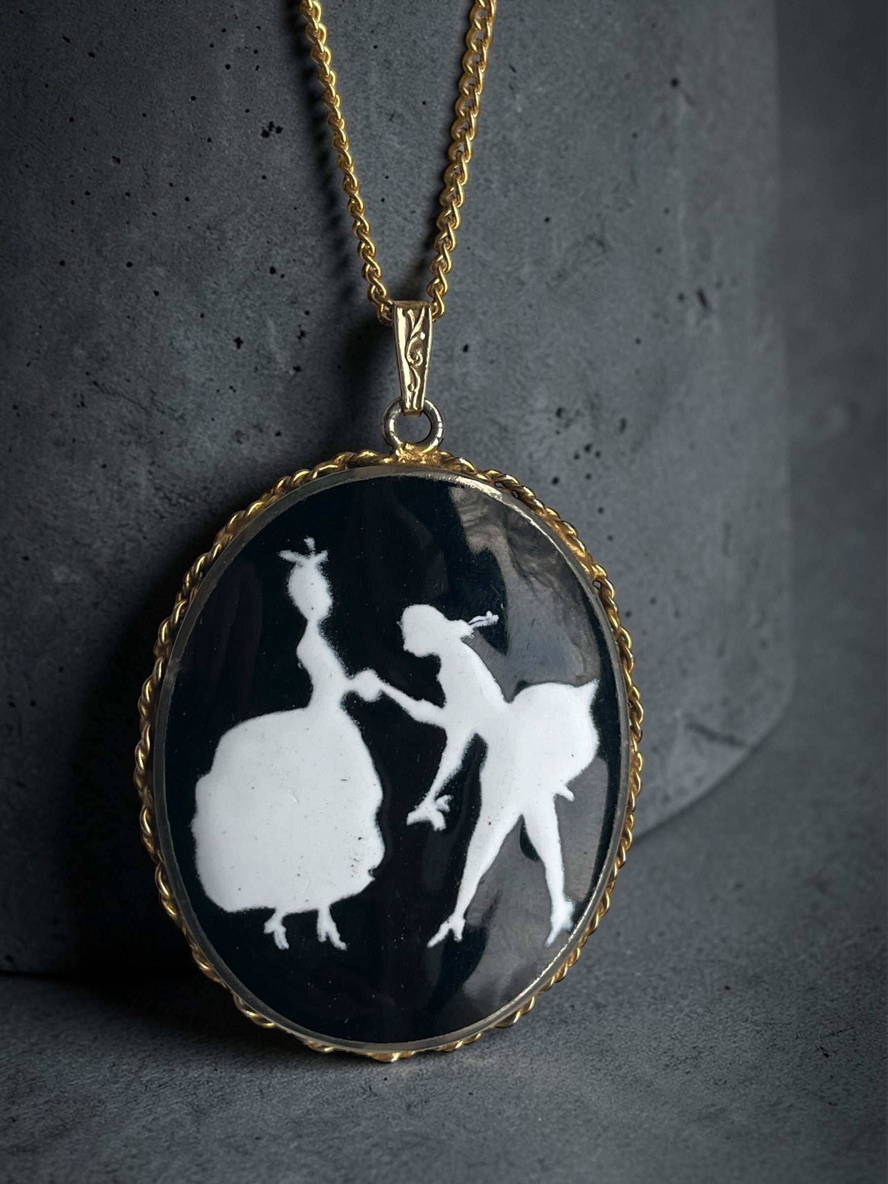 Incredible Victorian Black & White Porcelain Courting Couple Locket Necklace