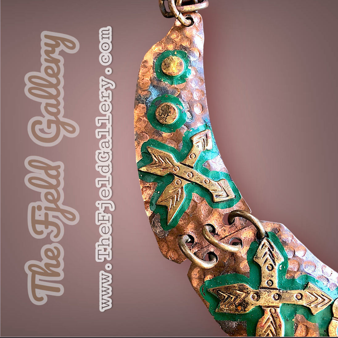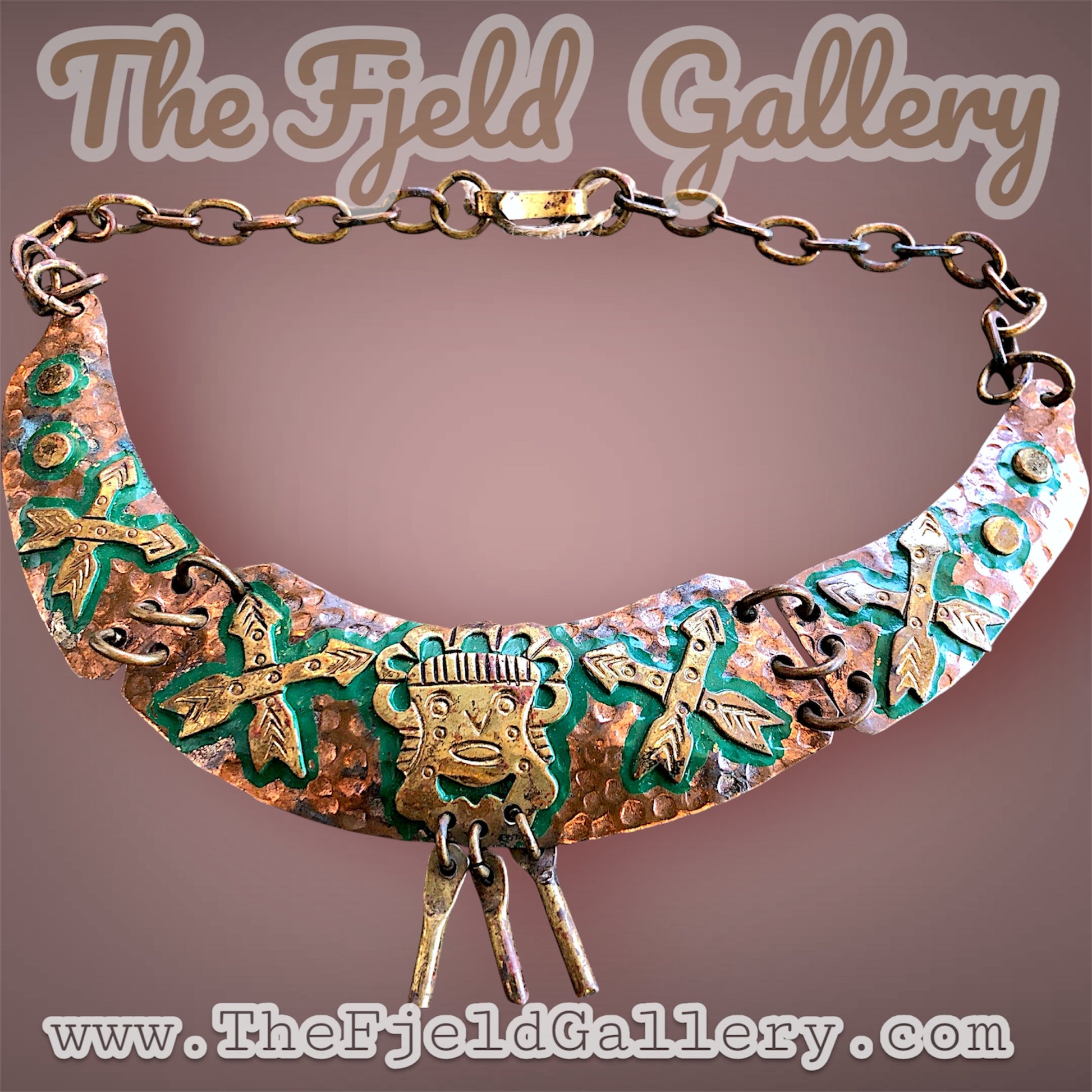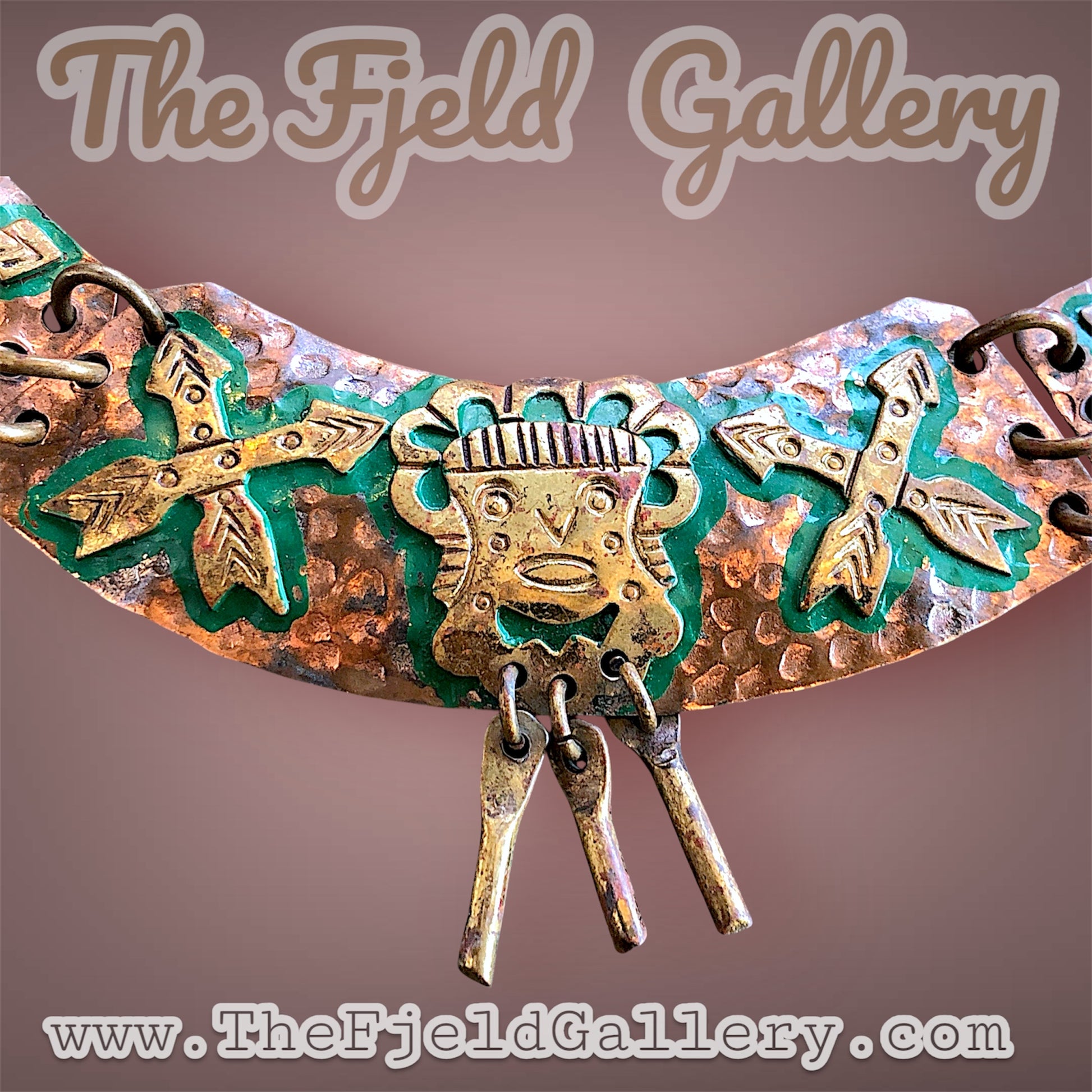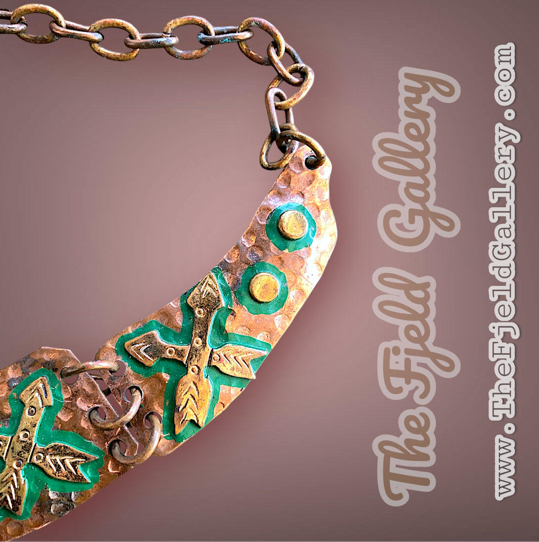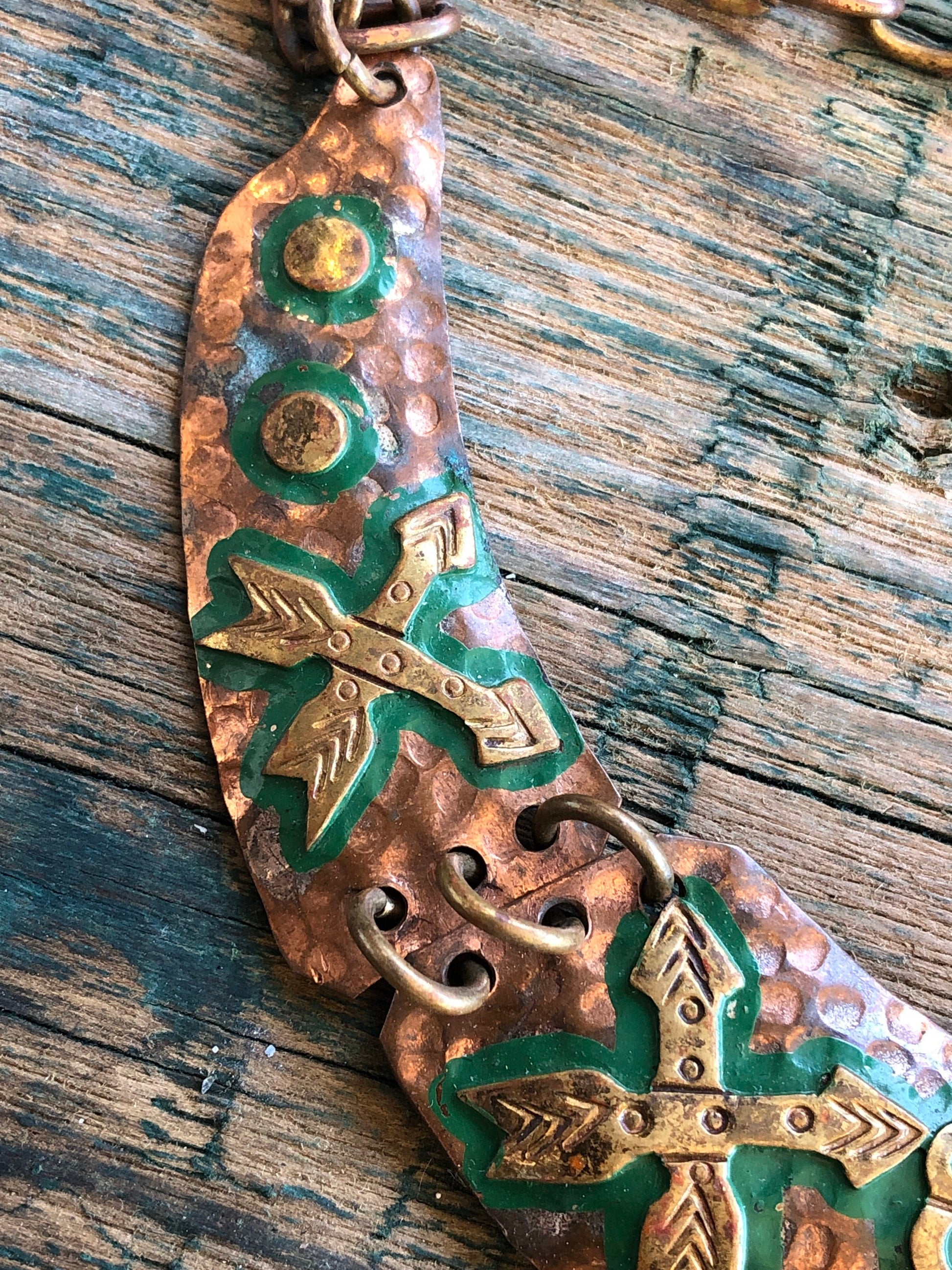 Mexican tribal hand hammered copper and brace tribal mask and arrow choker necklace