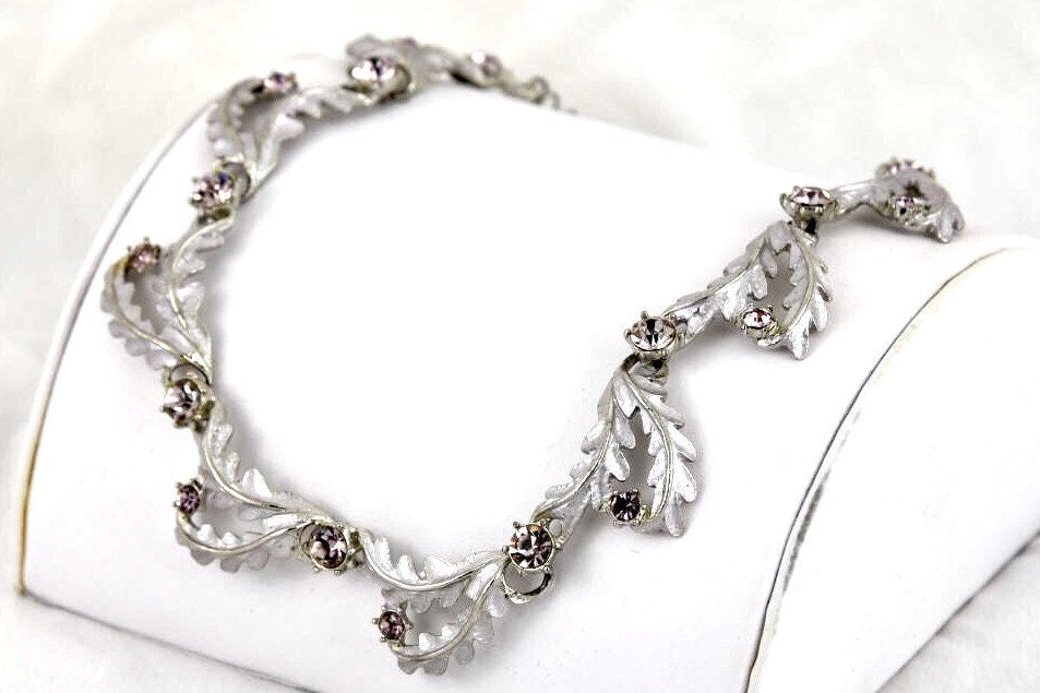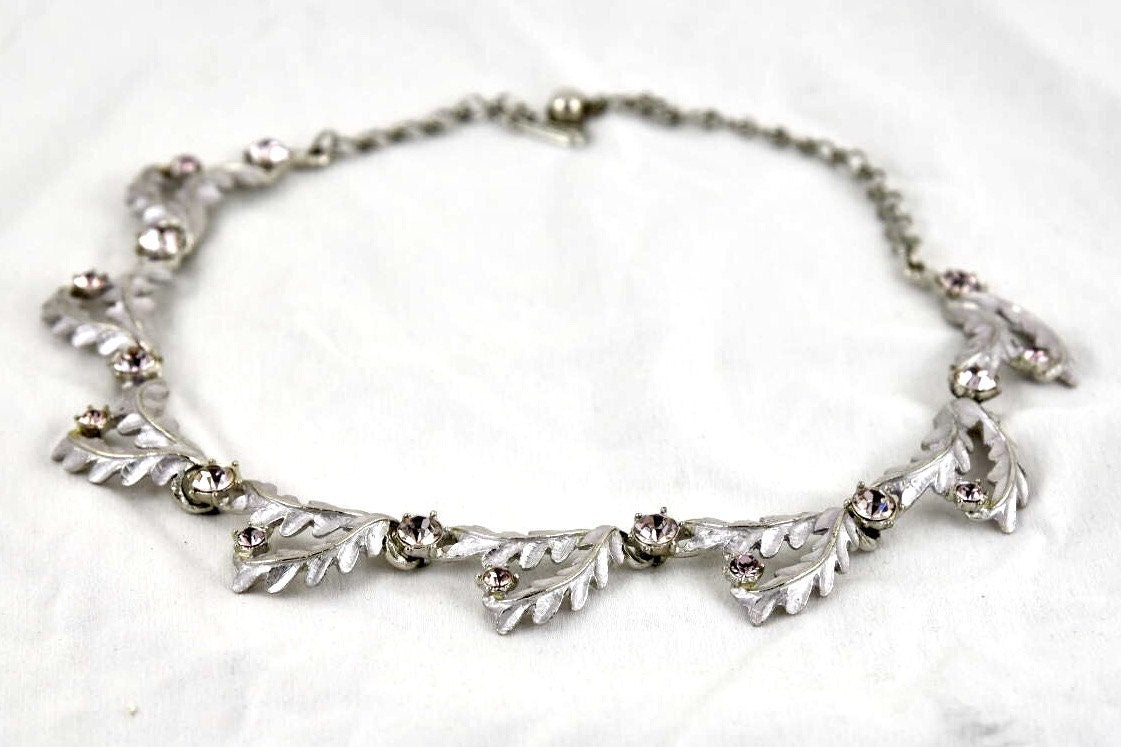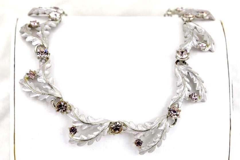This is a beautiful vintage rhodium plated mid century modern hollywood glamour necklace. Art Nouveau inspired leaf link design set with pale rose pink round crystal stones.