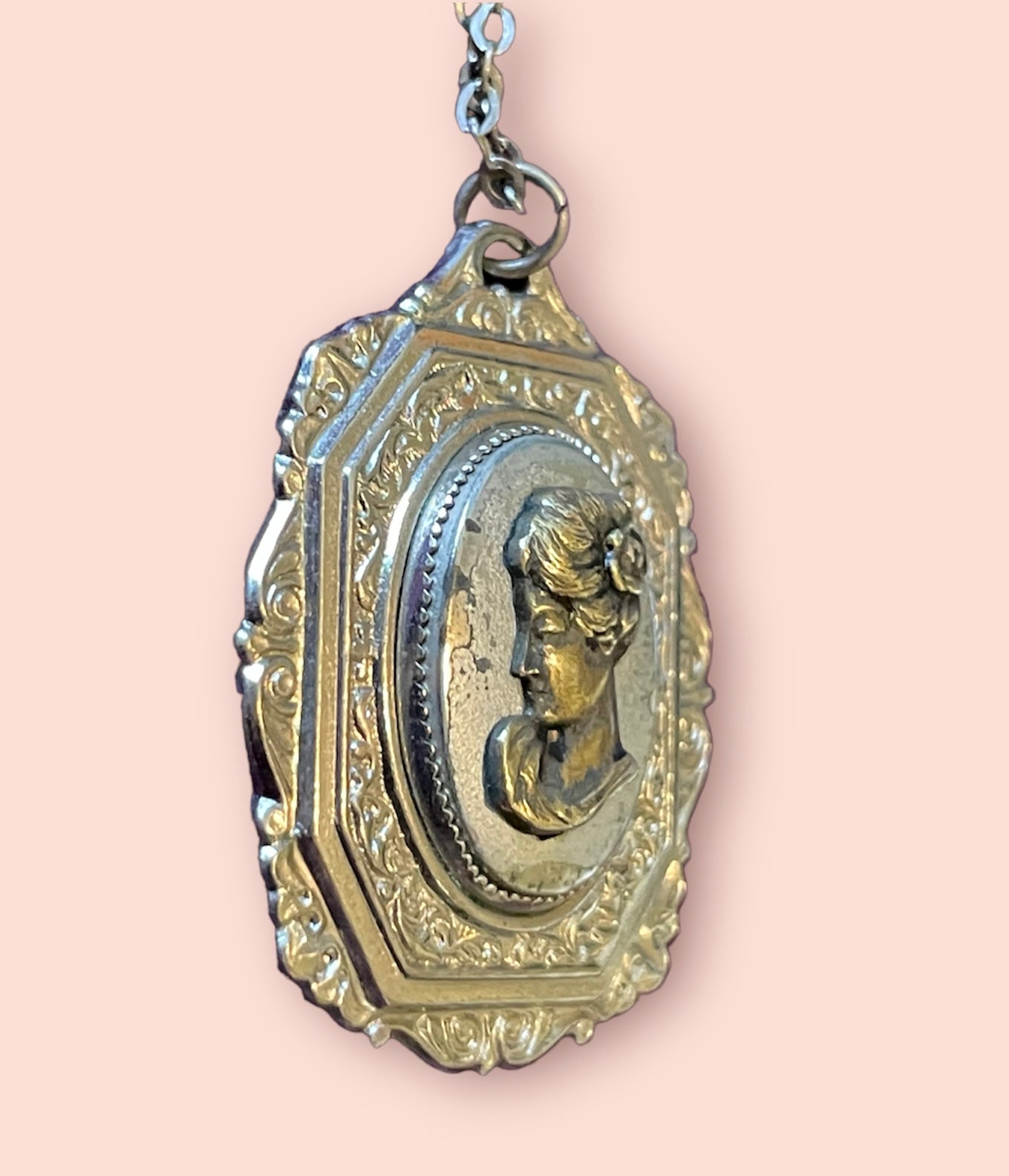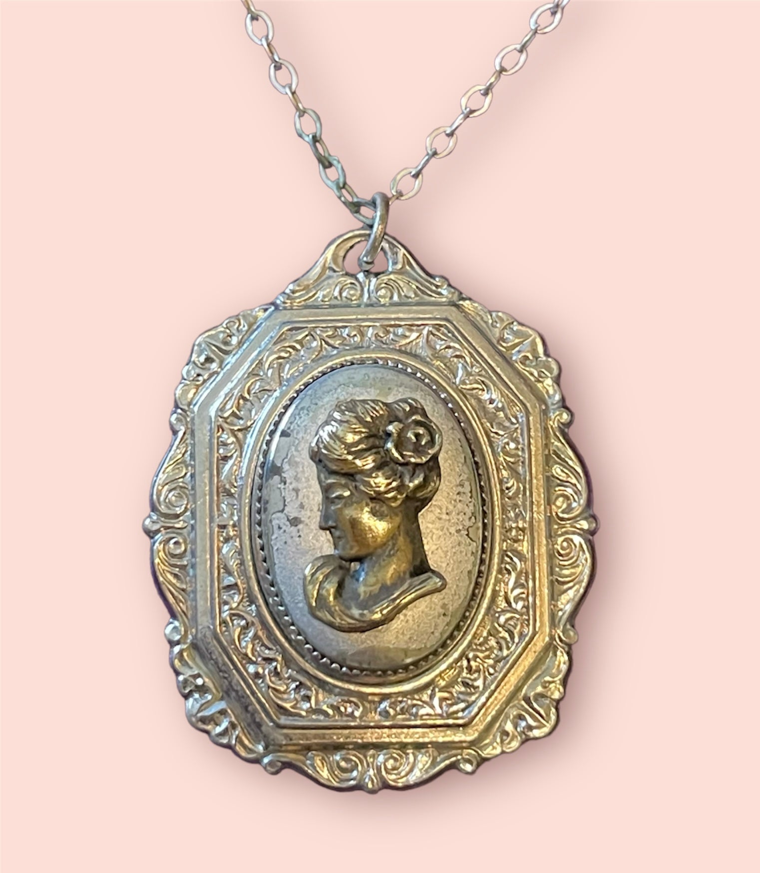 Vintage mixed metal silver and gold metallic cameo necklace.