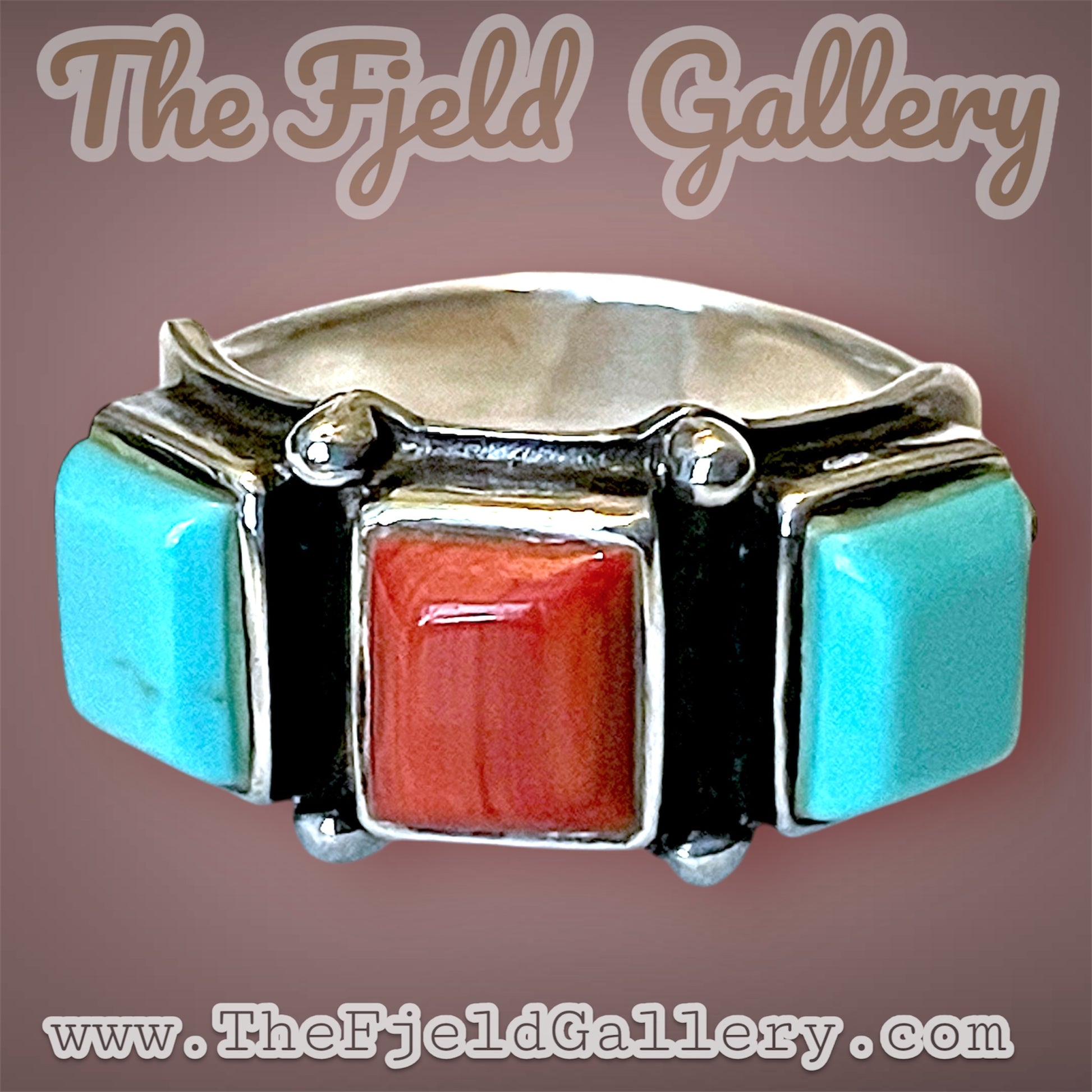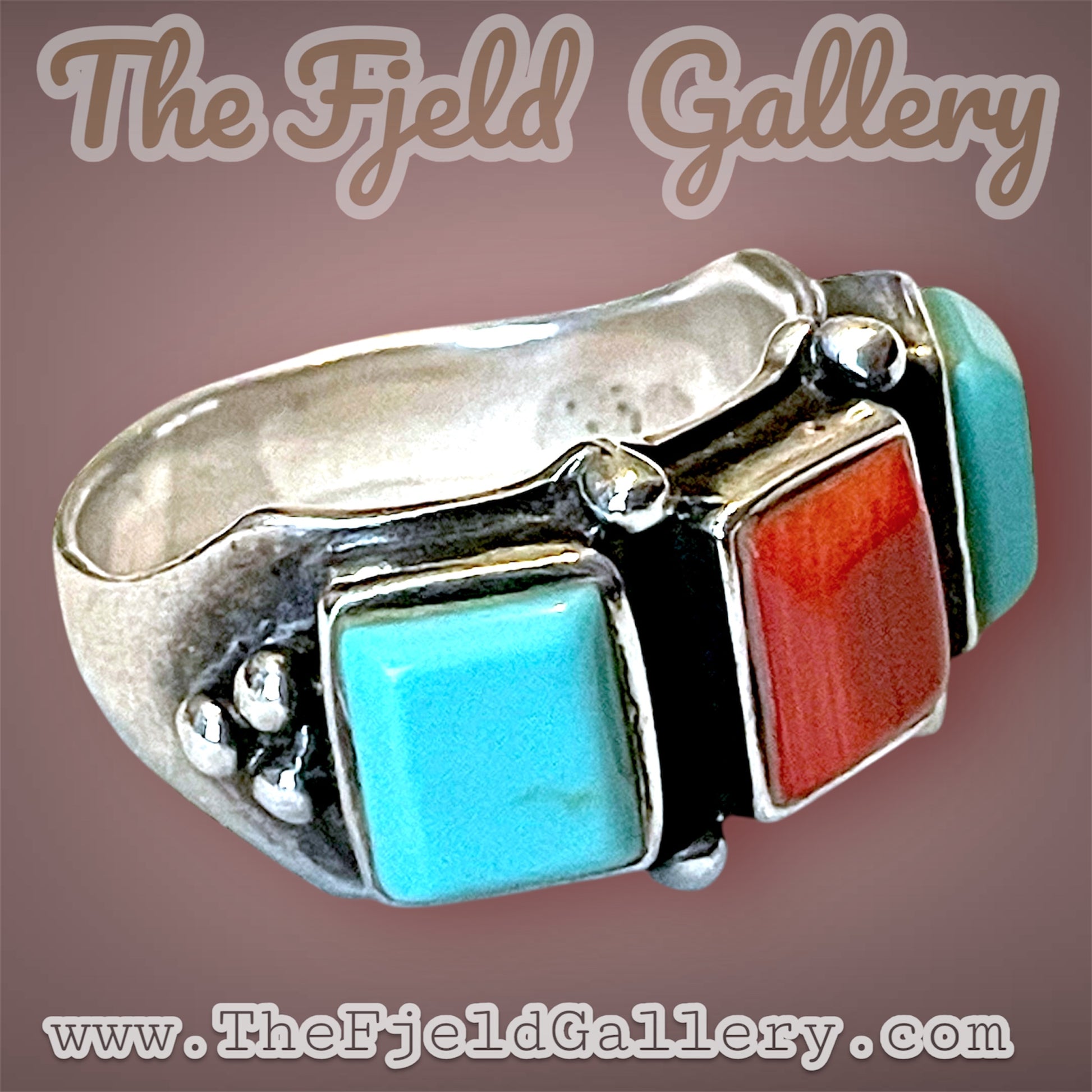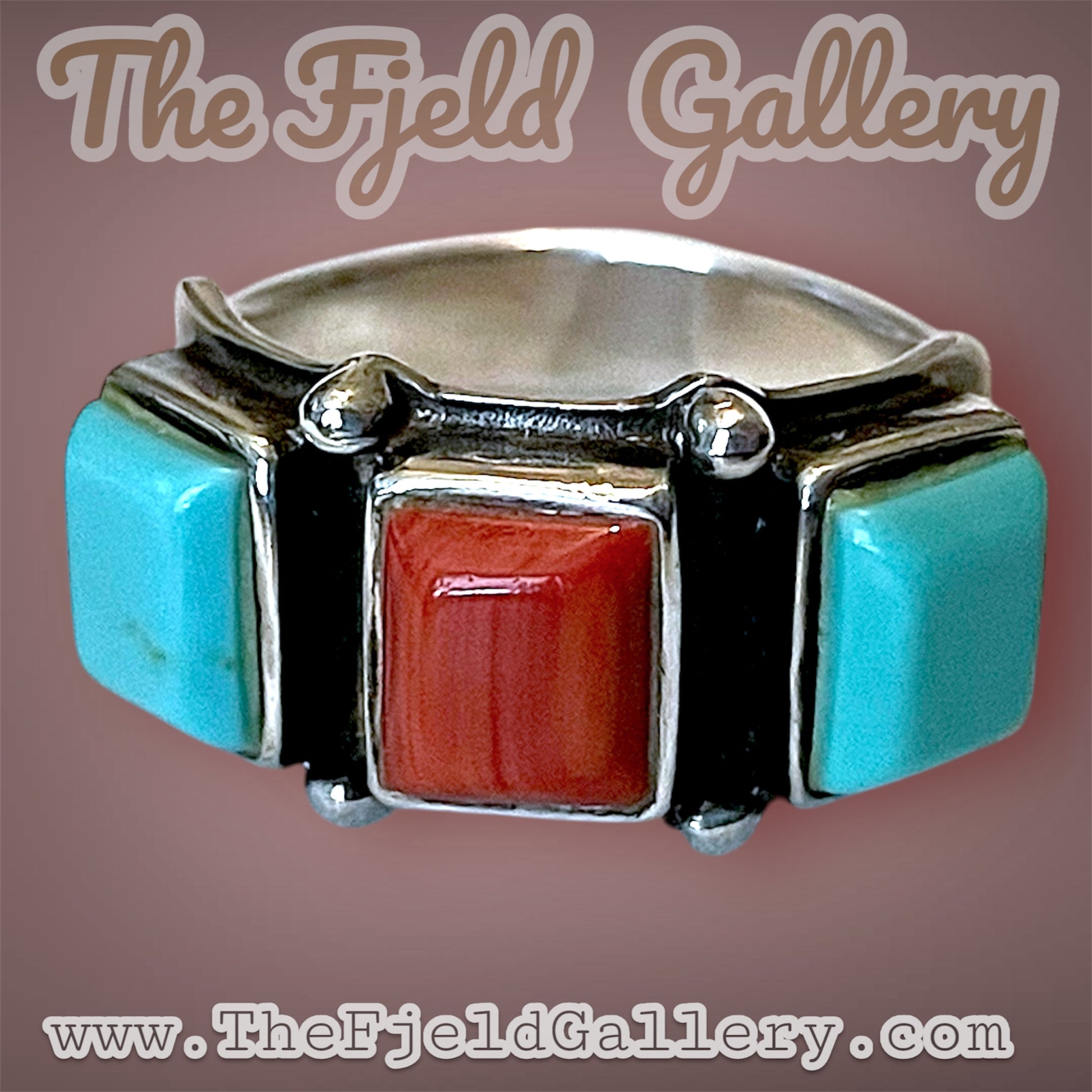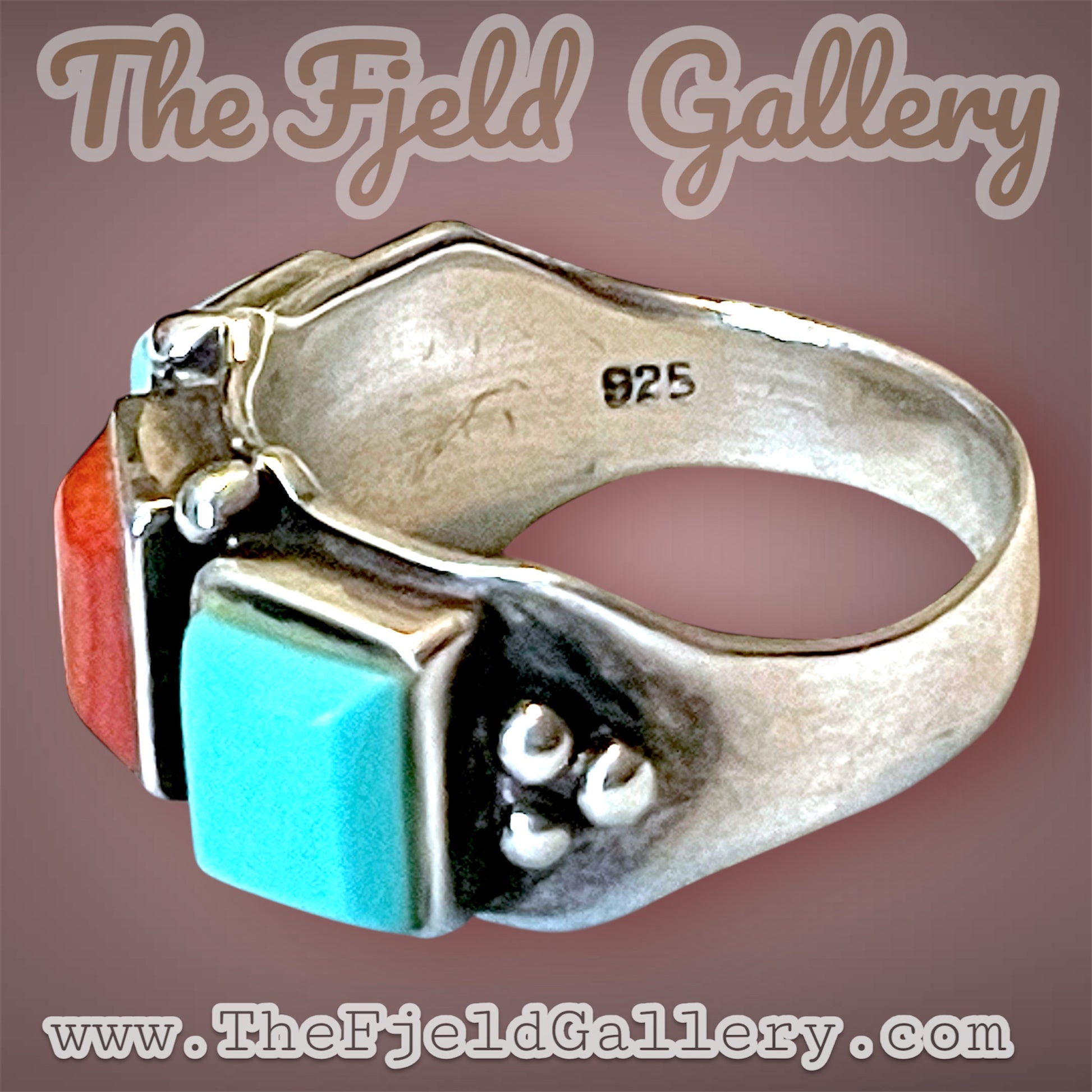 Native American 3 Stone Turquoise & Red Coral Geometric Band Ring