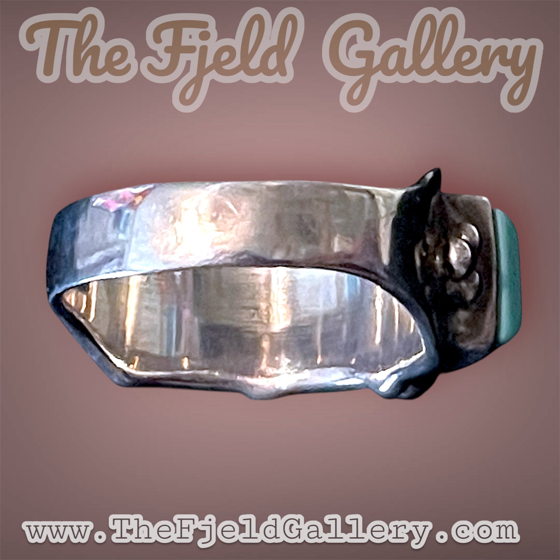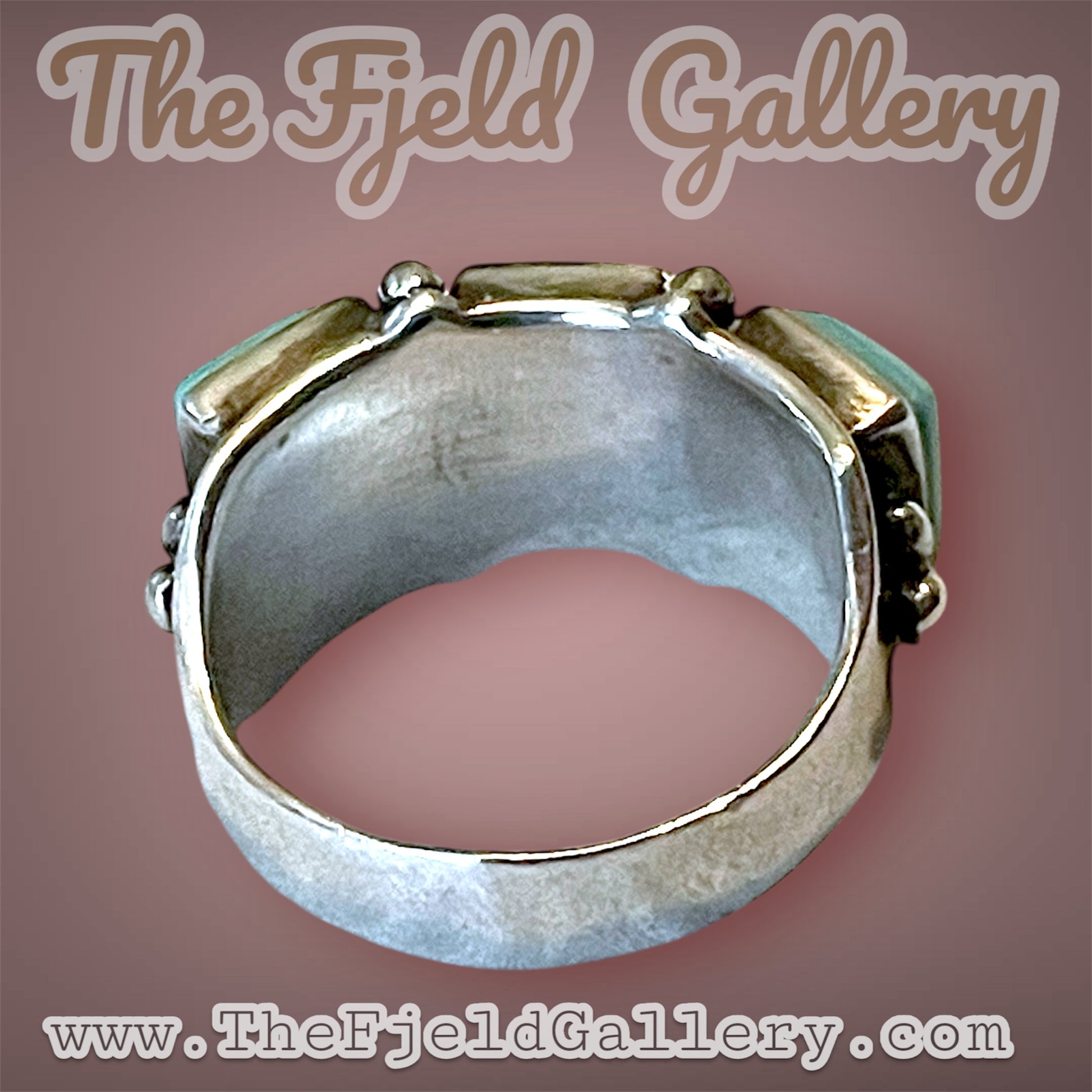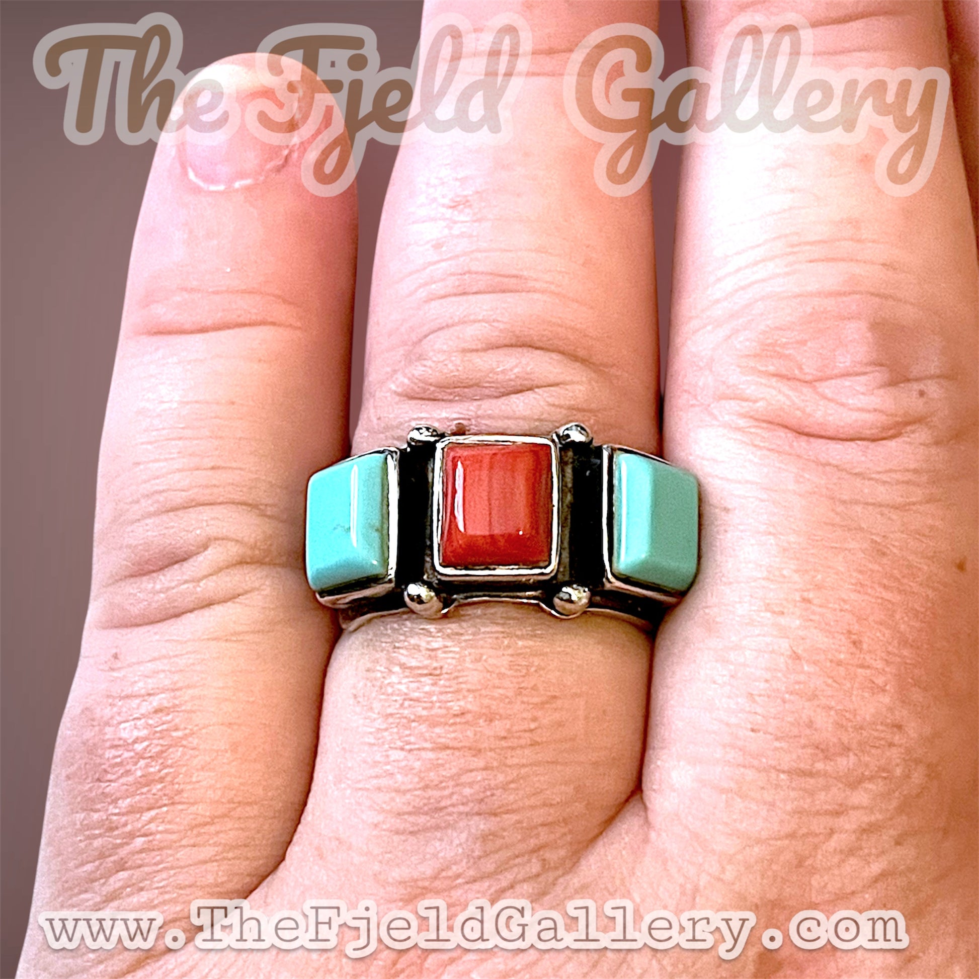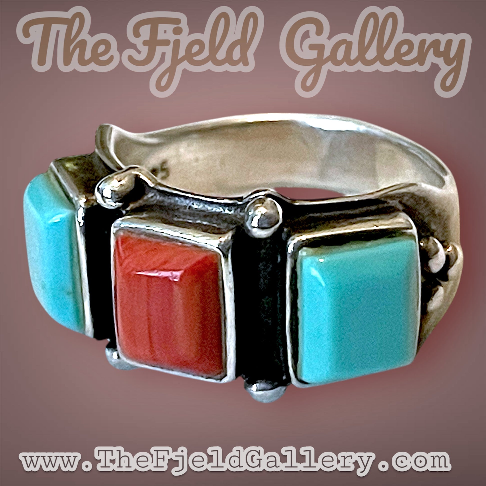 Native American 3 Stone Turquoise & Red Coral Geometric Band Ring