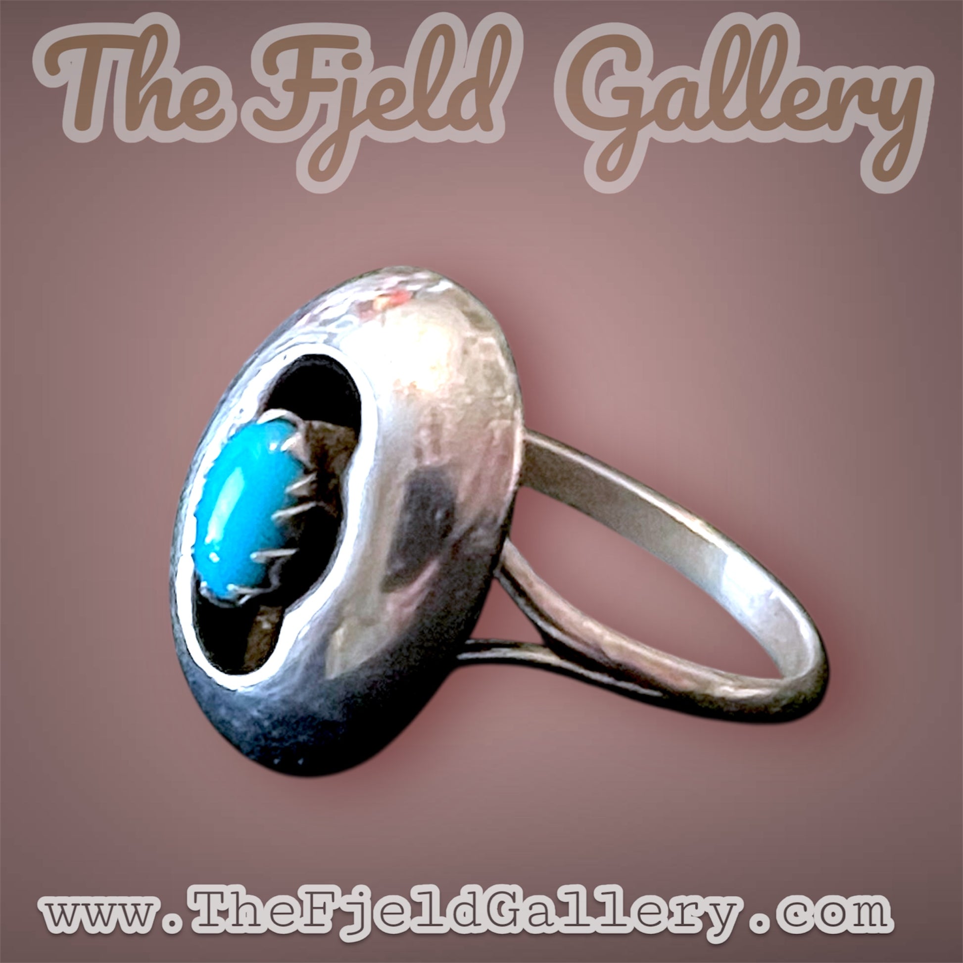 Super cool sterling silver Native American shadowbox style ring with a bezel set turquoise gemstone in the center. Matching cuff bracelet available in separate listing. No hallmarks found.
