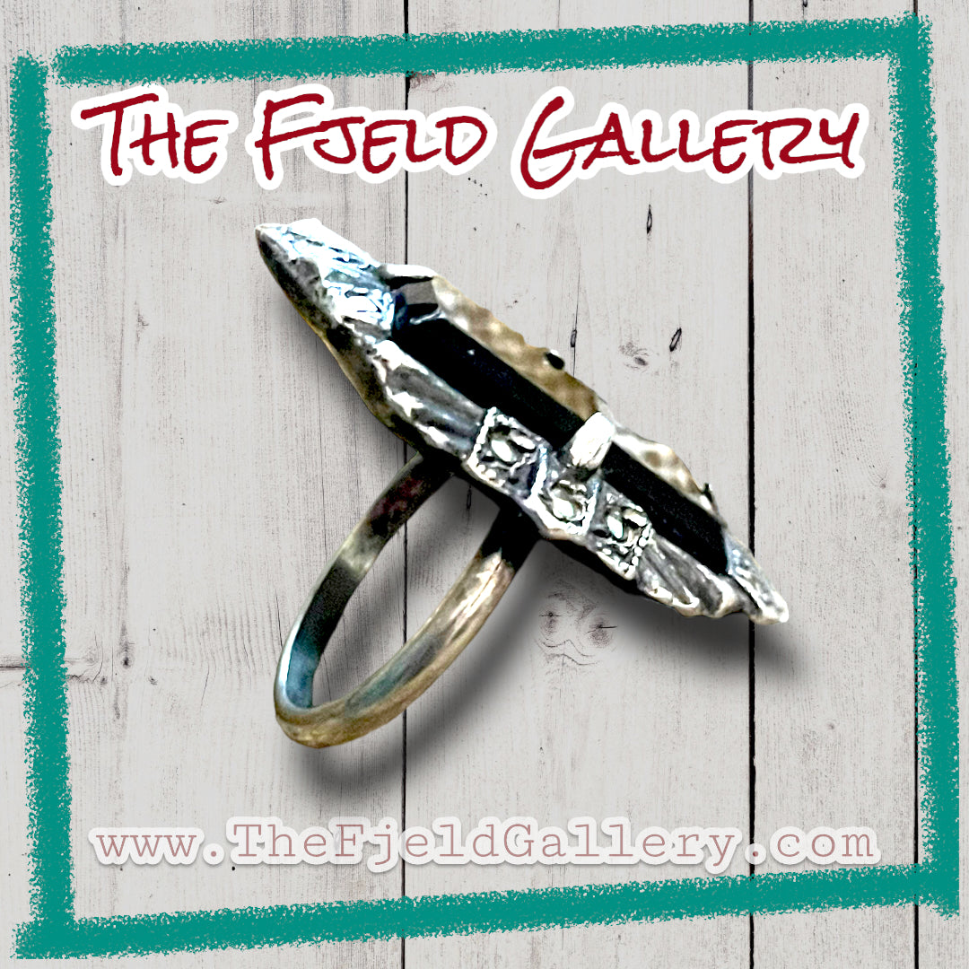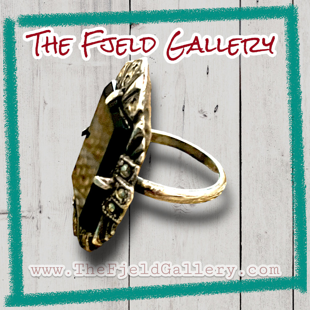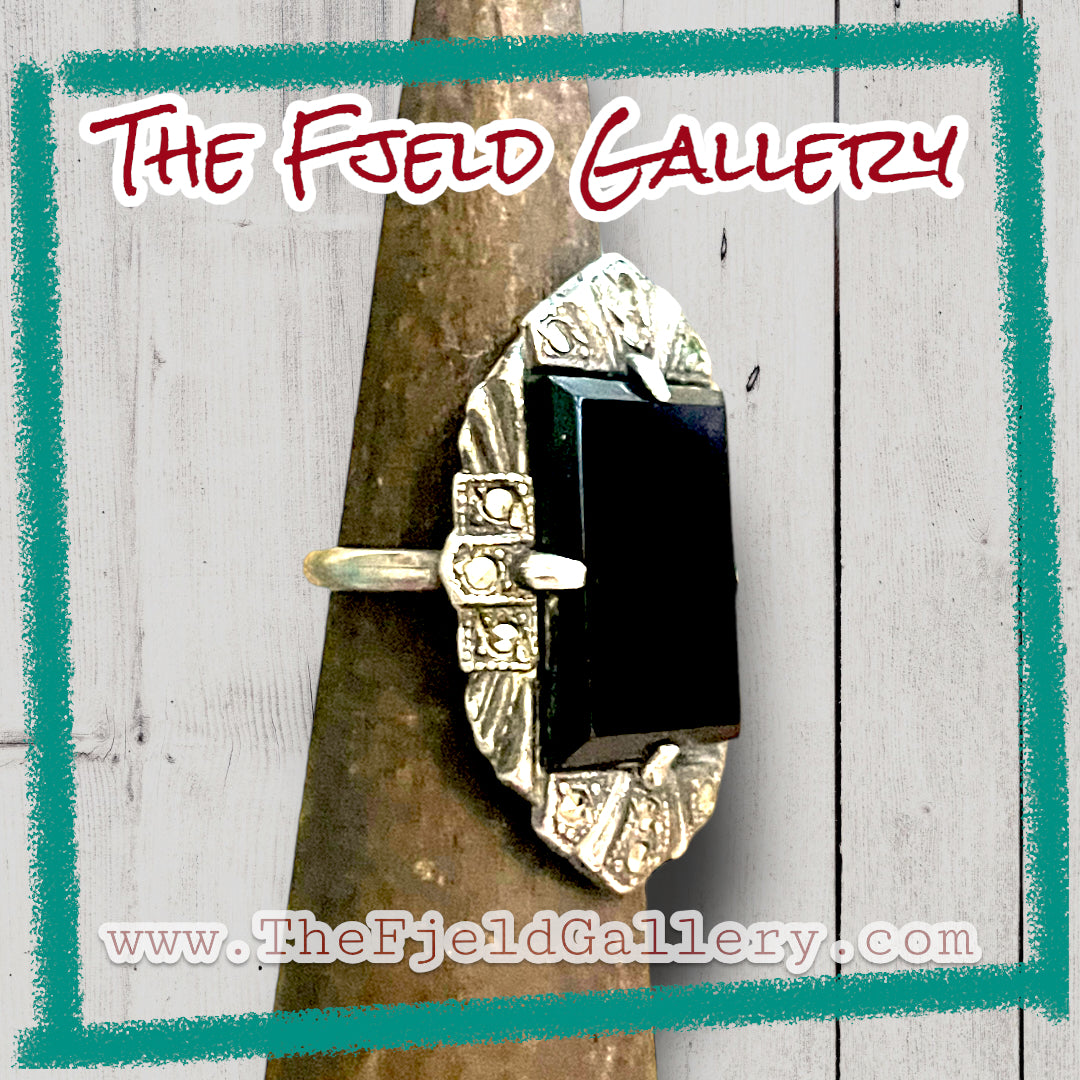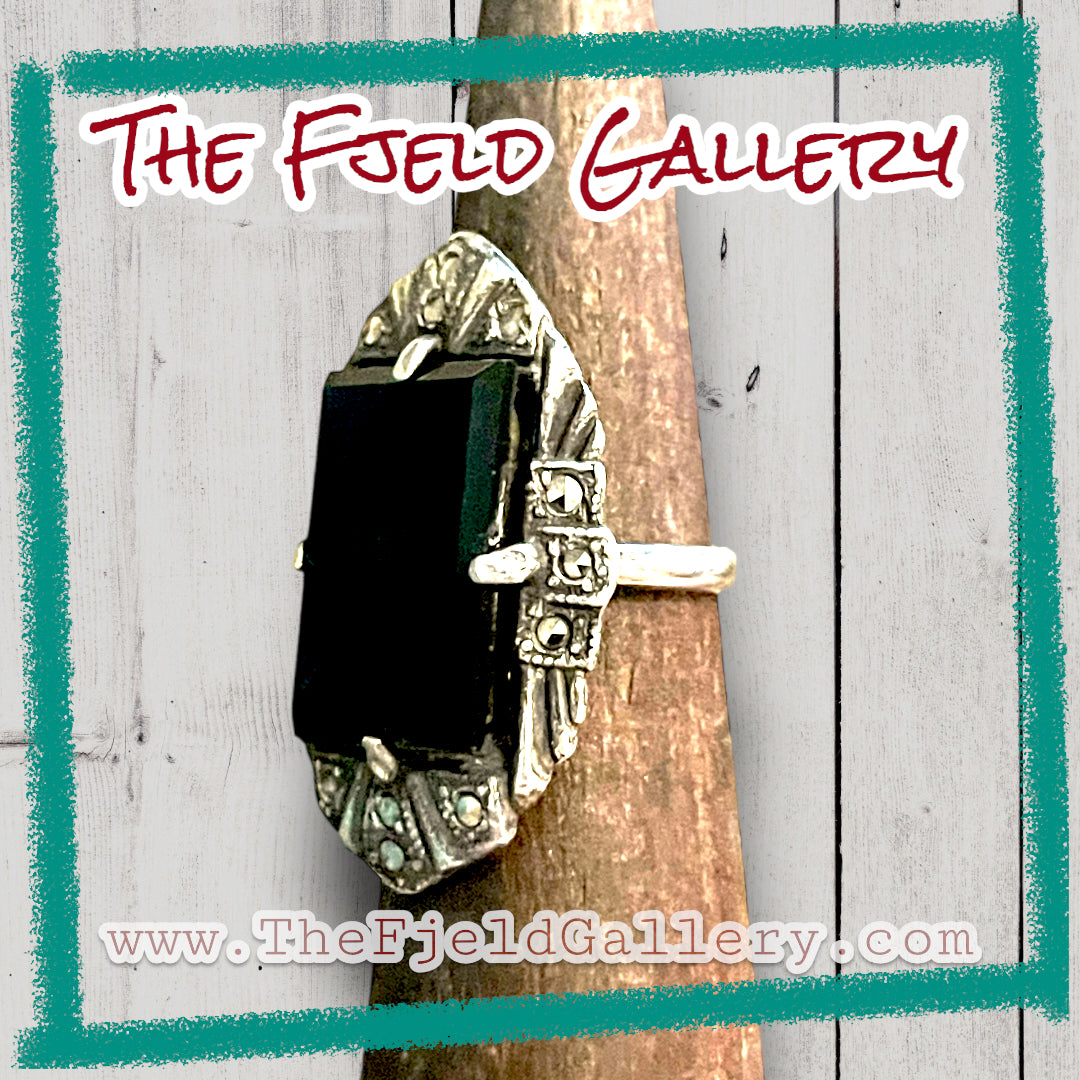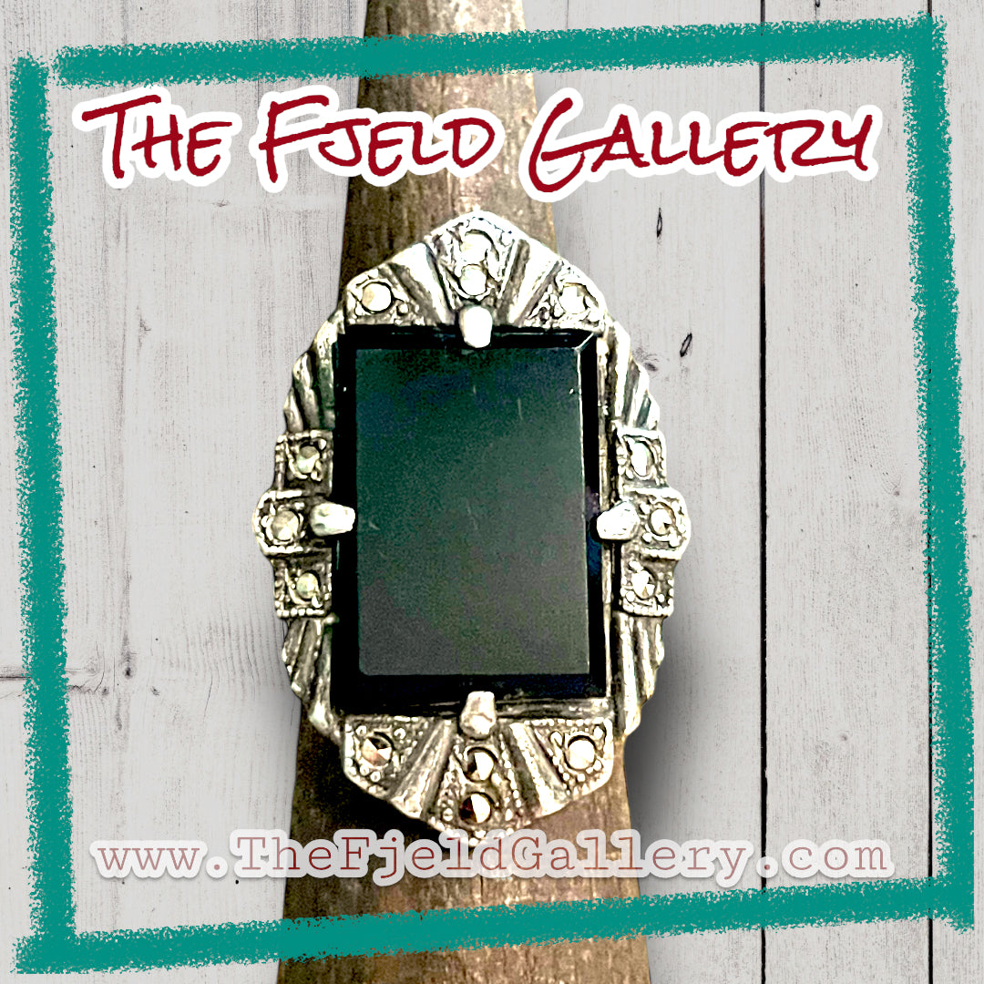 Onyx Faceted Rectangle Prong Set Art Deco Sterling Silver Marcasite Ring