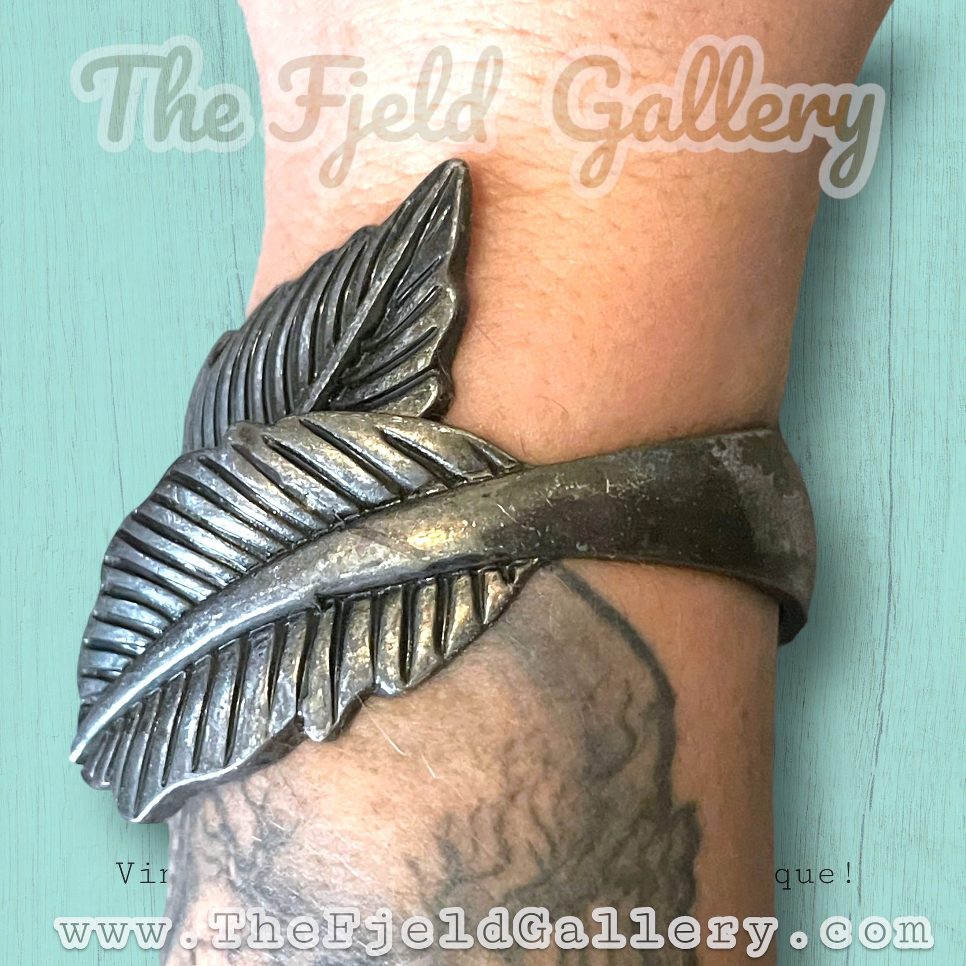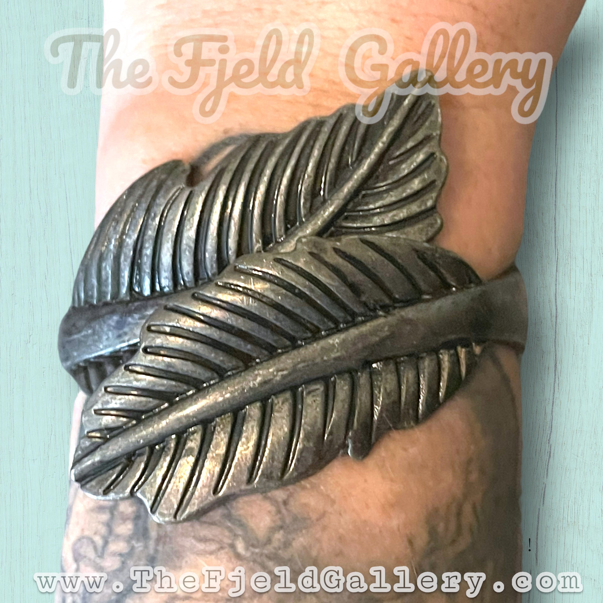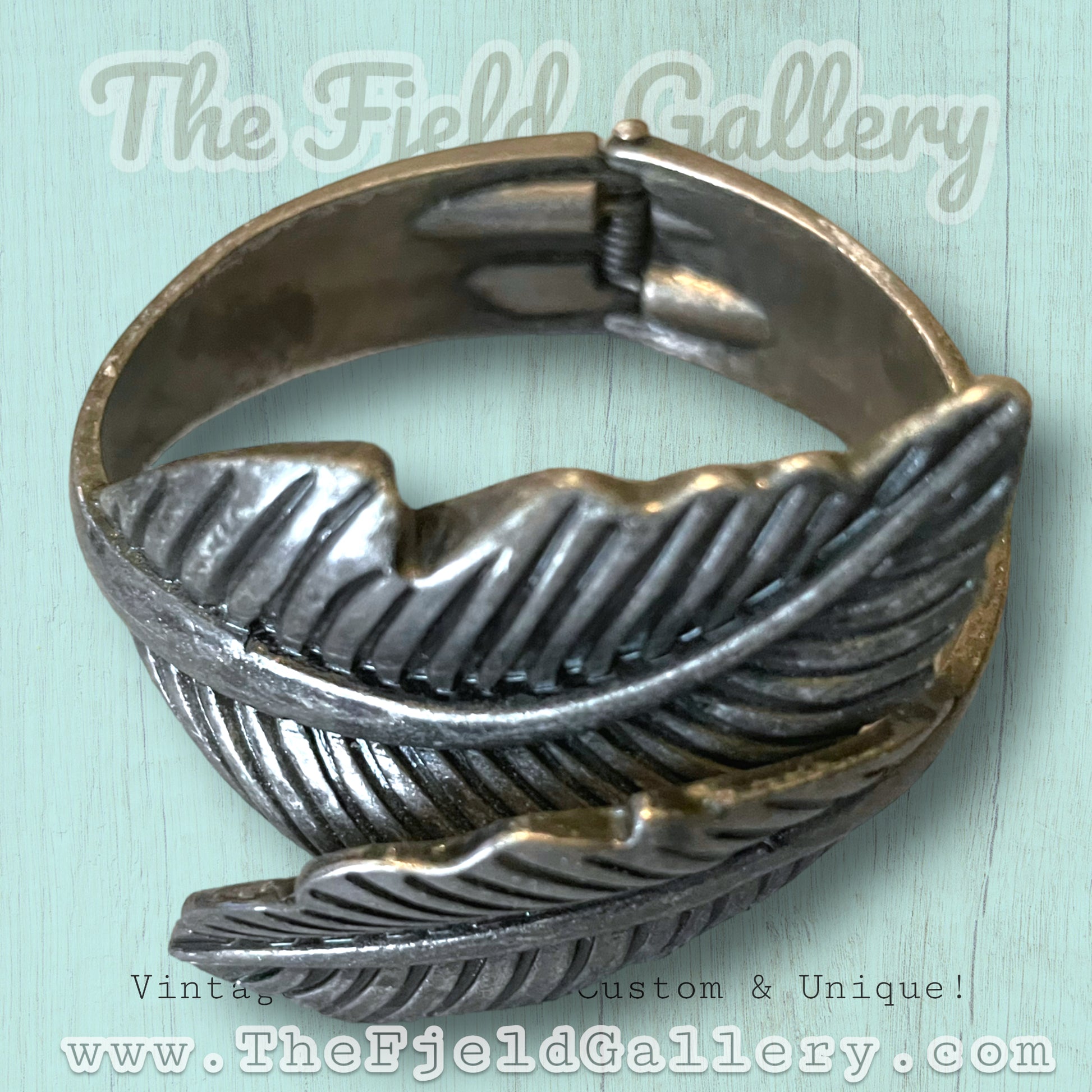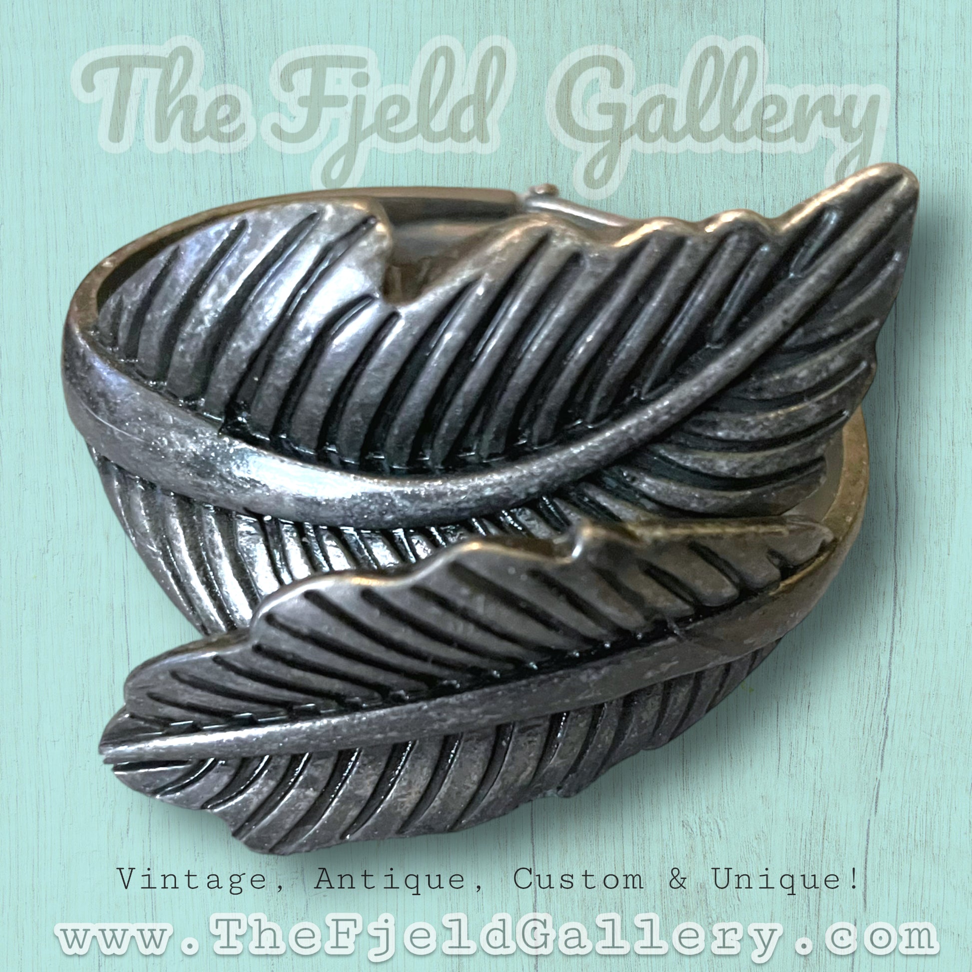 Pewter silver hinged clamper bypass bracelet. Two leaves bypass each other across arm. c.1970’s