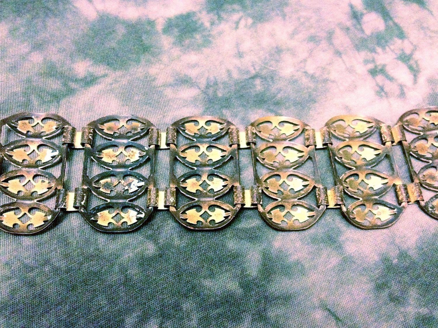 This is a beautiful vintage brass open work filigree design bookchain linked bracelet with white enamel splatter detailing on each art nouveau detailed link. Very unique and beautiful.