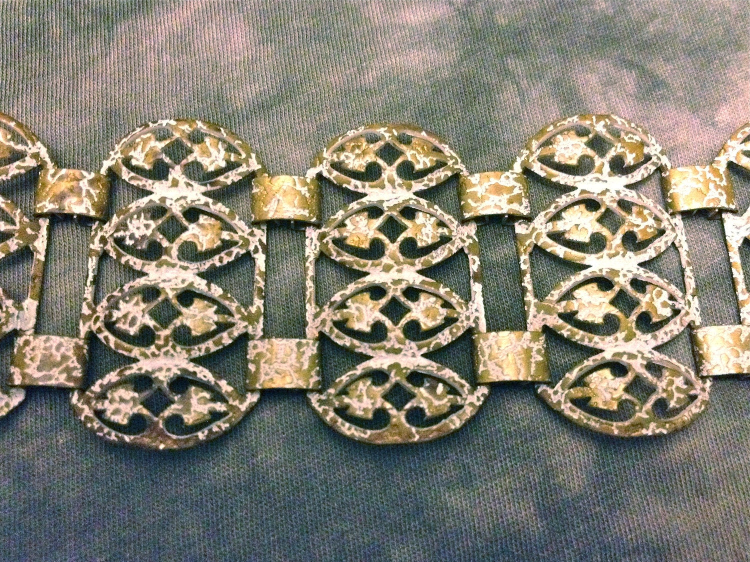 RARE Beautiful Vintage Brass Open Work Filigree Art Nouveau Bracelet with Aged White Enamel Splatter Detail