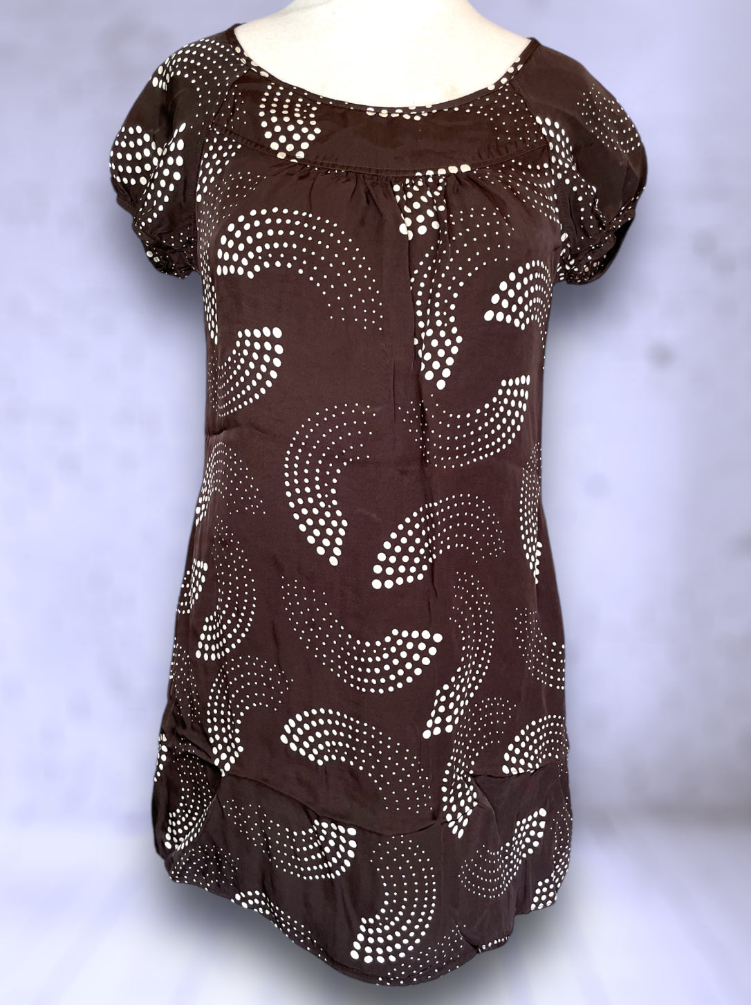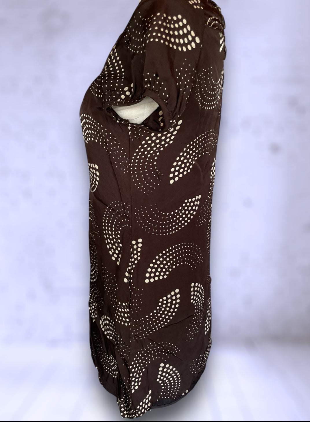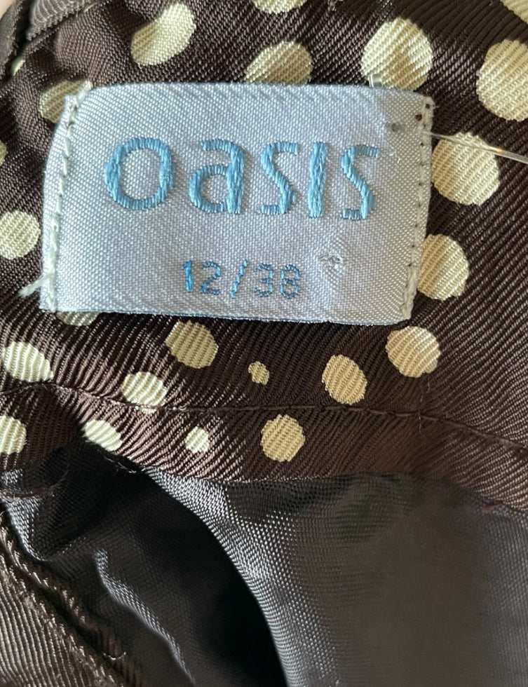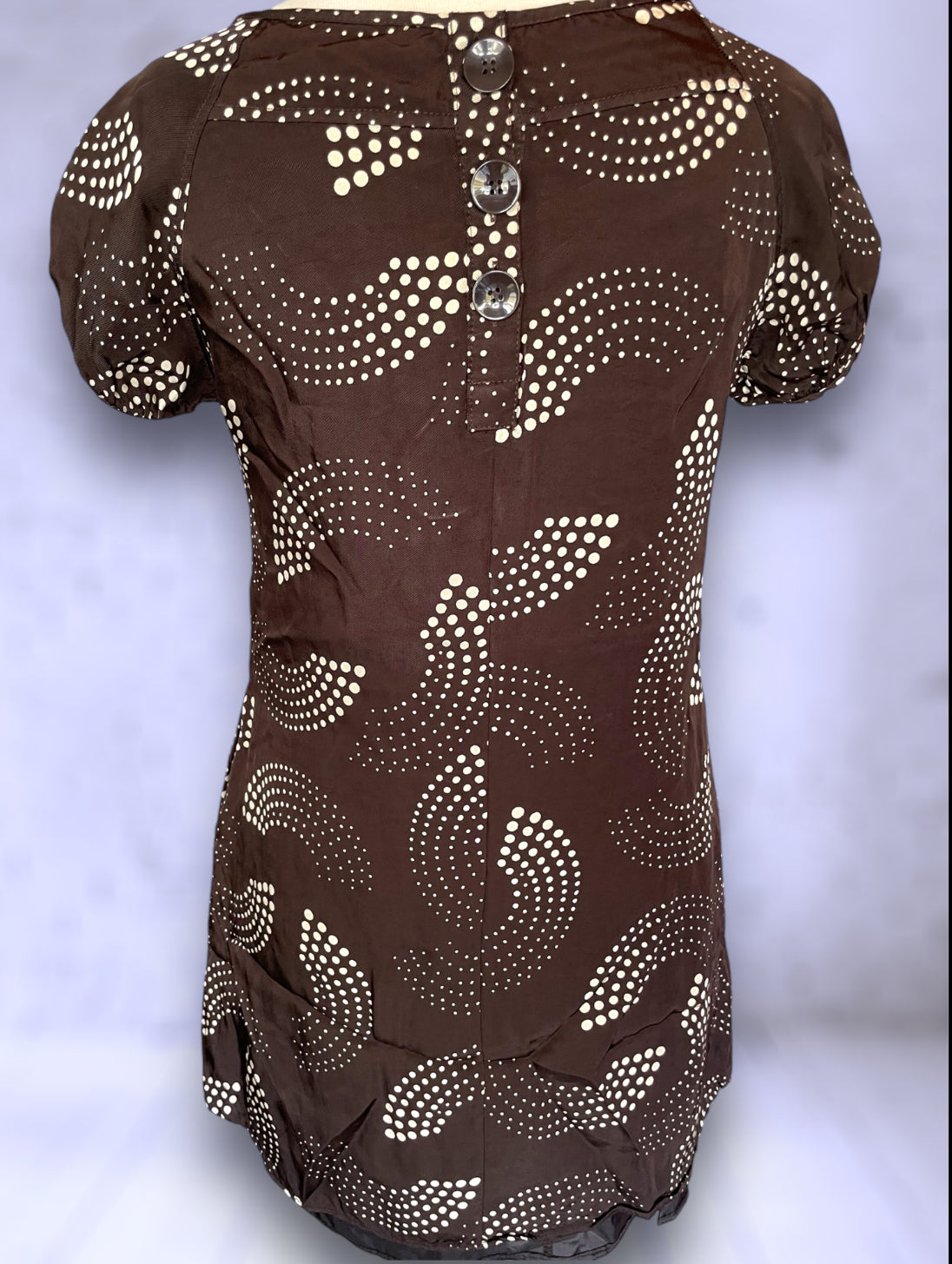 Adorable 1990’s retro mini dress in the 60’s style with pockets. Brown with cream colored abstract design polka dots. Back has large brown buttons. Short sleeves with a bit of a bubble. Baggy style shirt shift dress. Label says “Oasis” / Size: “12/33”. No damage or condition issues.