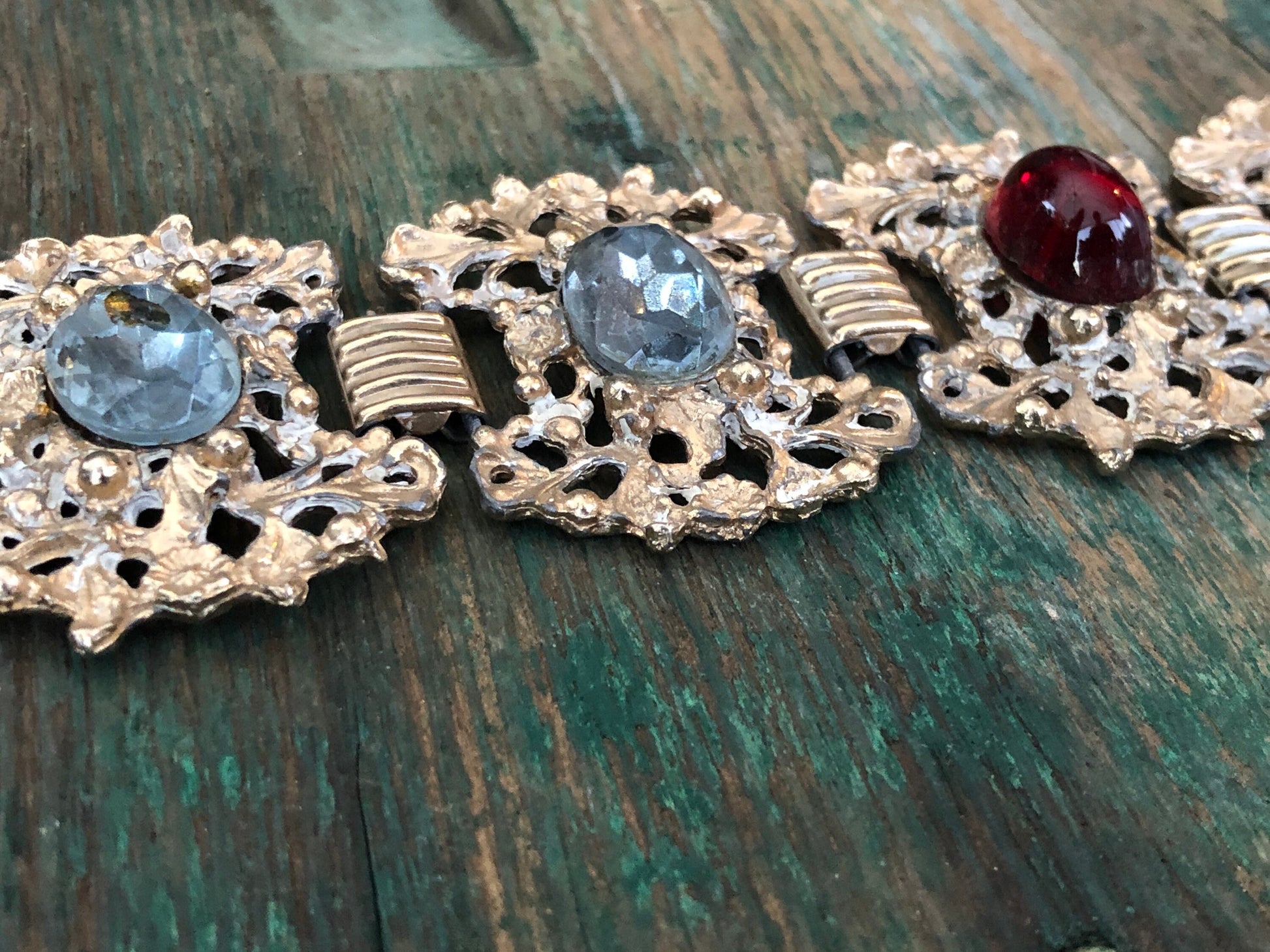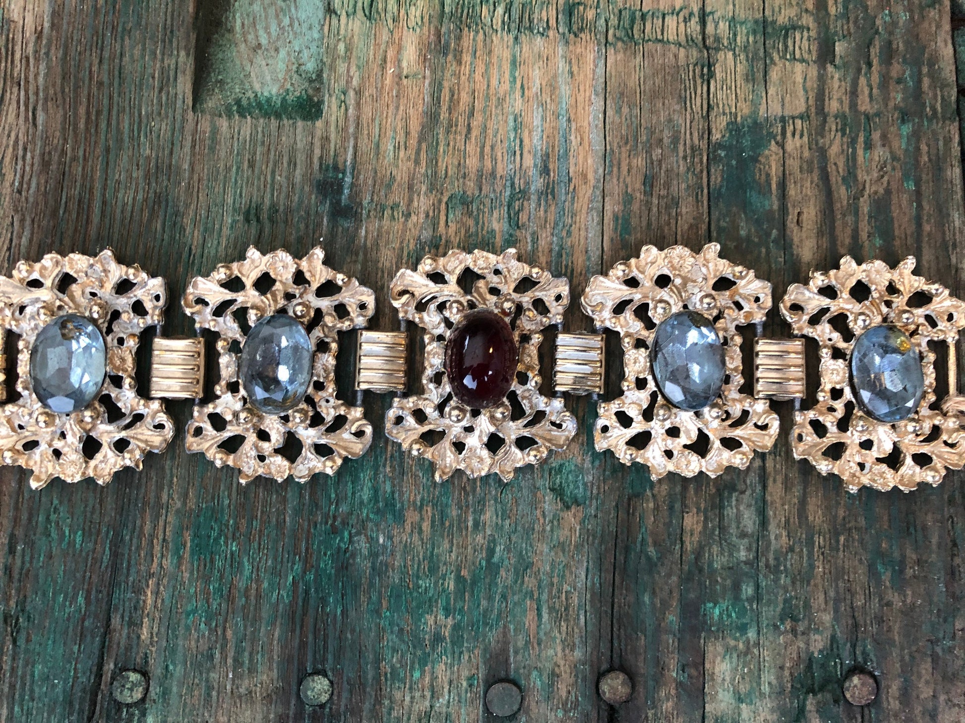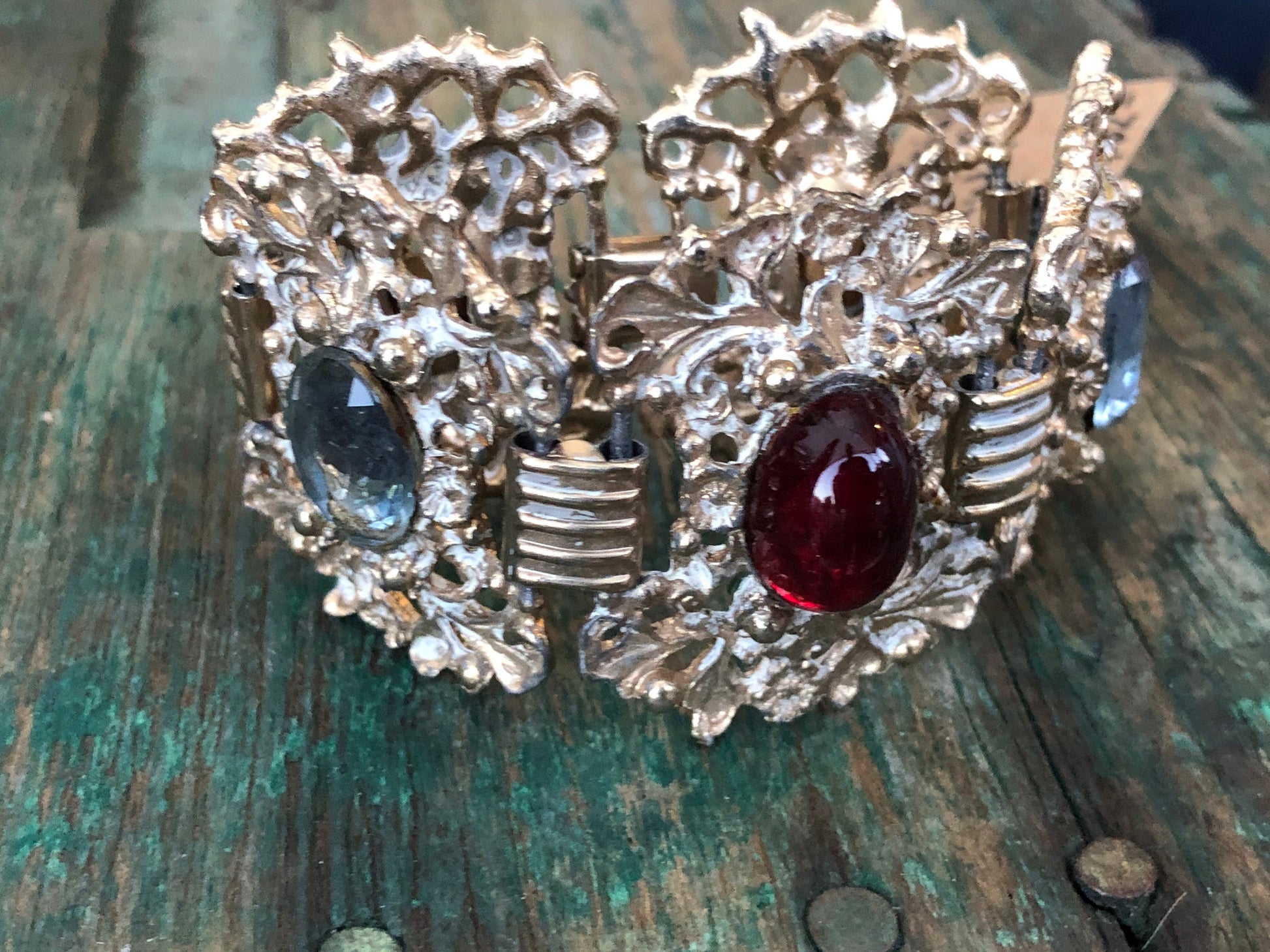 Beautiful bright gold floral, flourish, Rococo style chunky panels with blue faceted crystals and a red art glass in the center panel. Connected with book chain links and a fold over clasp. In amazing condition, no damage or condition issues.
