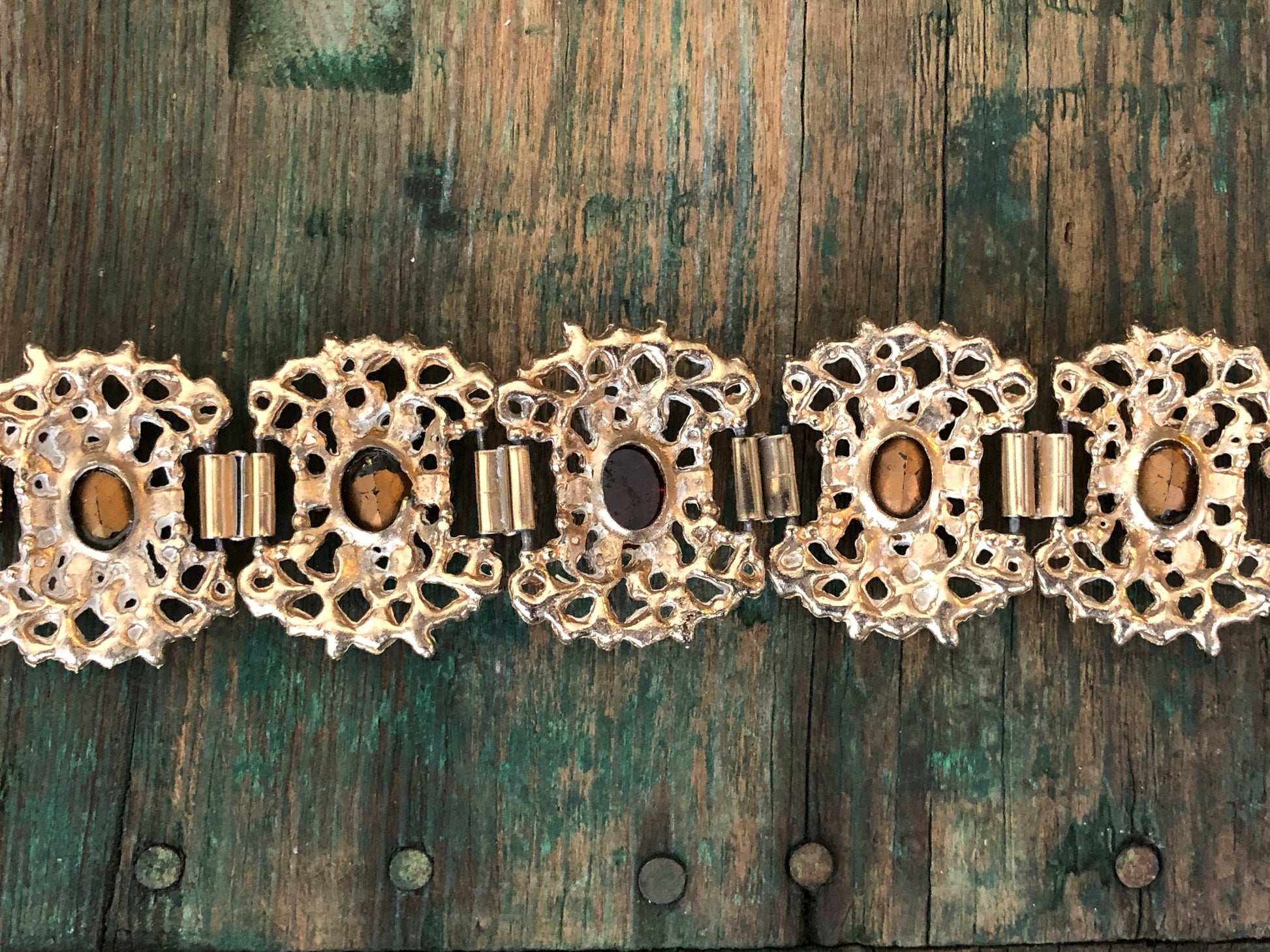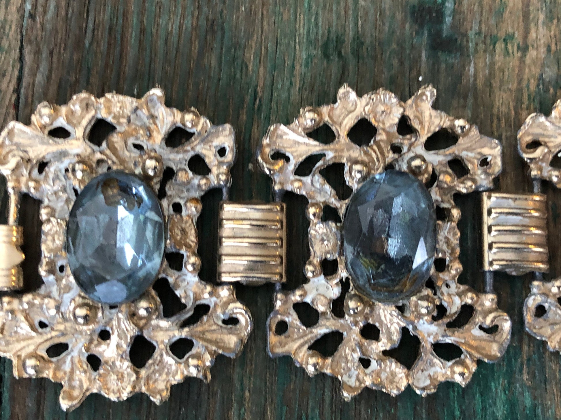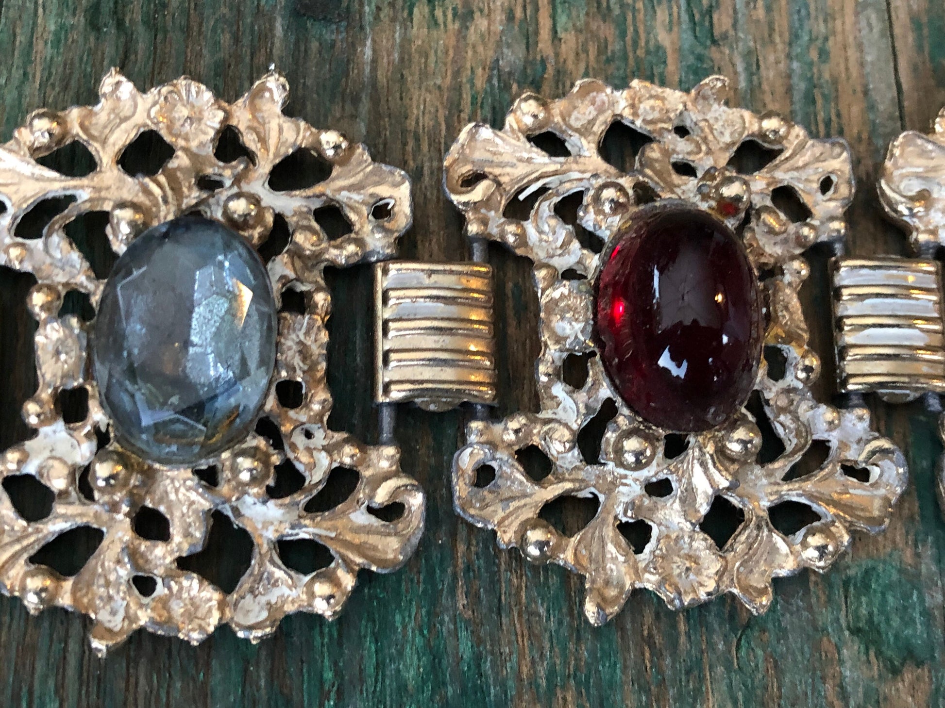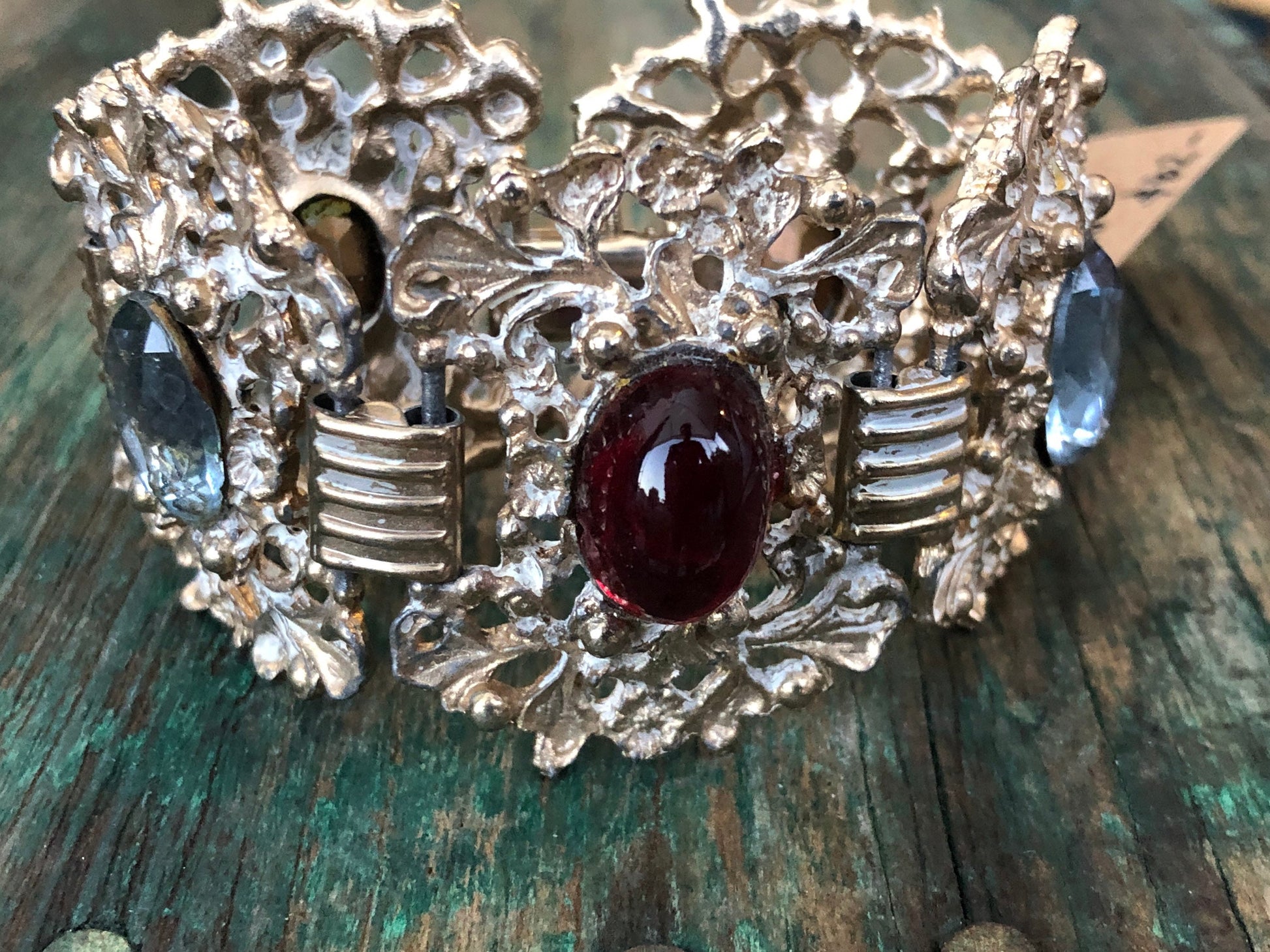 Beautiful bright gold floral, flourish, Rococo style chunky panels with blue faceted crystals and a red art glass in the center panel. Connected with book chain links and a fold over clasp. In amazing condition, no damage or condition issues.